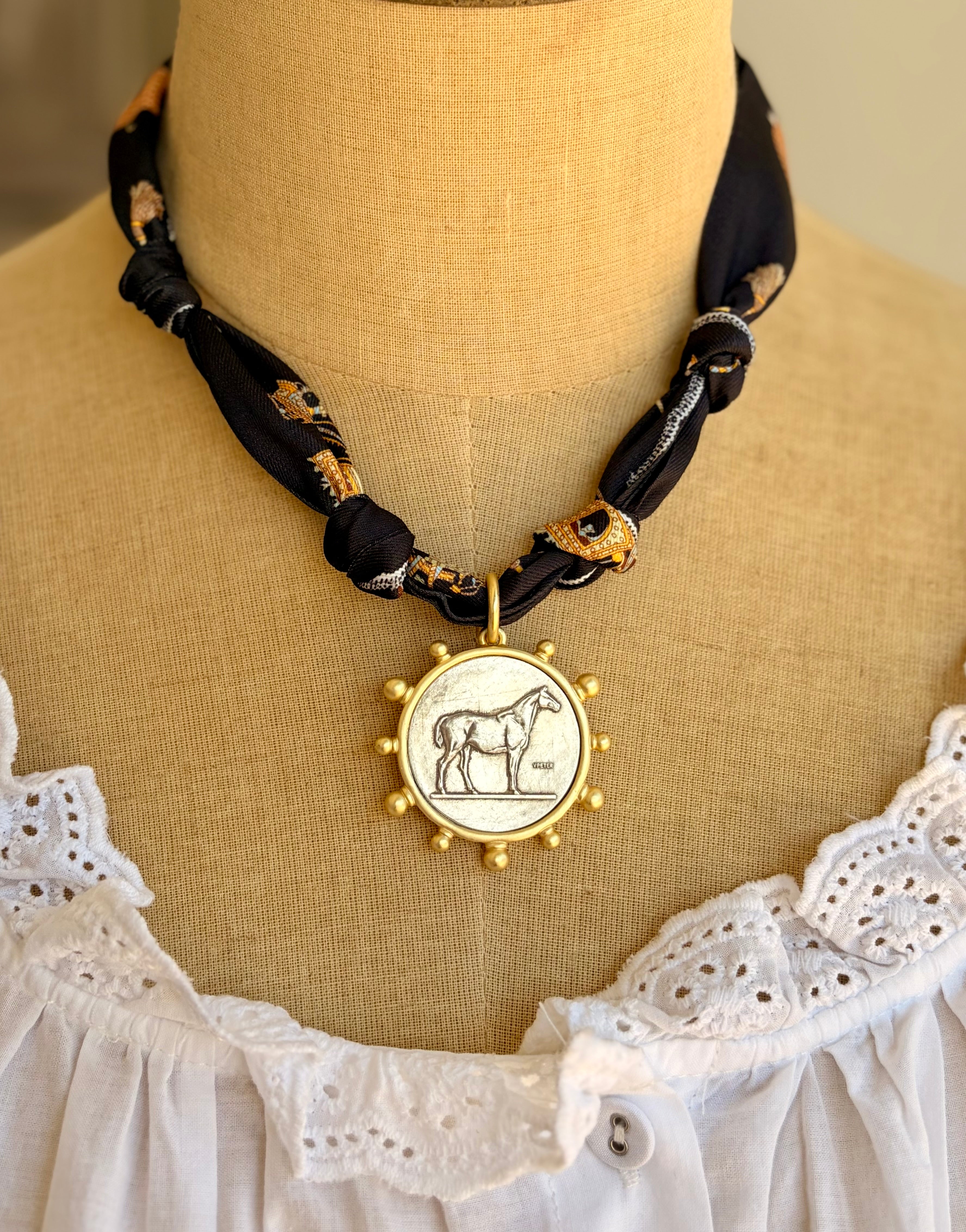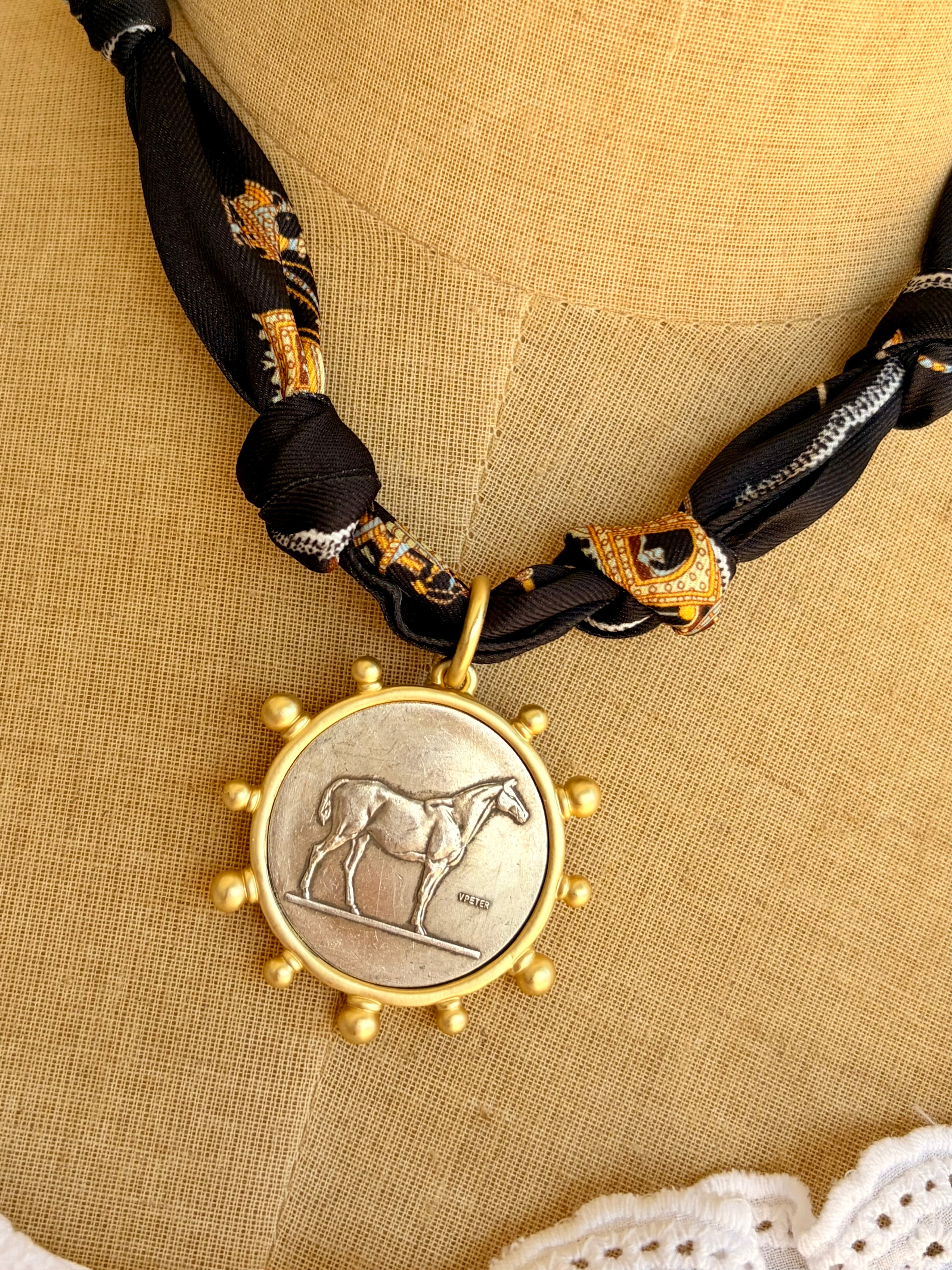 French Coin Necklace outlined in a Matte Gold Bezel set upon a self-tie adjustable scarf. The pendant may be removed and attached to mix and match with other chains and scarves. Zinc Alloy & Brass. Lead & Nickel-Free.