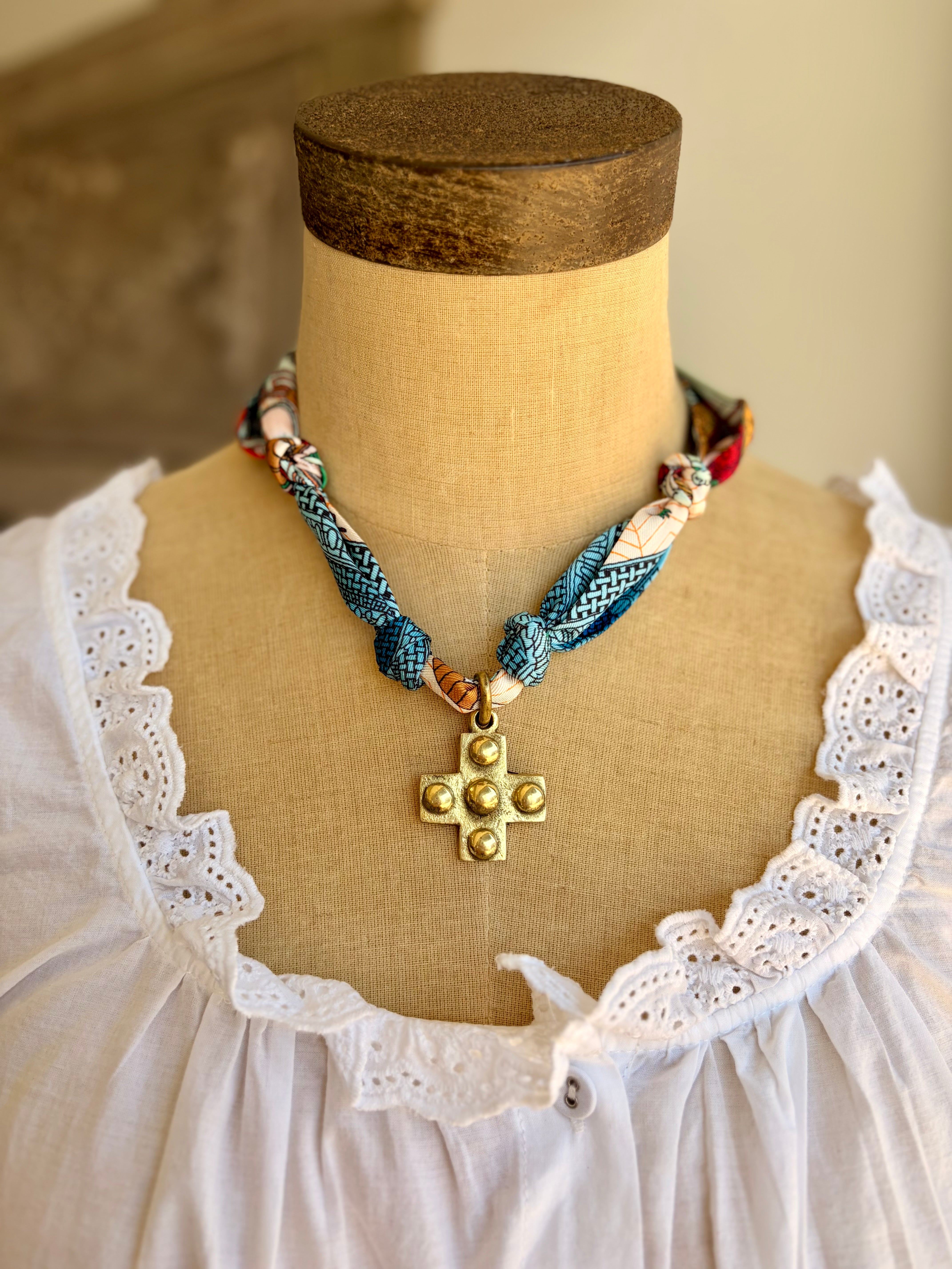Vintage charm meets effortless versatility in this statement scarf necklace. Featuring a printed scarf strand paired with a substantial solid brass square cross pendant, this piece blends old-world character with modern styling. The removable cross charm showcases raised dot detailing with a dark patina finish for beautifully aged appeal, allowing you to easily interchange it with other scarves, chains, or favorite pendants for endless styling options. Wear it as a bold standalone piece or customize it to fit your look.