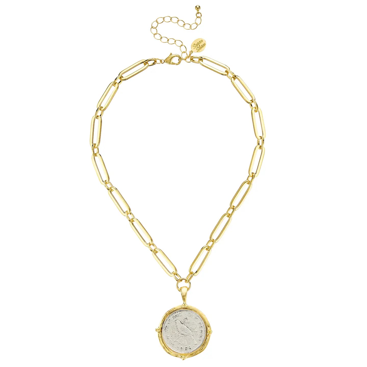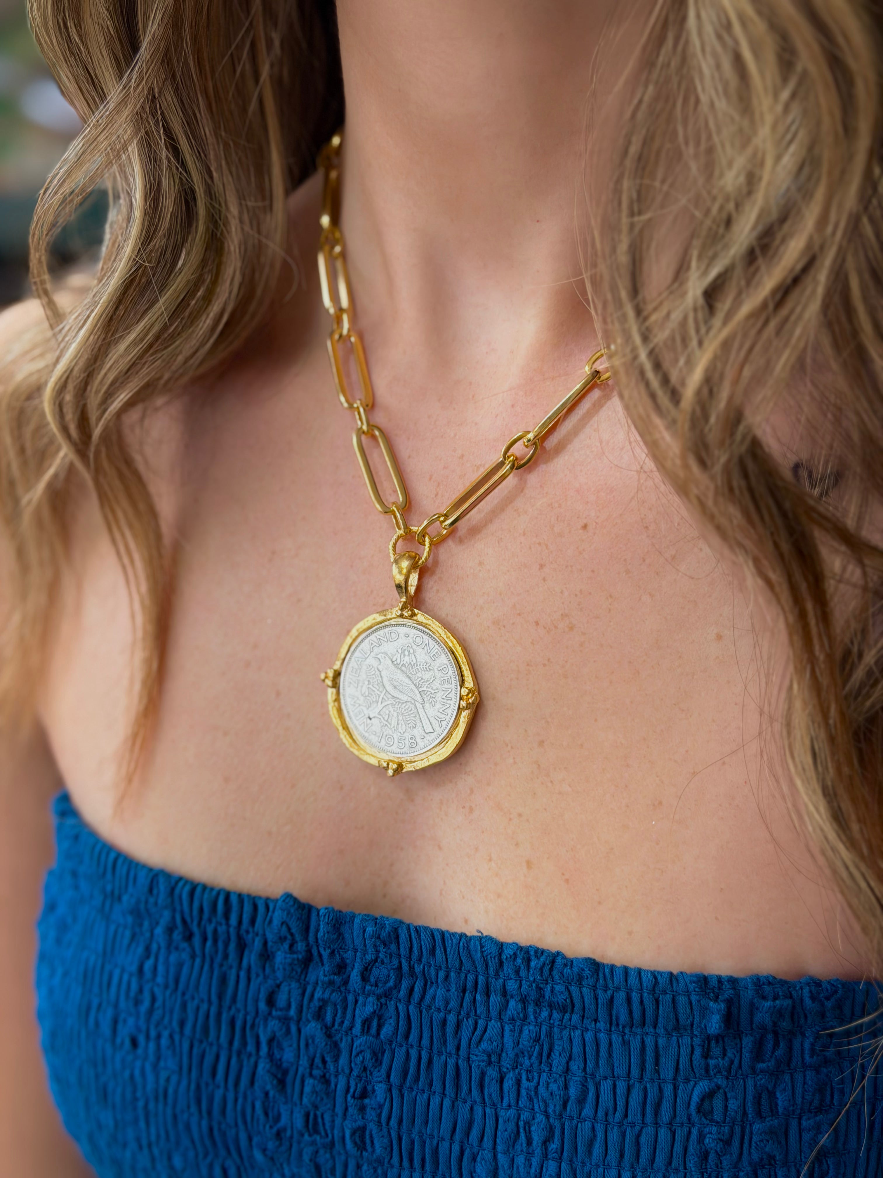This striking necklace features the design of a 1958 coin from the island nation of New Zealand in Oceania. Depicting a native bird in beautiful detail with head-turning mixed metals, the New Zealand Mixed Link Paperclip Necklace is sure to be a new staple in your jewelry box.