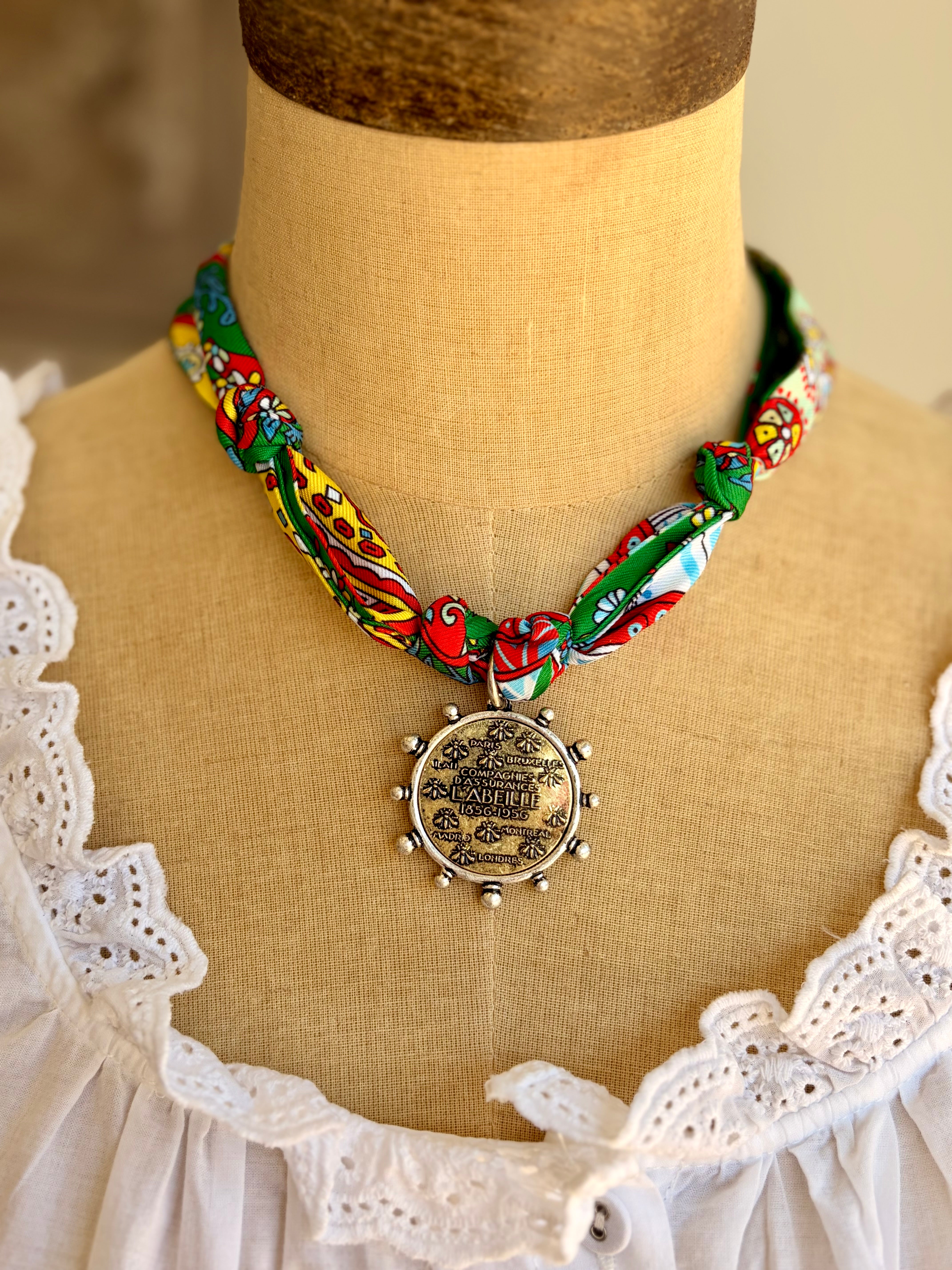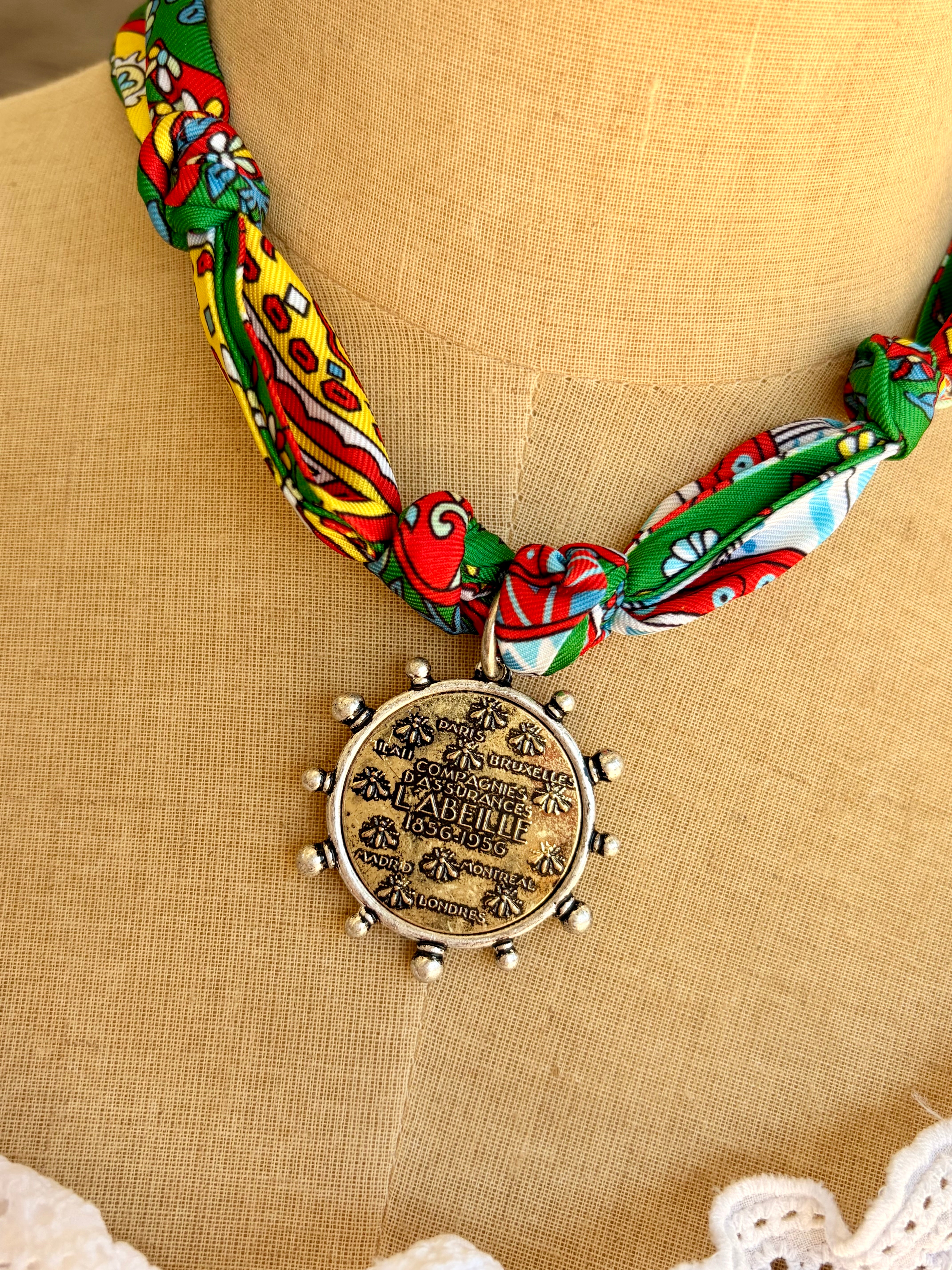French Coin Necklace in Burnished Gold outlined in a Silver Bezel set upon a self-tie adjustable scarf. The pendant may be removed and attached to mix and match with other chains and scarves. Zinc Alloy & Brass. Lead & Nickel-Free.