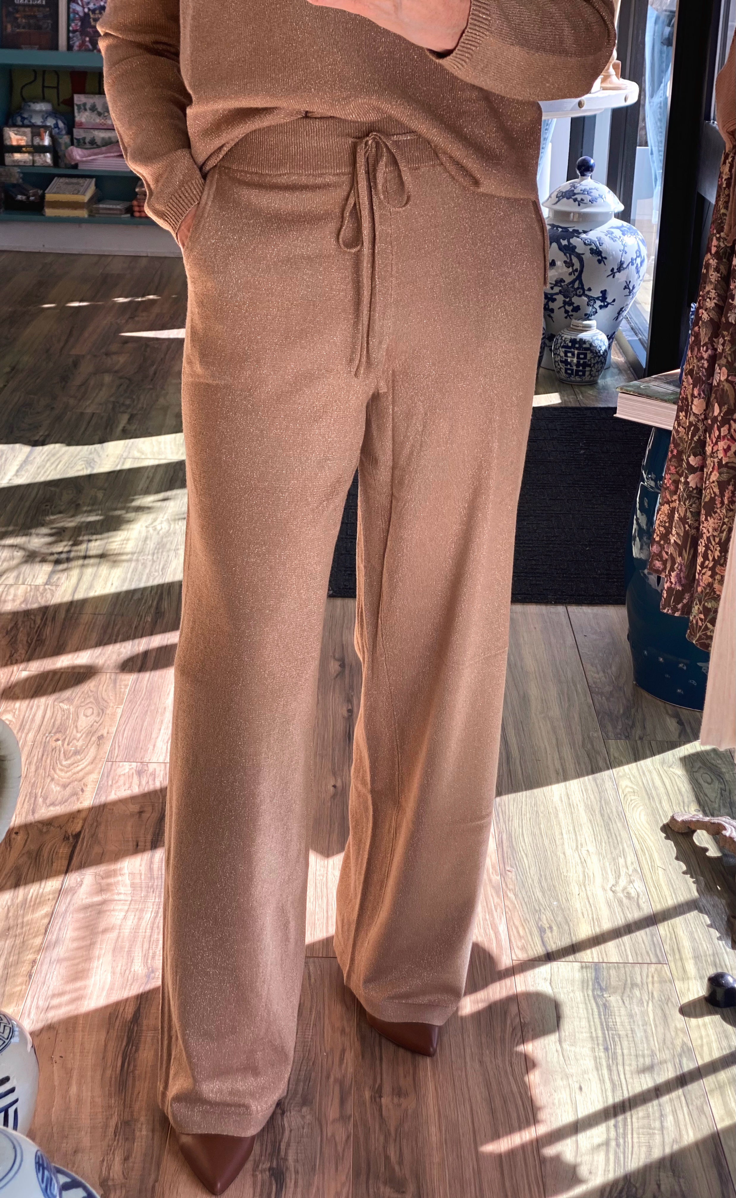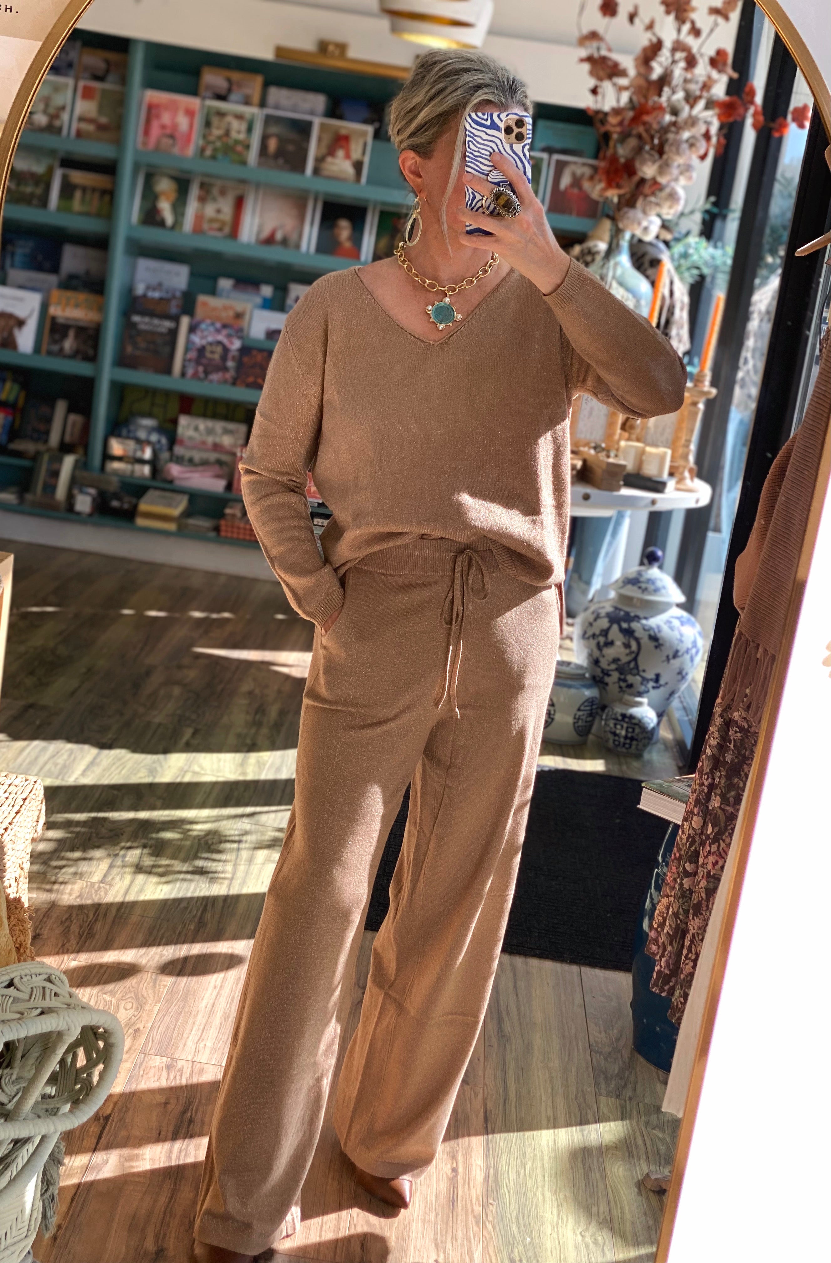 Cut with a relaxed wide leg for a flattering, elongated look, these pants pair just as easily with heels and a sleek top for an evening out as they do with sneakers or the matching sweater for a chic, cozy set. A perfect blend of luxe and laid-back style—ideal for holidays, events, or simply feeling fabulous any day of the week.