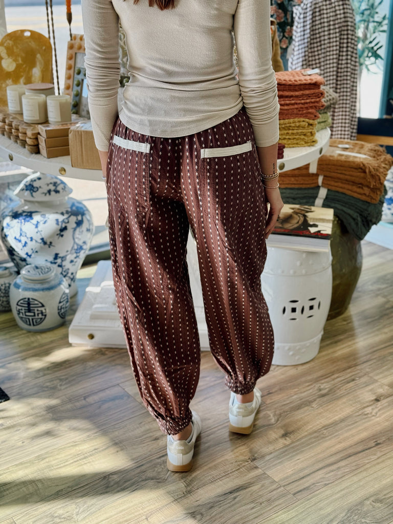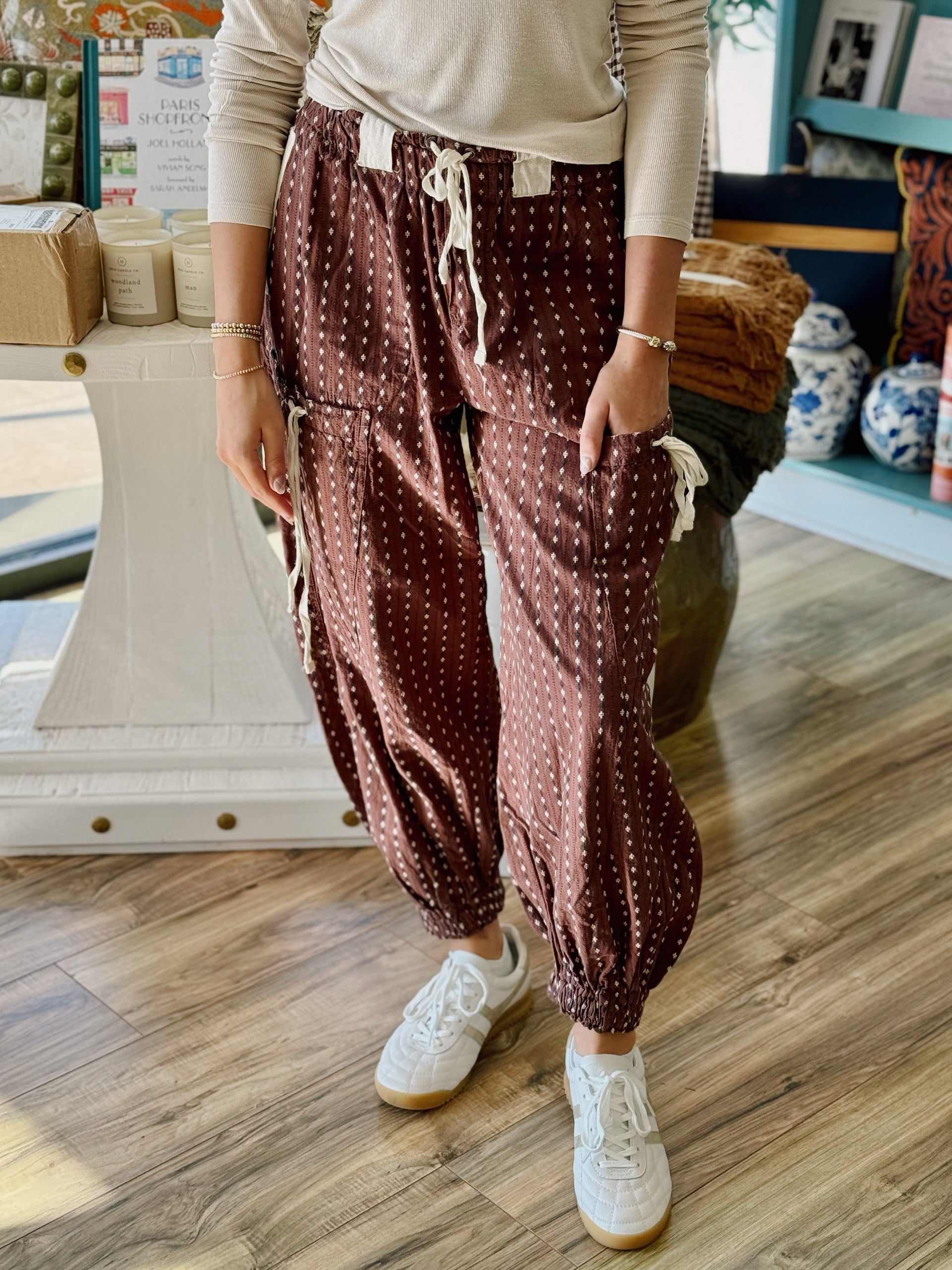 Upgrade your wardrobe with our Kieko Pants. Made of soft cotton poplin, these pants are not only cute but also practical with side pockets. The chocolate color with vanilla Swiss dots adds a touch of uniqueness. The cinched ankles and drawstring front provide a comfortable fit. Perfect for any occasion.