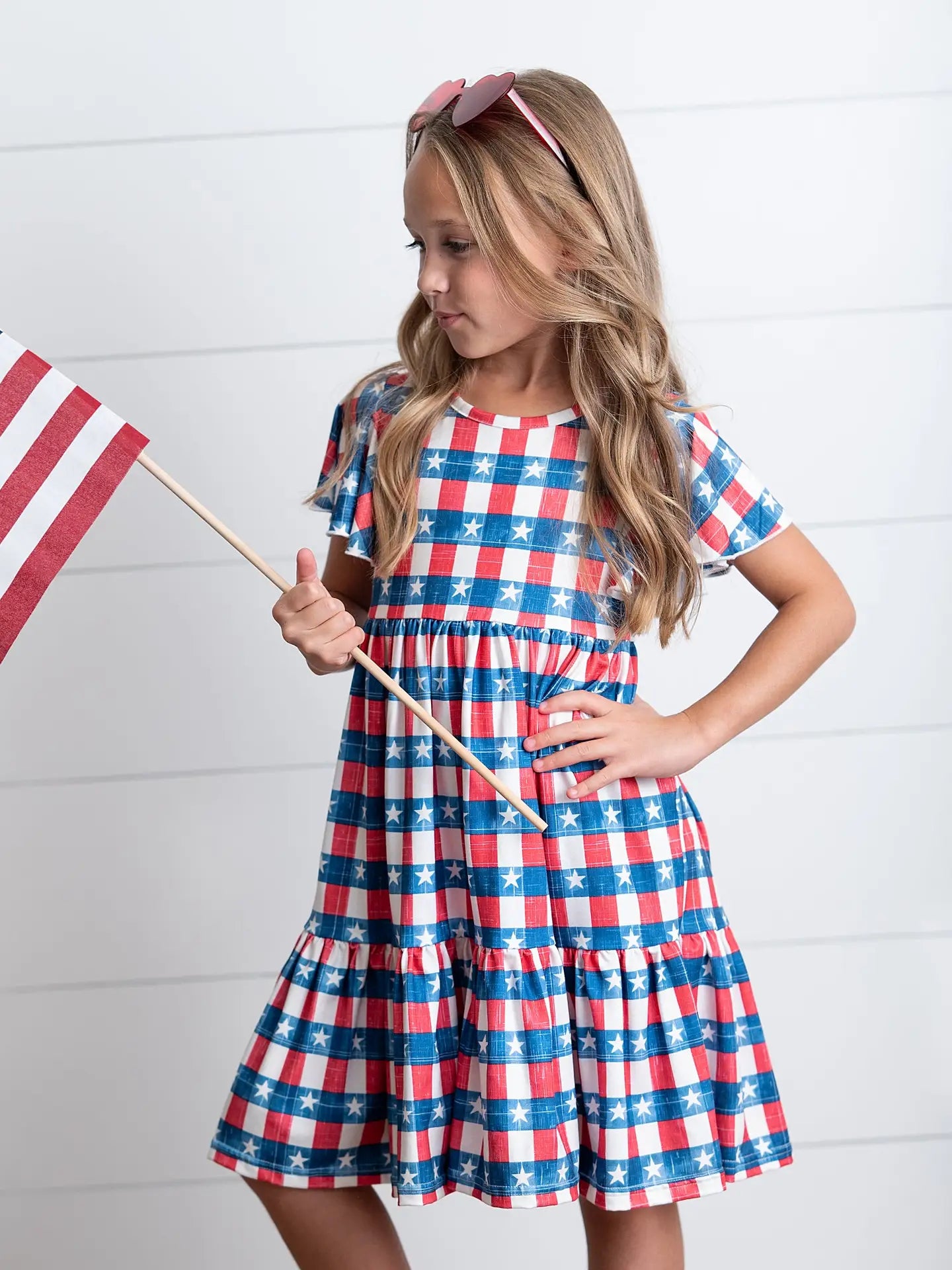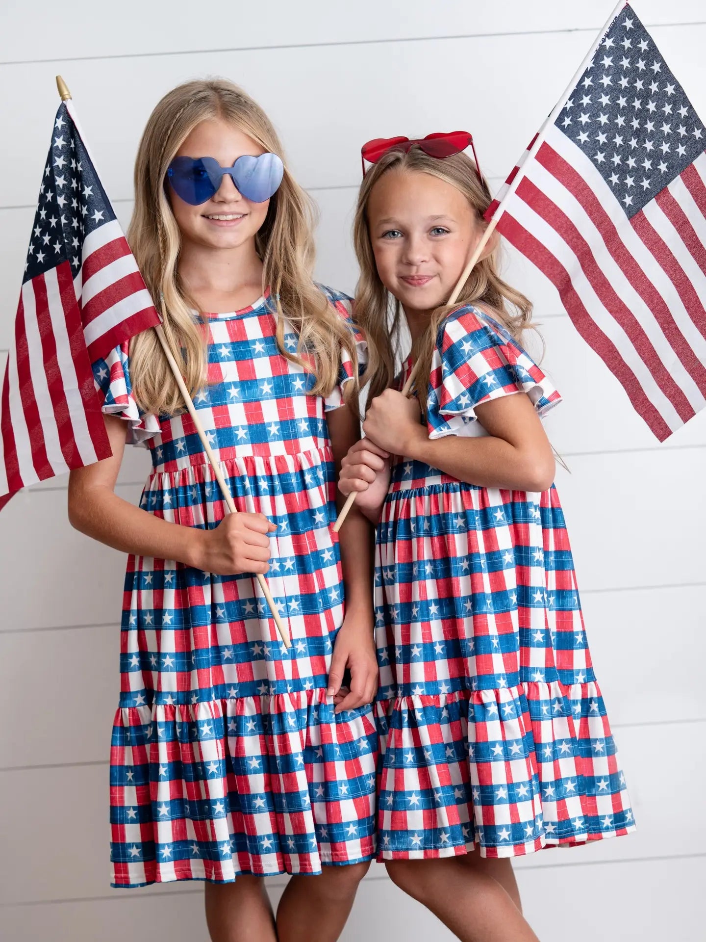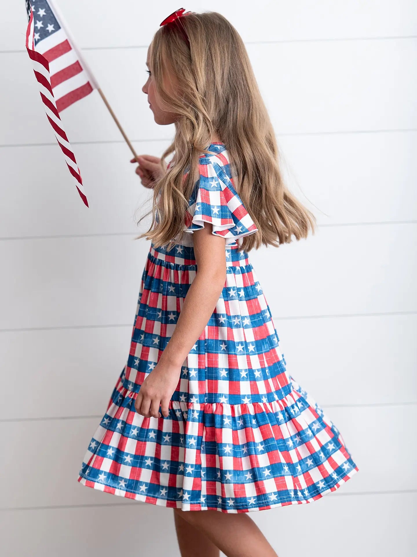 Let your little one celebrate in style with this adorable flutter sleeve twirl dress! Featuring vibrant red, white, and blue striped fabric adorned with cheerful stars, it's perfect for Independence Day festivities, summer outings, or any patriotic occasion. The fluttery sleeves add a whimsical touch while the twirl-worthy silhouette keeps her twirling all day long. Comfortable and festive, this dress is an instant favorite for spring and summer adventures.