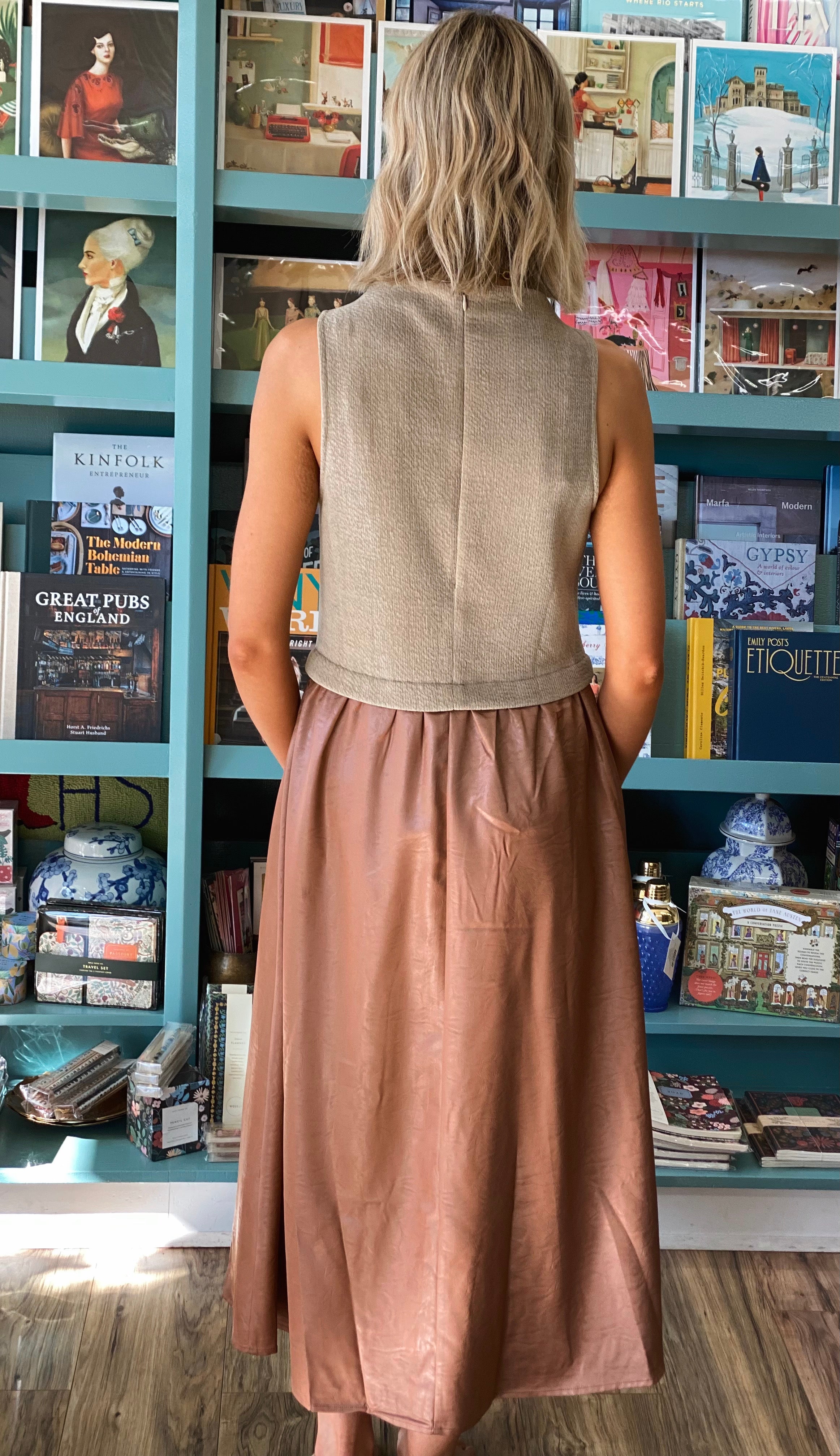 - Faux leather skirt with subtle sheen