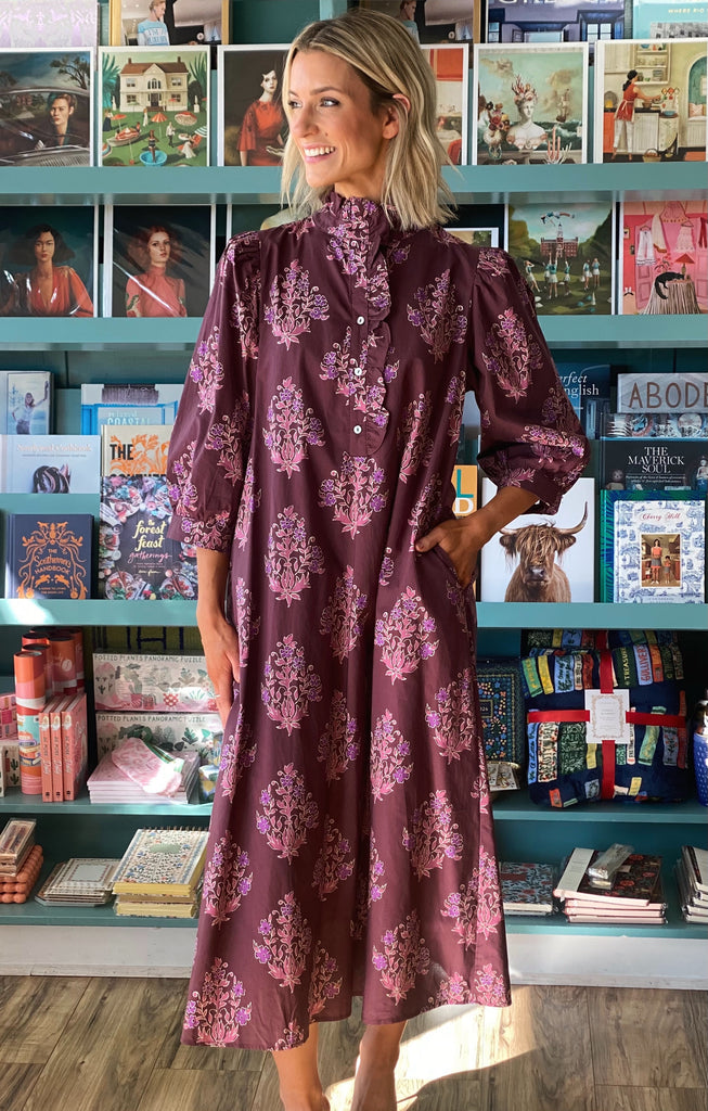 Romantic and refined, this cotton poplin midi dress is a showstopper in rich mulberry tones with a soft floral print. The structured poplin fabric drapes beautifully, giving it an effortlessly elegant shape that flatters every silhouette.
