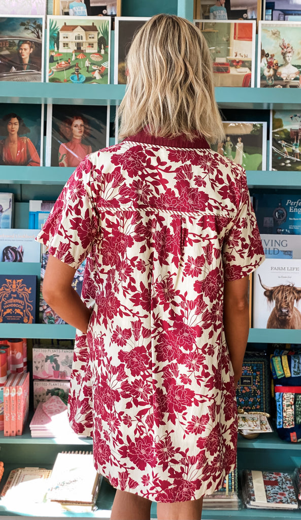 Classic meets modern in this effortless cotton poplin shirt dress — a fresh take on timeless style. The vibrant crimson floral print pops against an ivory backdrop, giving it a bold yet feminine feel that transitions beautifully from day to night.