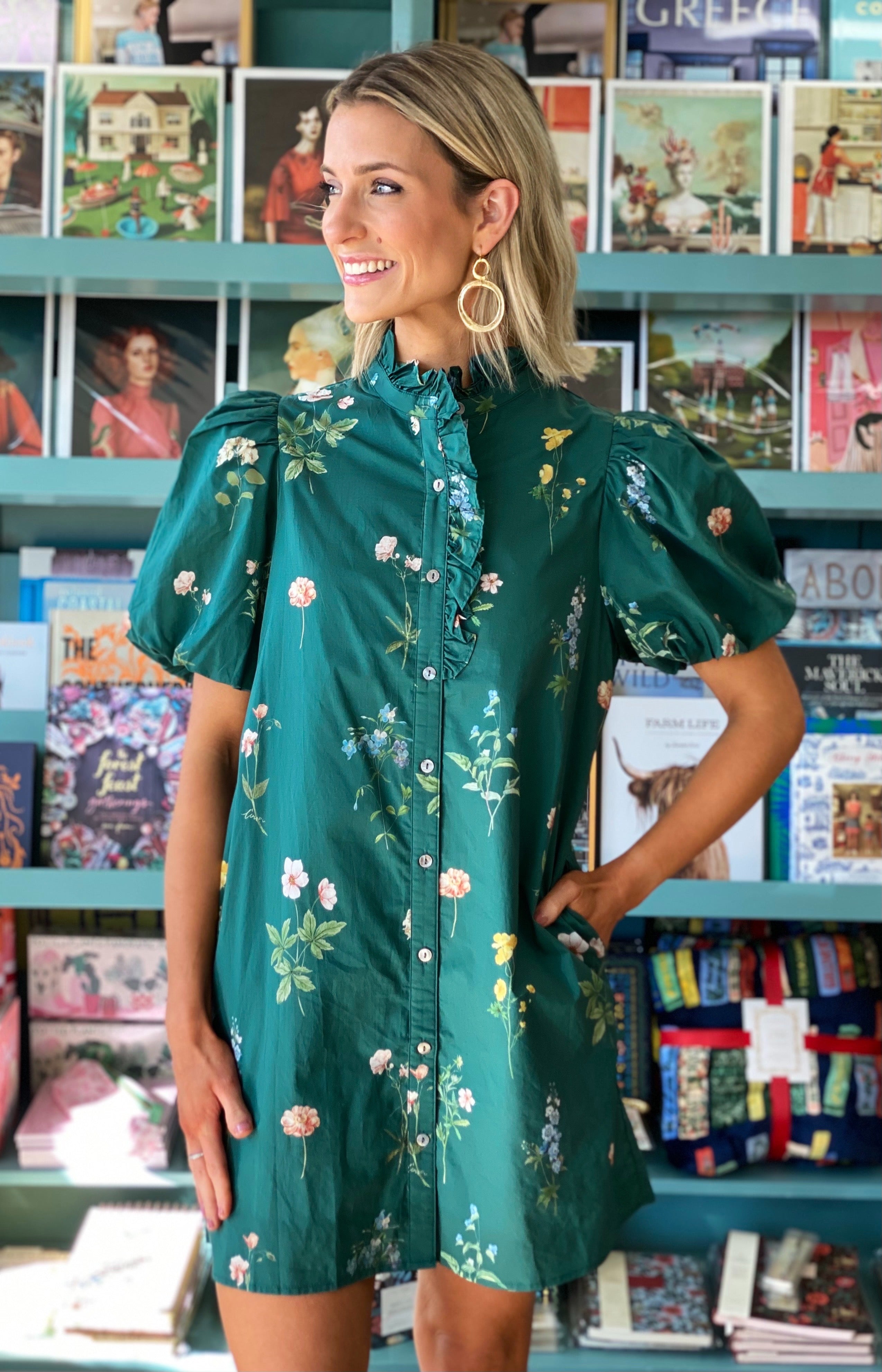 Crafted from crisp cotton poplin, it features a button-up front, ruffled neckline, and puff sleeves that add just the right touch of volume. Side pockets lend a practical finish, making it as wearable as it is pretty.