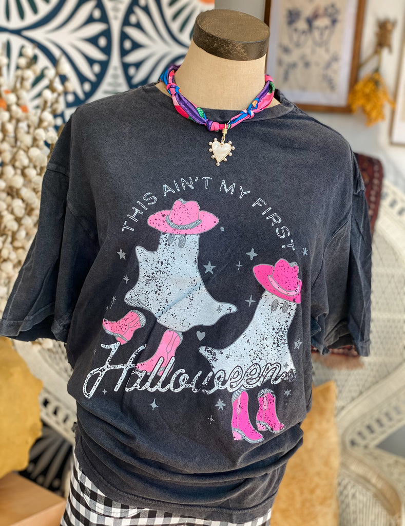 Show off your spooky-season spirit with a little western flair! This washed black tee features two adorable cowgirl ghosts in pink hats and boots. Perfect for layering over a floral or mesh long sleeve for that trendy fall look. Soft, relaxed fit - cute tucked, tied, or oversized for cozy vibes.