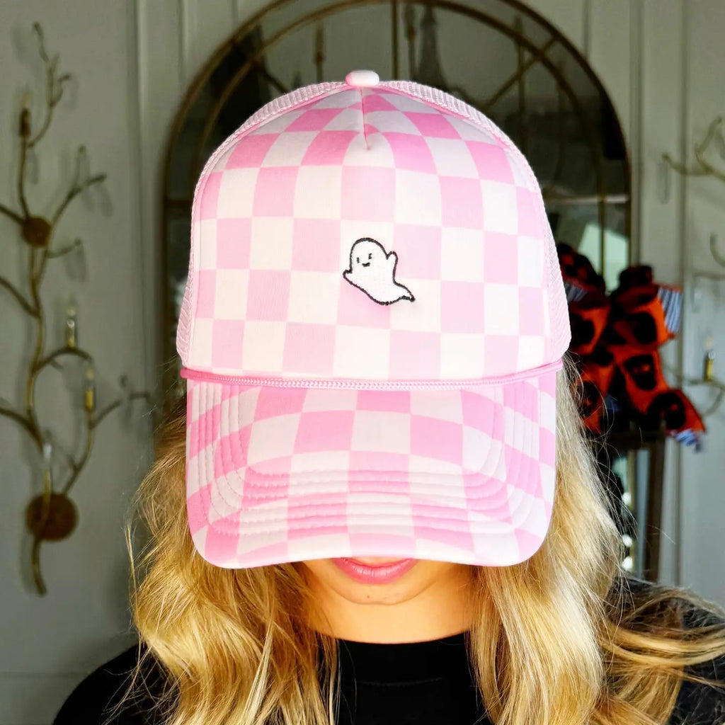 Get spooky with our Ghost Pink Checker Trucker Hat! Made with a unique checker pattern and featuring a ghostly pink design, this hat is perfect for all your Halloween festivities. Keep your head stylish and protected with our high-quality trucker hat.