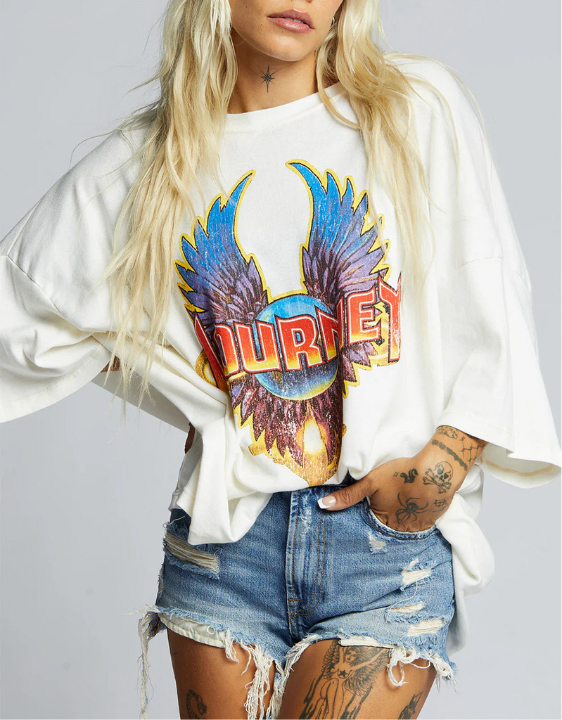 Show off your love for rock and roll in our Journey Classic Logo One Size Tee! Featuring the band's legendary logo, this tee is a tribute to the timeless sound and energy that made Journey a global phenomenon. Perfect for fans who love to blend nostalgia with modern fashion, this piece adds a cool, vintage vibe to any outfit. Our super soft style is made with vintage washed fabric, a ribbed crew neckline, and short sleeves for a relaxed, adaptable fit across various body types.