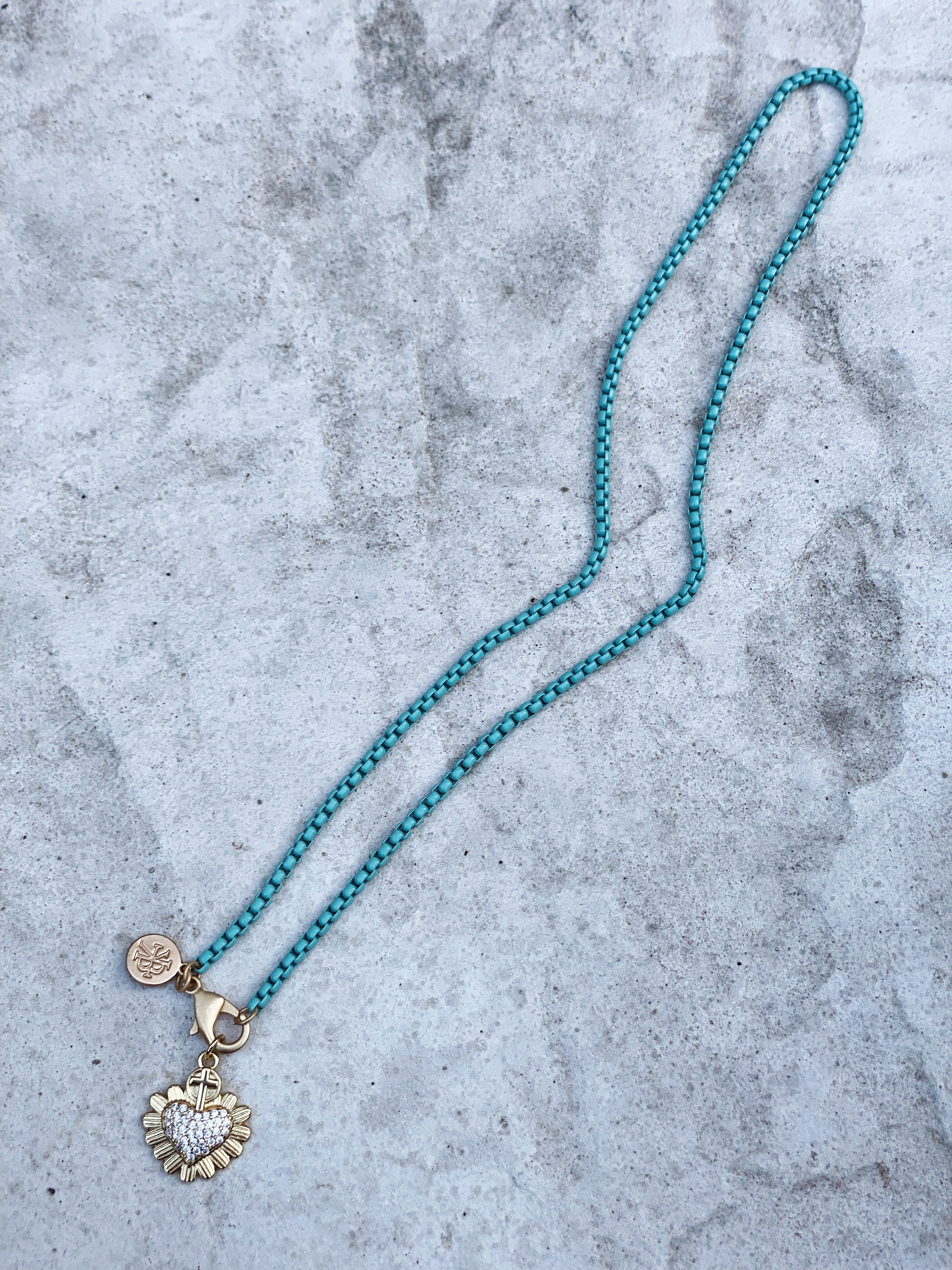 Gold Heart Charm set upon an Aqua Enamel Chain with a Matte Gold Lobster Clasp. 16” chain.