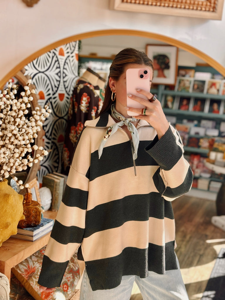Cozy meets casual in this effortlessly cool McKenna pullover. Designed with bold horizontal stripes and a relaxed fit, it’s perfect for lounging in or dressing up and going out. The half-zip neckline adds a sporty touch, while ribbed cuffs and hem keep it classic. The medium weight of the pullover makes it your go-to choice on a crisp autumn day. Available in charcoal and green, this pullover pairs easily with jeans or leggings for an easy, everyday look.