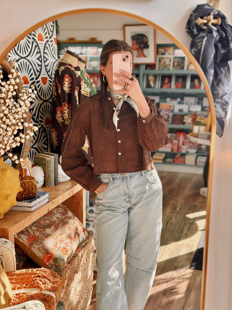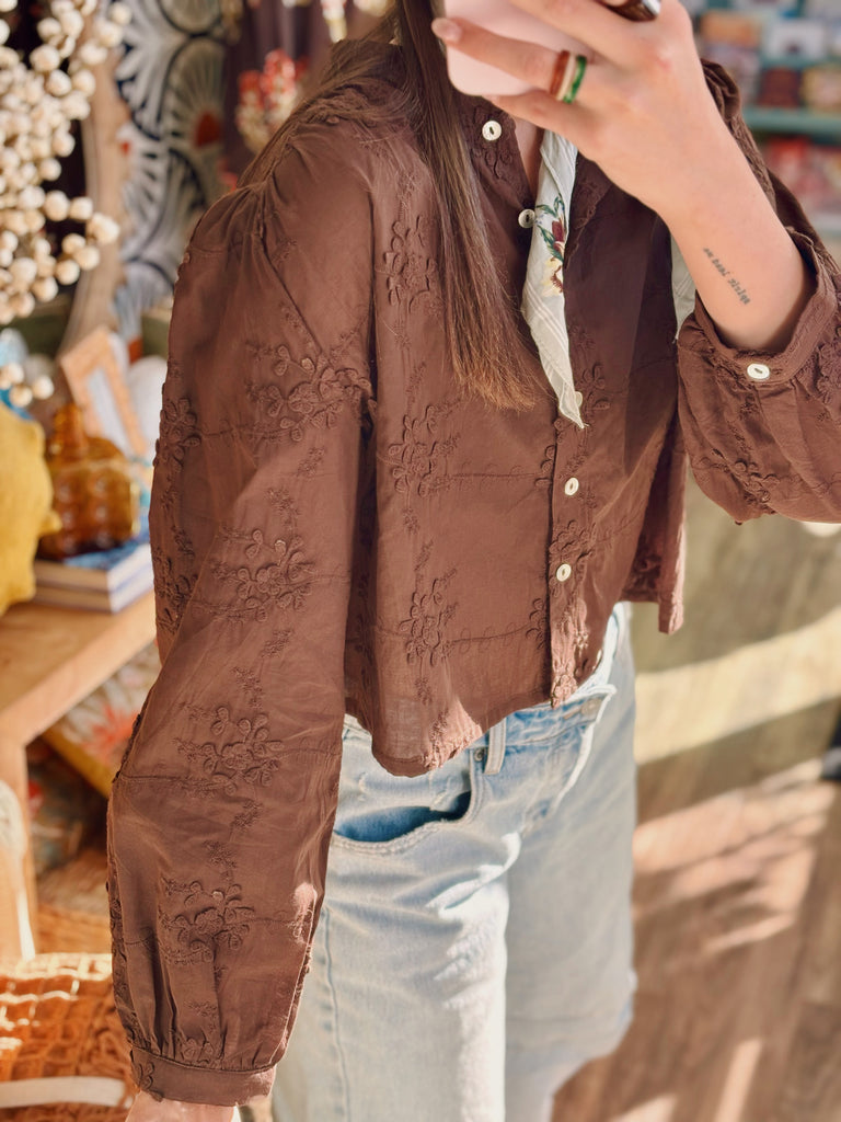Designed in a rich chocolate brown hue, the Prairie Top offers a soft, breathable feel with a touch of vintage-inspired charm. The button-down front and subtle puffed sleeves add feminine detail, while its relaxed fit makes it perfect for pairing with high-waisted jeans and sneakers or mules.