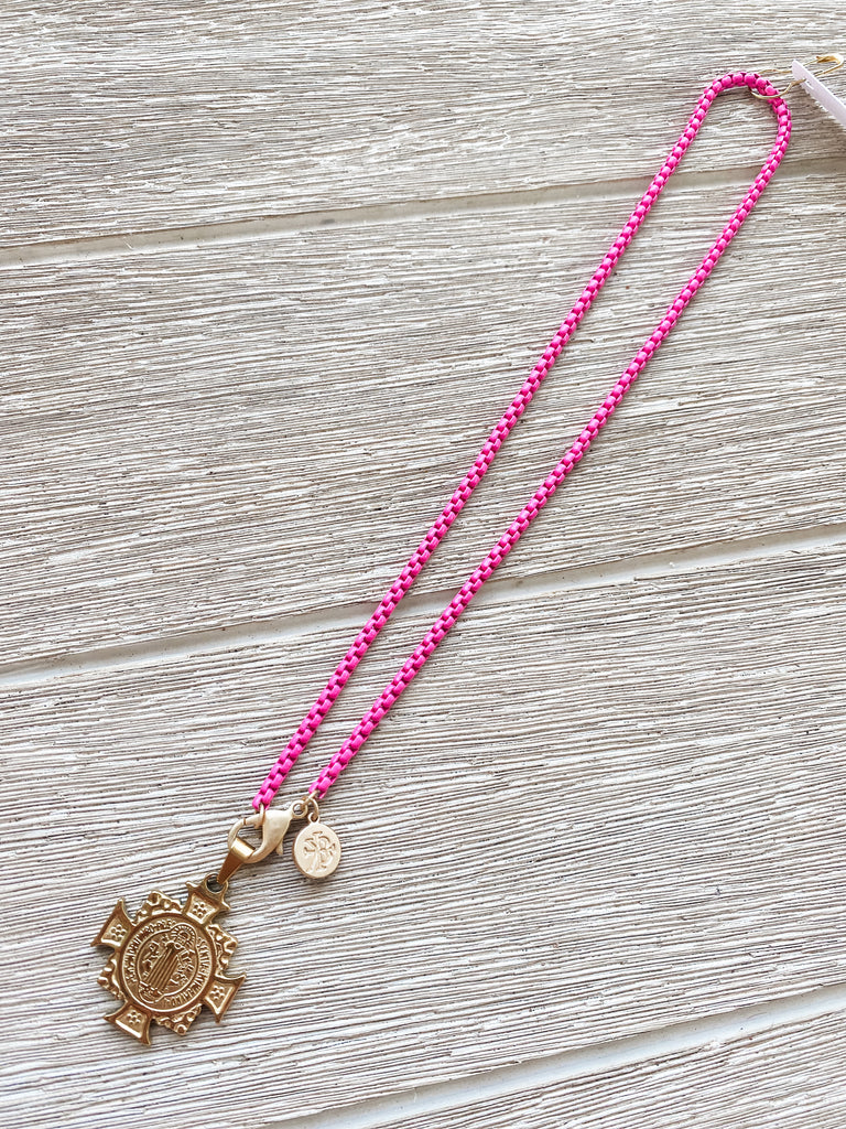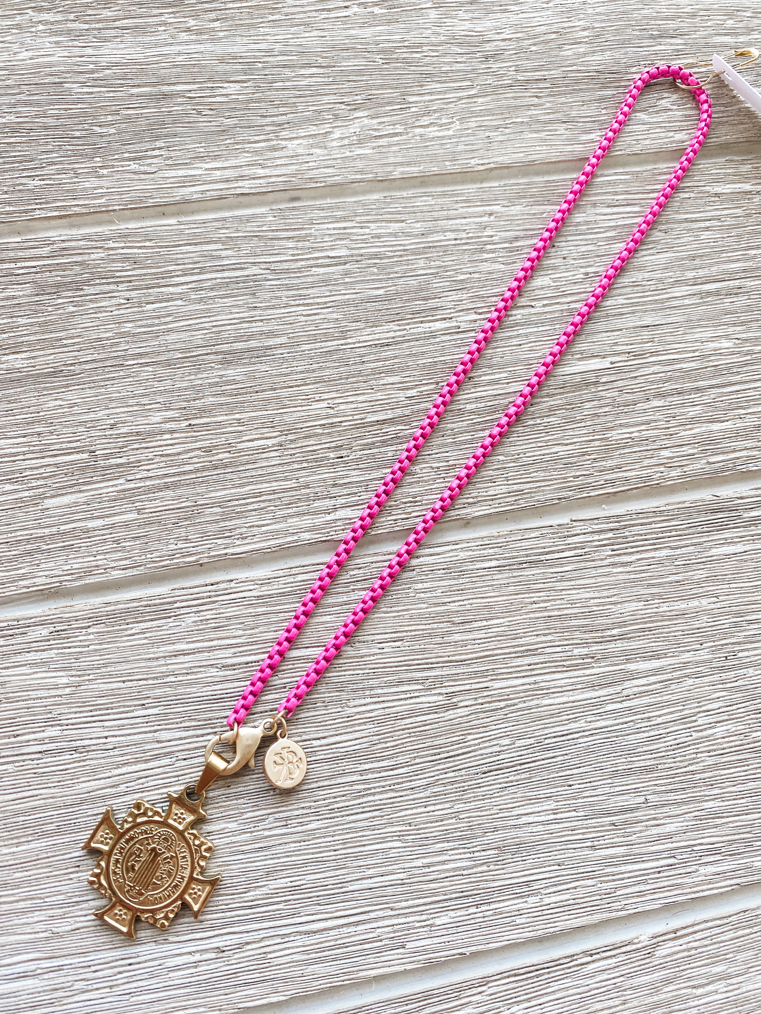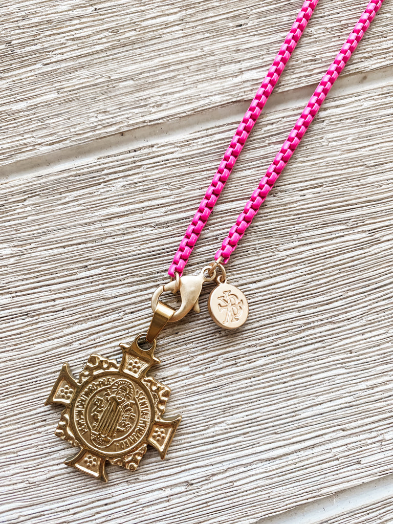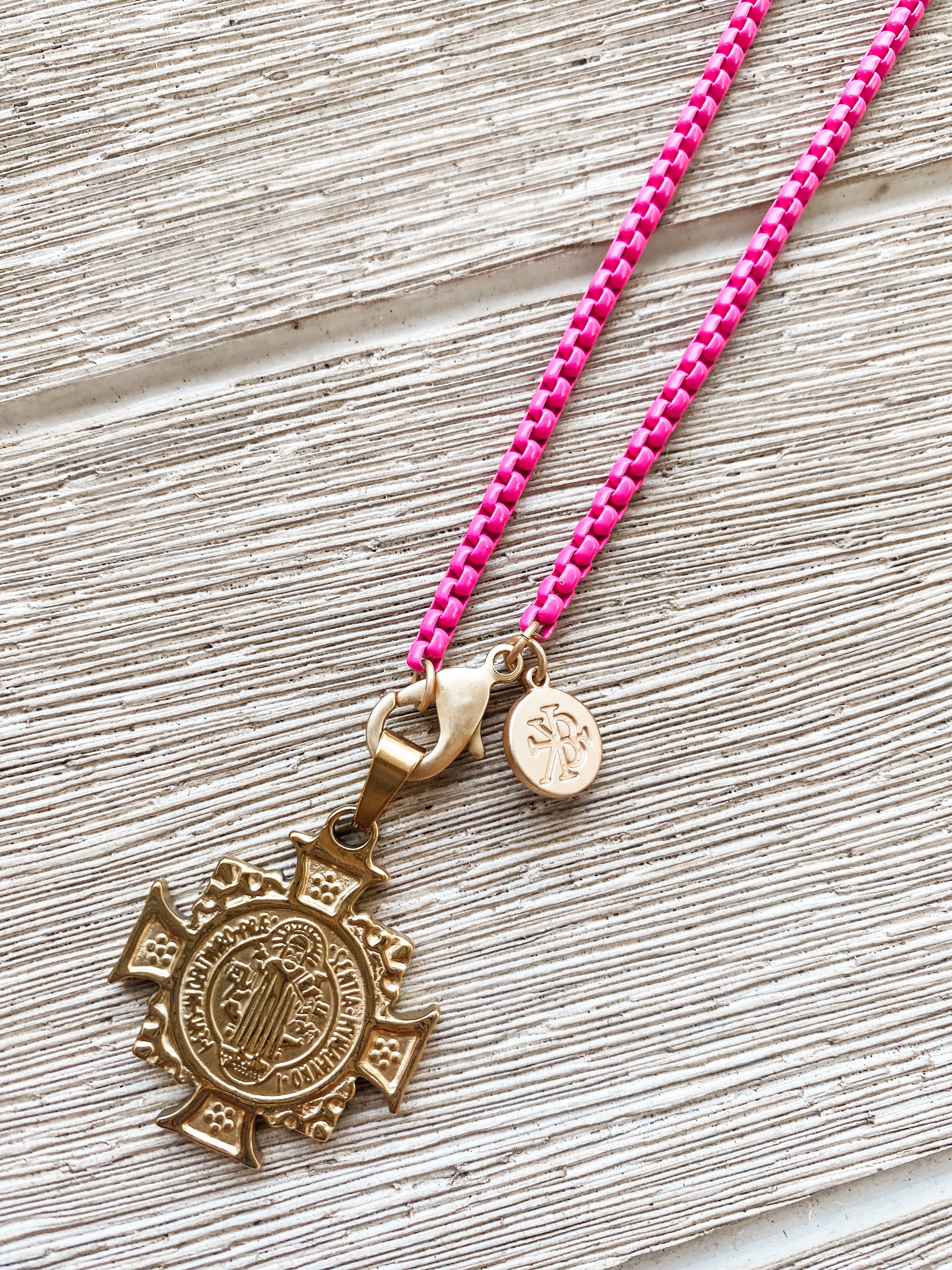 St. Benedict Cross Charm set upon a Deep Pink Enamel Chain with a Matte Gold Lobster Clasp. 18” chain.