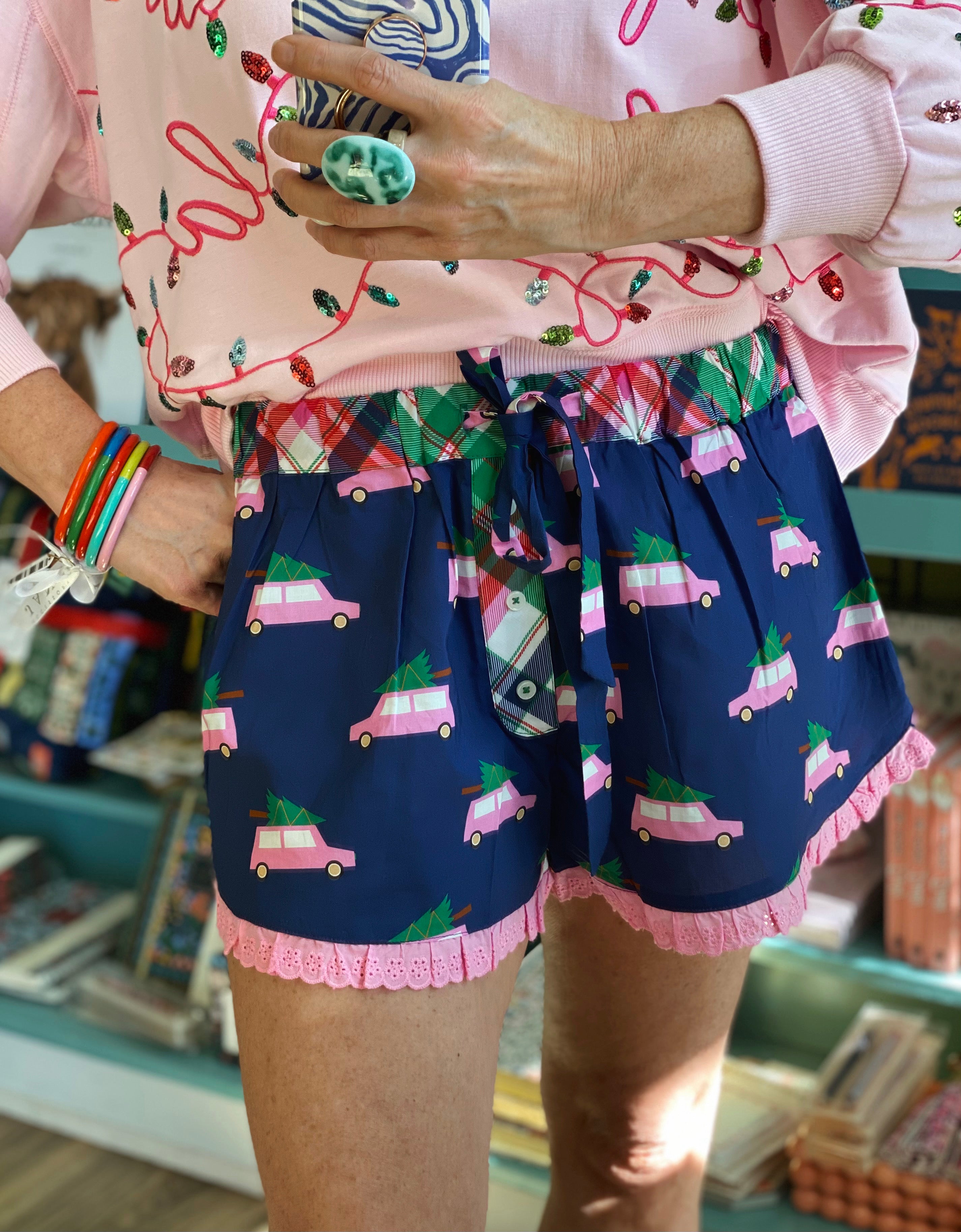 The Pink Car Boxer Shorts bring all the holiday joy with none of the fuss. Featuring a cheerful print of pink cars hauling Christmas trees, these navy shorts are trimmed with pink eyelet lace and topped with a plaid waistband for a charming twist. Cotton.