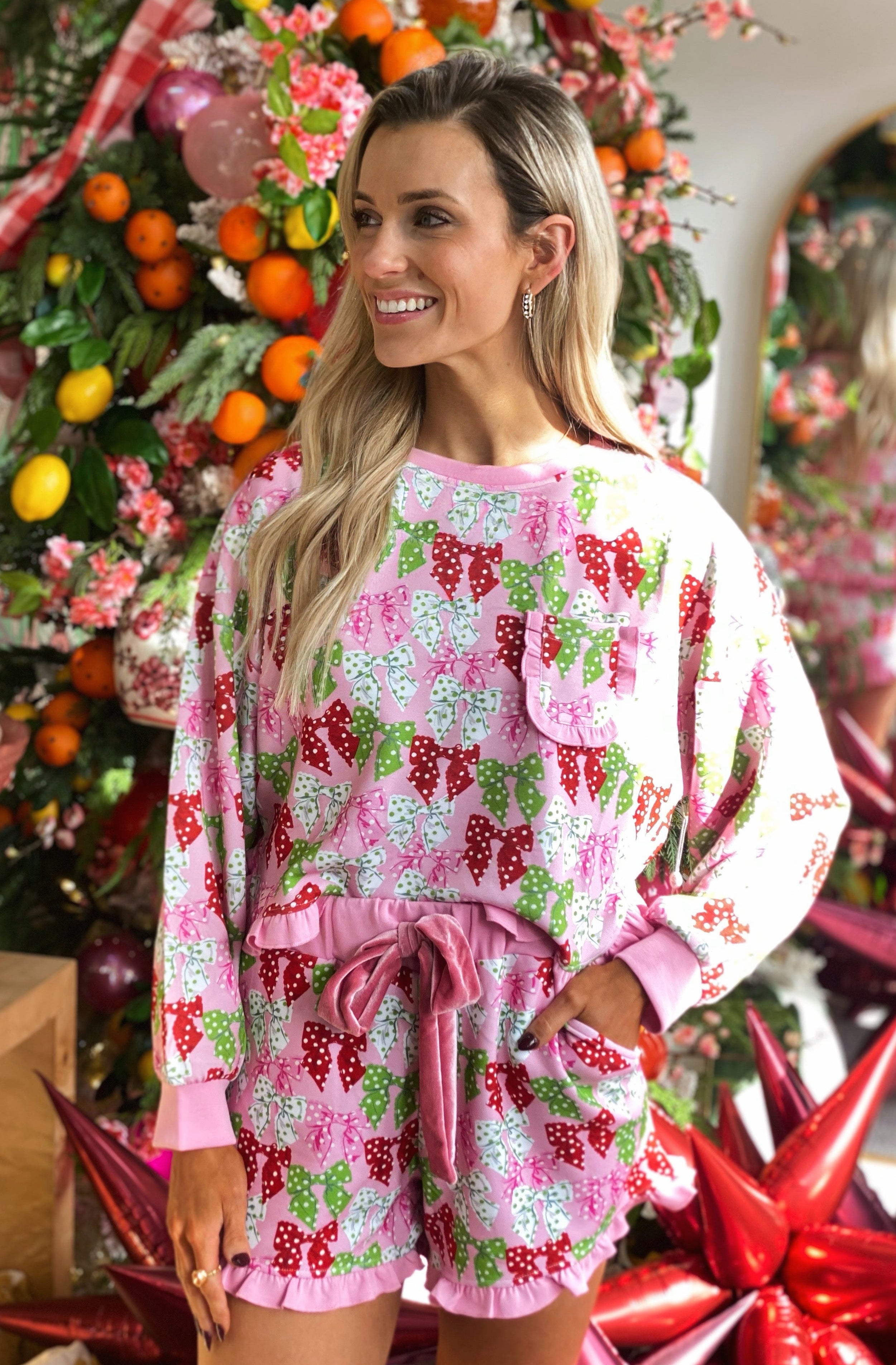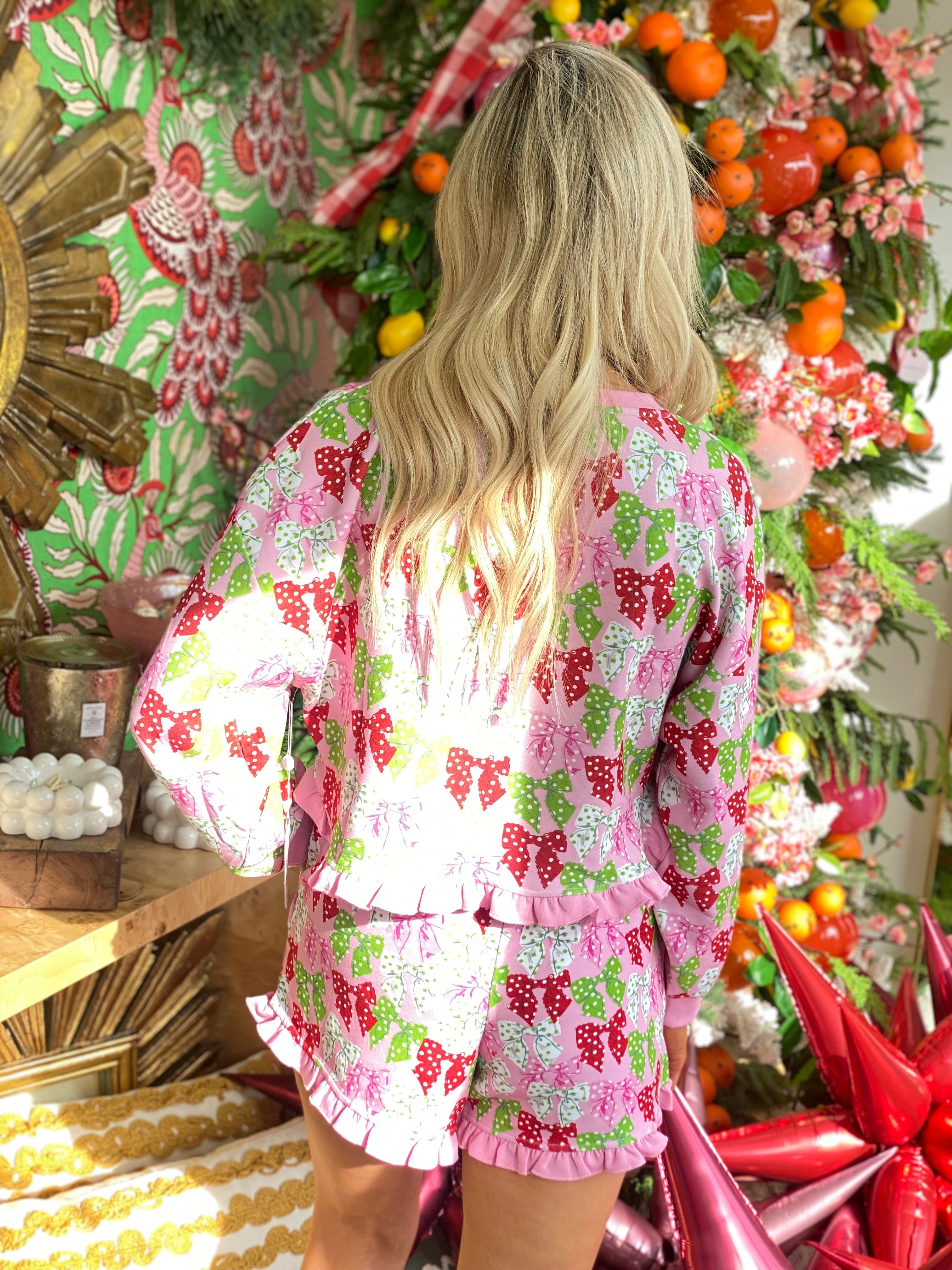 Cozy up in this cute ruffle pajama set. Featuring a crew neck top, with front chest pocket, ruffle hem detail, rib cuffs and neckline. Shorts feature elastic waist with tie, slant pockets, and ruffle hem. Both feature Simply Southern logo. Made of 48% modal 48% polyester 4% spandex.