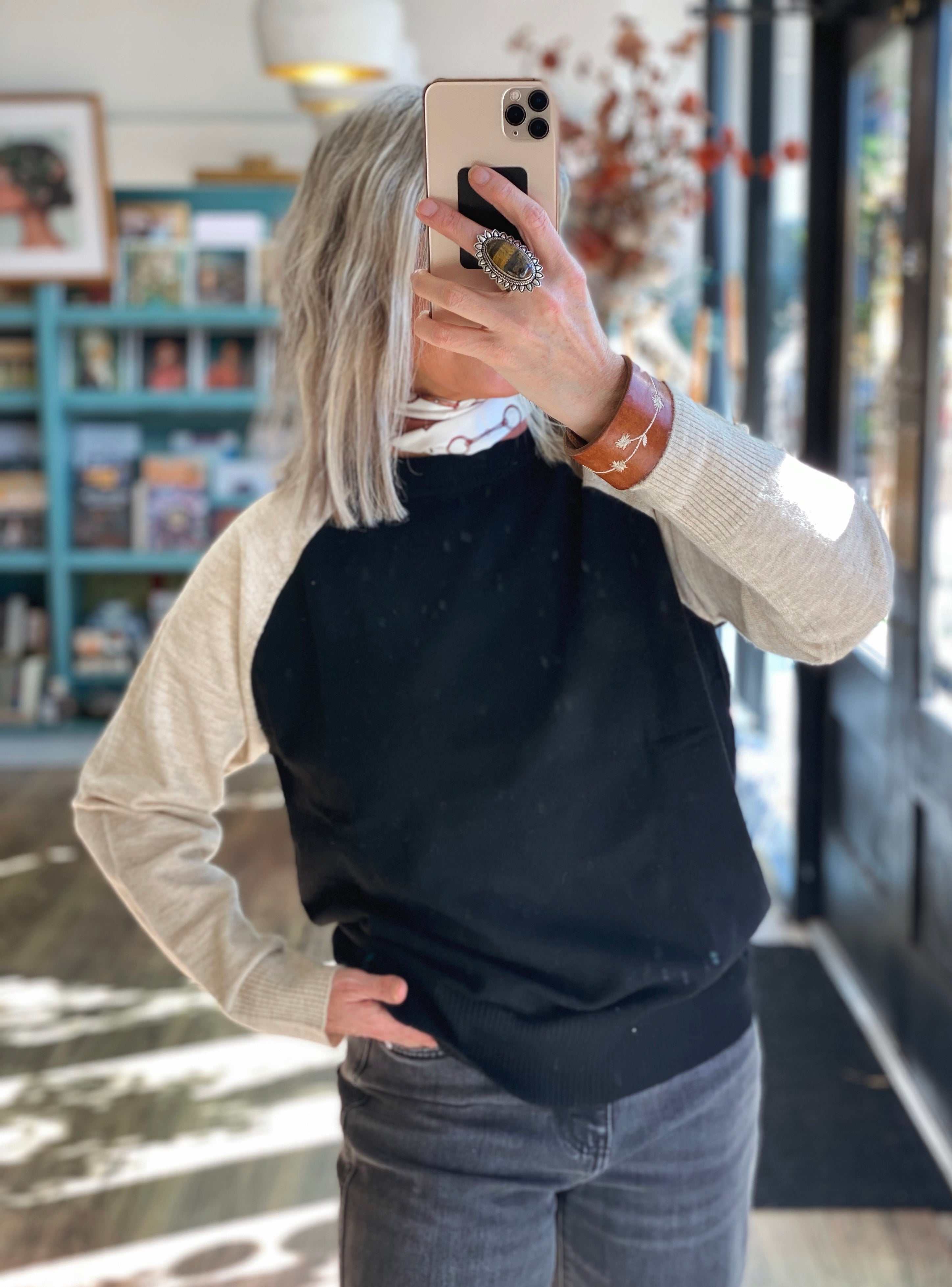 A timeless everyday knit with a sporty-chic twist. This raglan sweater features a soft brushed feel and contrast sleeves that give it a modern, elevated look — casual enough for coffee runs, polished enough for dinner out. The ribbed neckline, cuffs, and hem give it a clean finish, while the relaxed fit makes it easy to layer over tees or style solo.