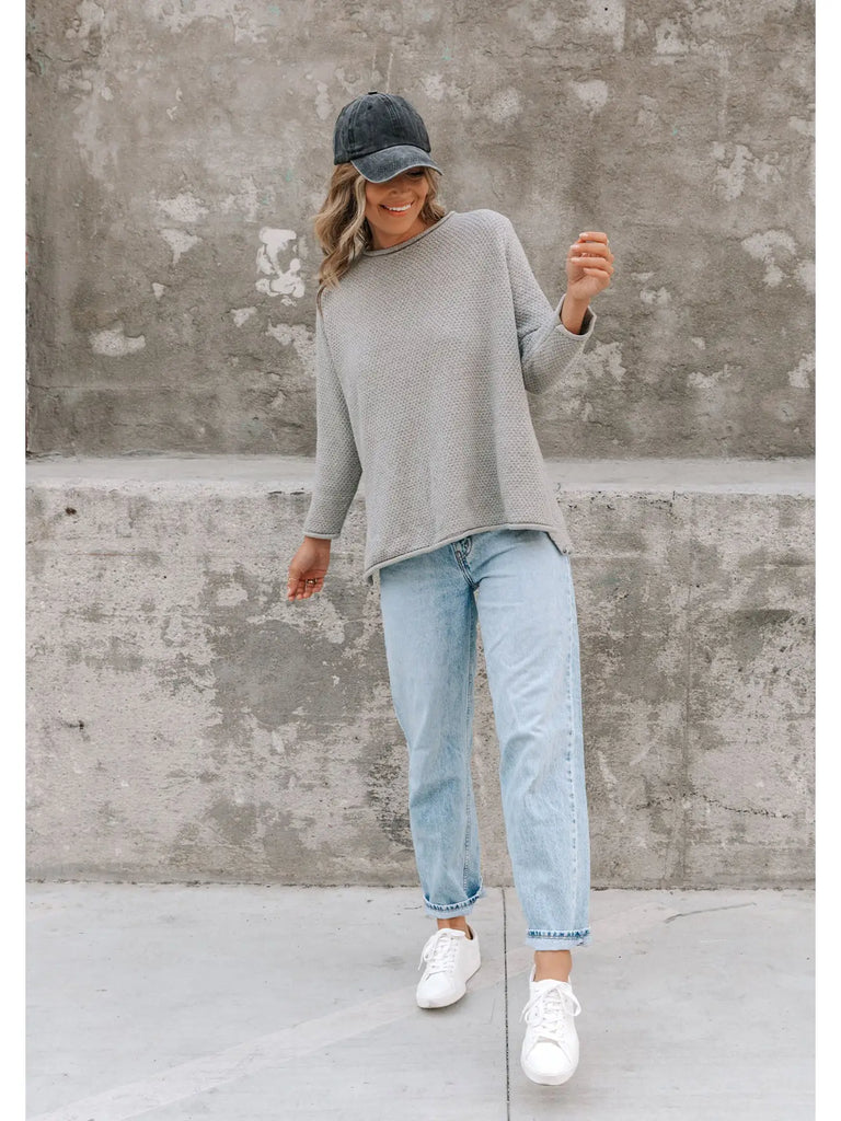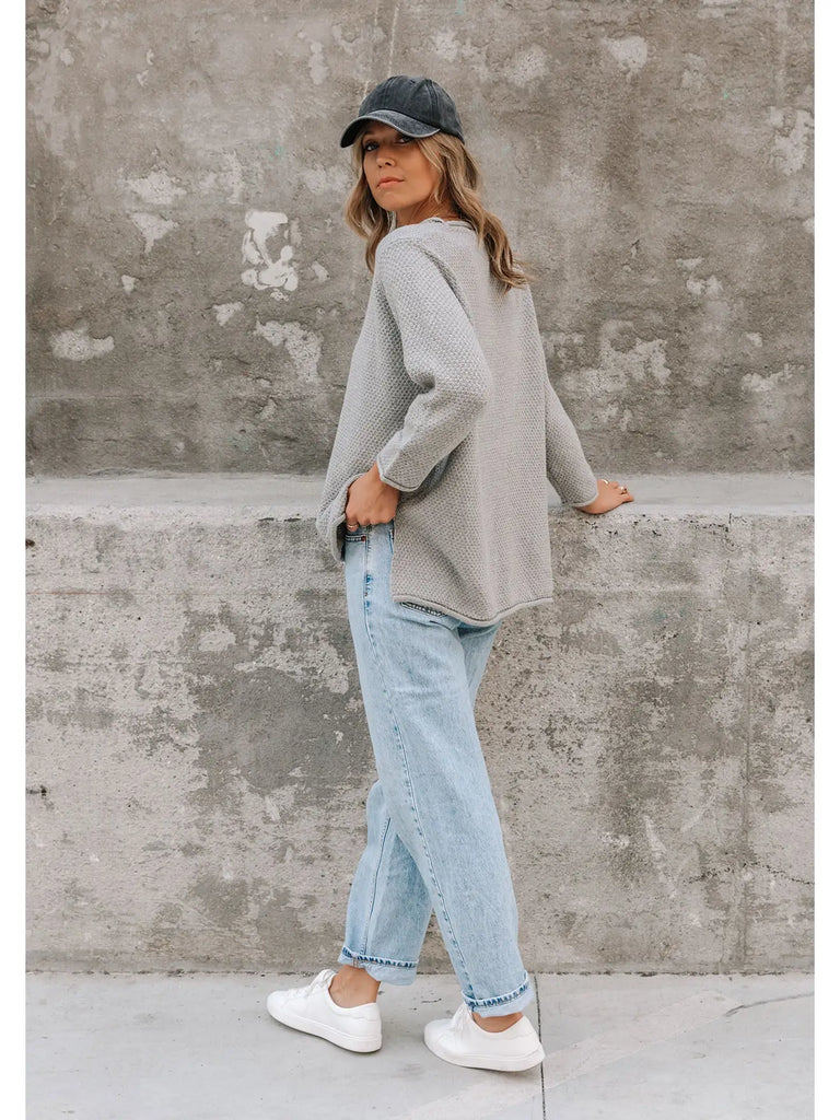 Laid-back and effortlessly cool — this textured knit sweater is the ultimate throw-on-and-go essential. Featuring a relaxed silhouette with a soft rolled neckline, dropped shoulders, and subtle side slits, it’s designed for that perfectly undone, off-duty look. The lightweight waffle texture adds cozy dimension without feeling bulky, making it ideal for layering or wearing solo.
