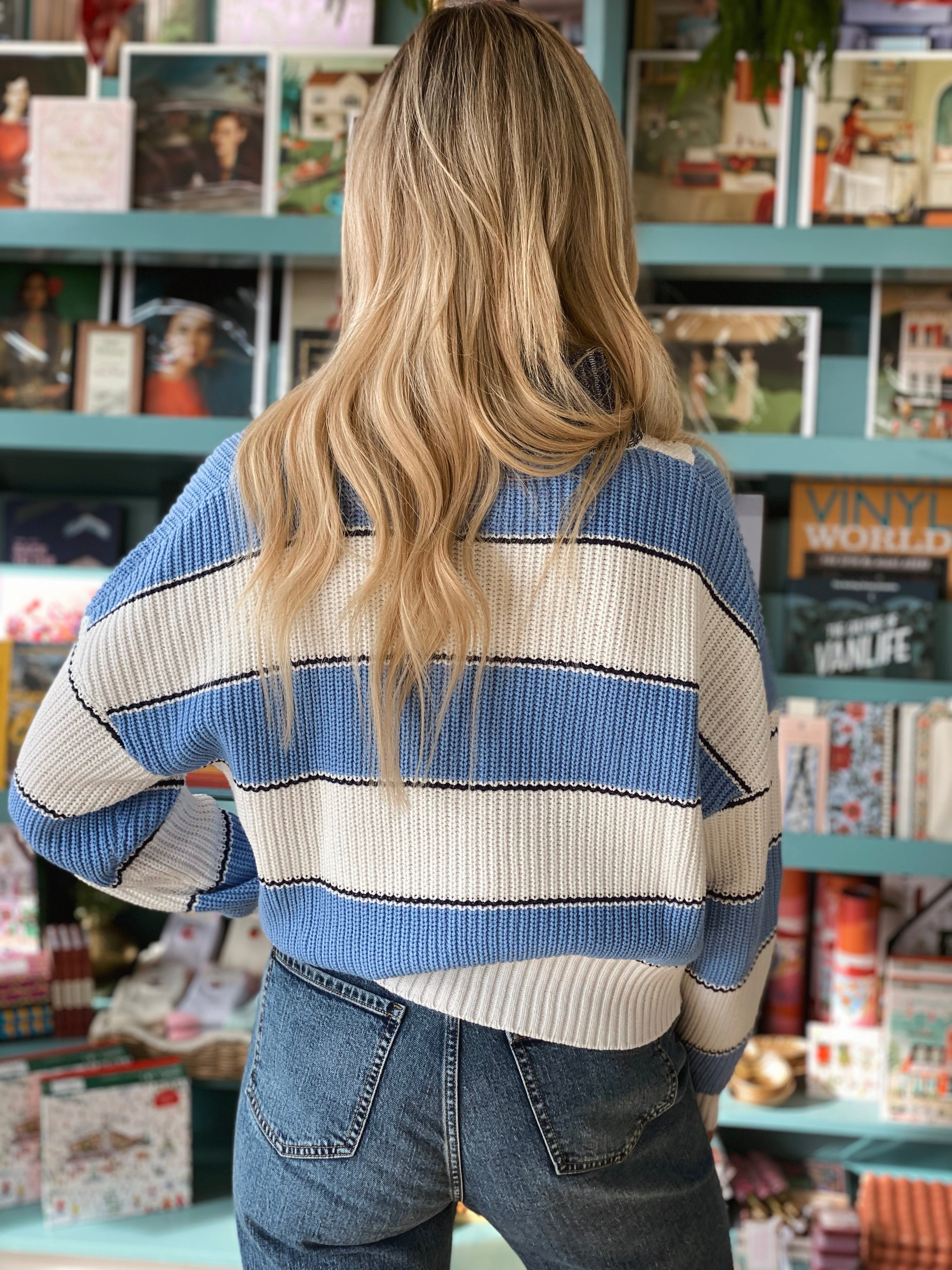 Fresh, classic, and effortlessly cozy—our Coastal Stripe Half-Zip Cotton Sweater is the perfect blend of comfort and style. Crafted from 100% cotton in a beautifully textured rib knit, this sweater features bold sky-blue and ivory stripes accented with fine navy trim for a crisp, coastal-inspired look.