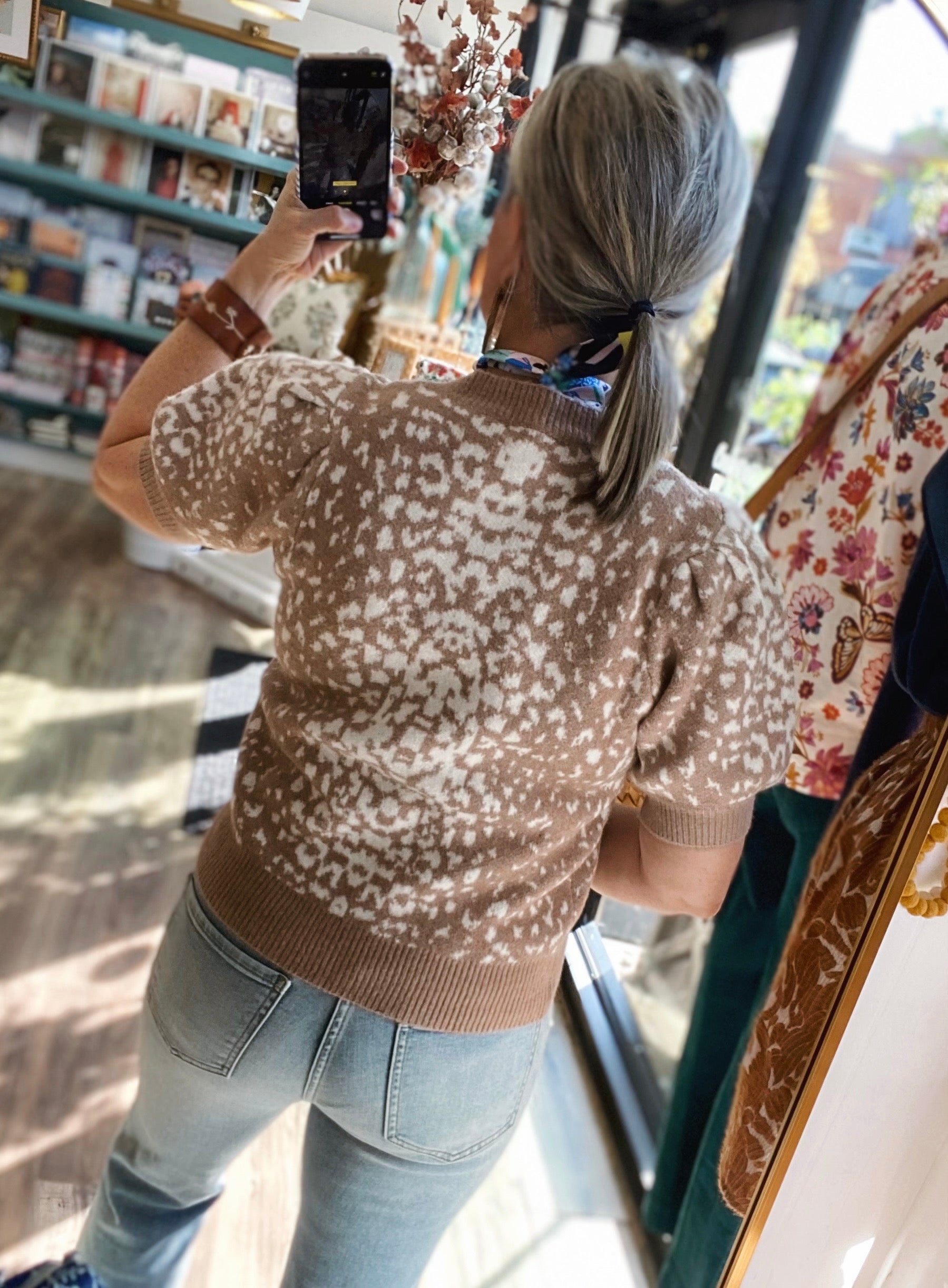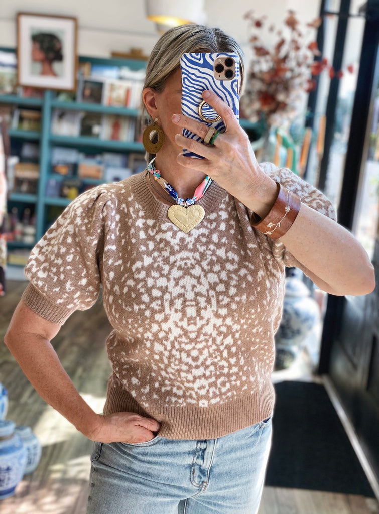 Soft, chic, and effortlessly versatile — this short-sleeve sweater is a fall must-have. Designed with a subtle cream-and-camel pattern and crafted from a luxe knit blend, it combines cozy texture with a flattering feminine silhouette. The puff sleeves add a polished touch, while the ribbed neckline, cuffs, and hem create a perfectly tailored finish.