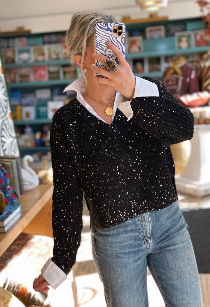 Add a little sparkle to your everyday with this layered chic black sequin sweater top, featuring a built-in layered component of a crisp white collar and matching cuffs— where cozy meets glam. Crafted from a soft, midweight knit blend of polyester, acrylic, nylon, and wool, this piece catches the light beautifully with its allover tonal sequins. The relaxed silhouette and classic V-neck make it effortlessly wearable.