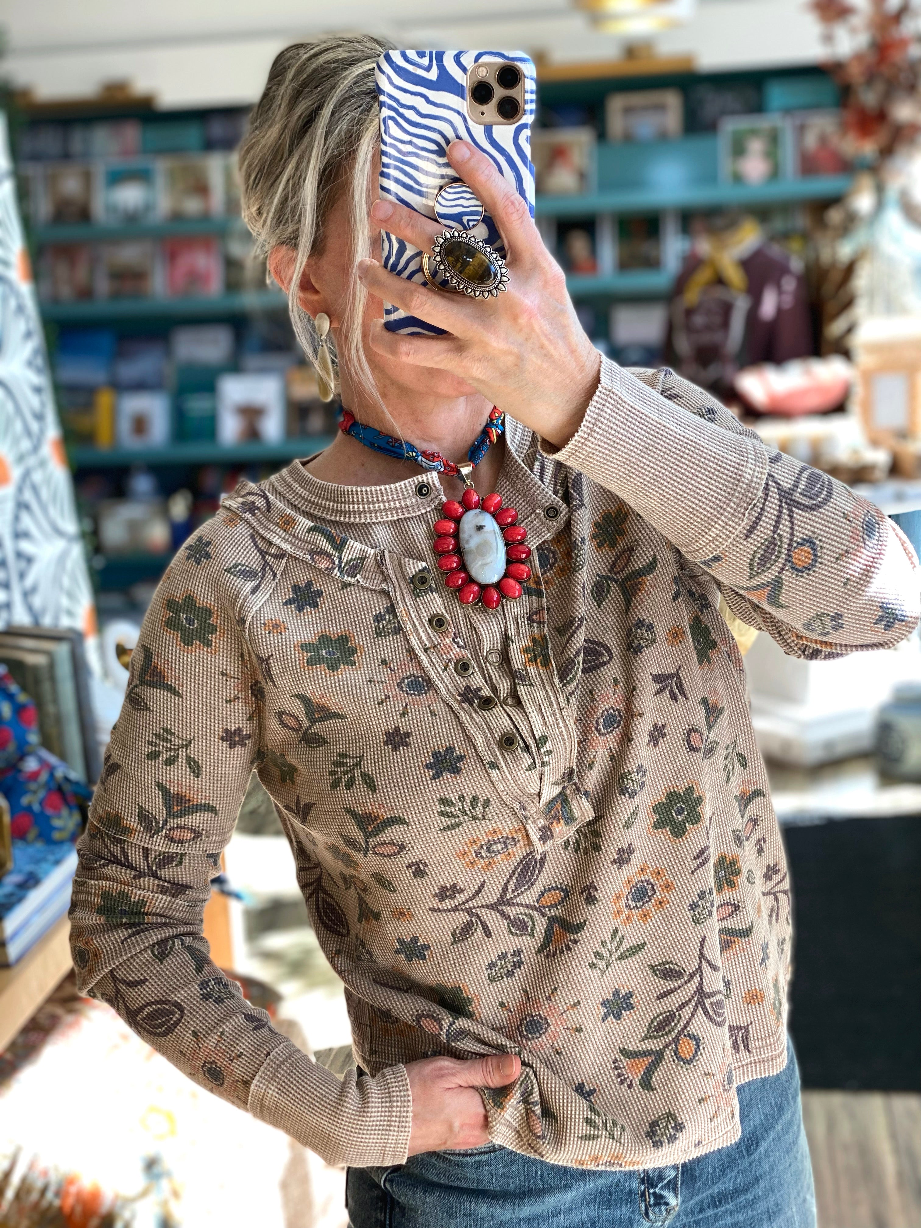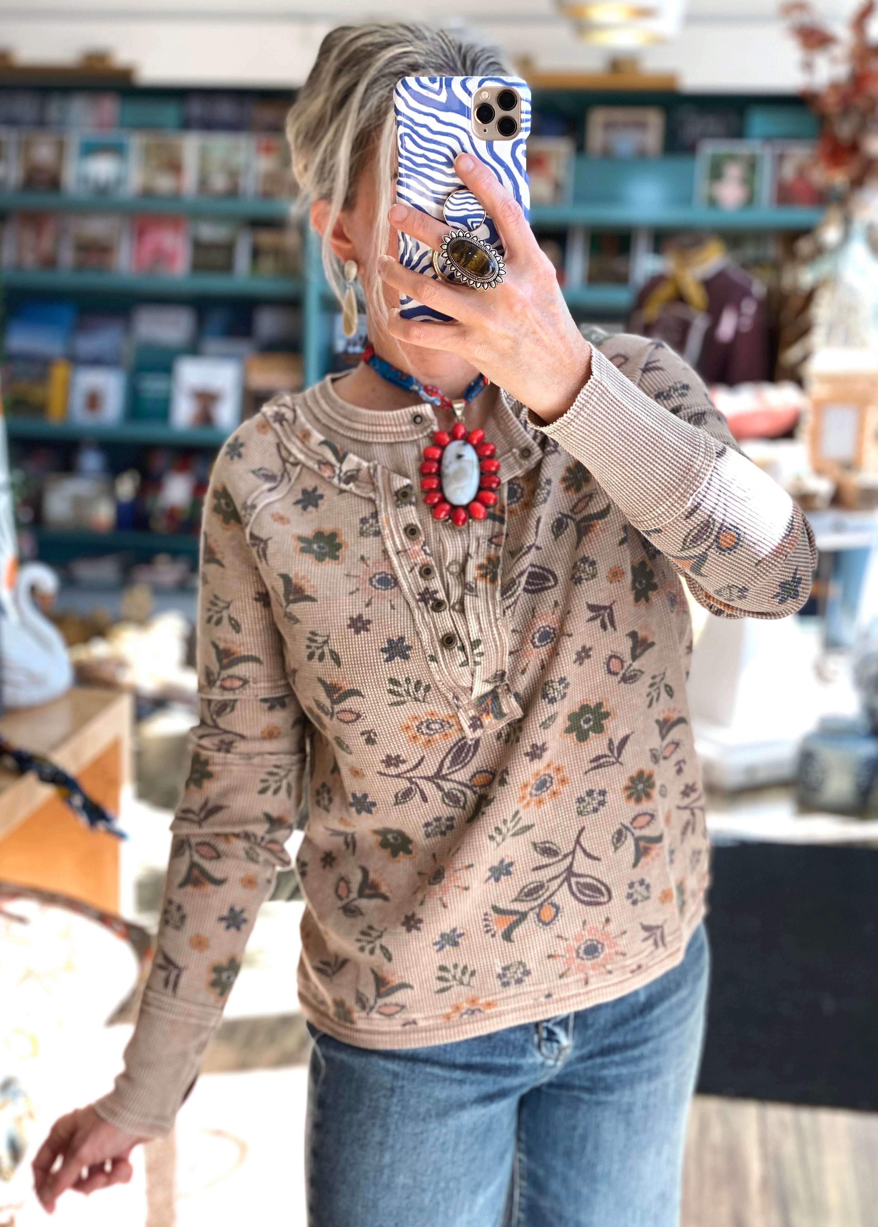 A soft, vintage-inspired essential with a feminine twist. This cotton waffle-knit thermal features a delicate floral print in earthy fall tones, accented by ruffle trim and a button-front Henley neckline. The lightweight yet cozy texture makes it the perfect layering piece for cooler days.