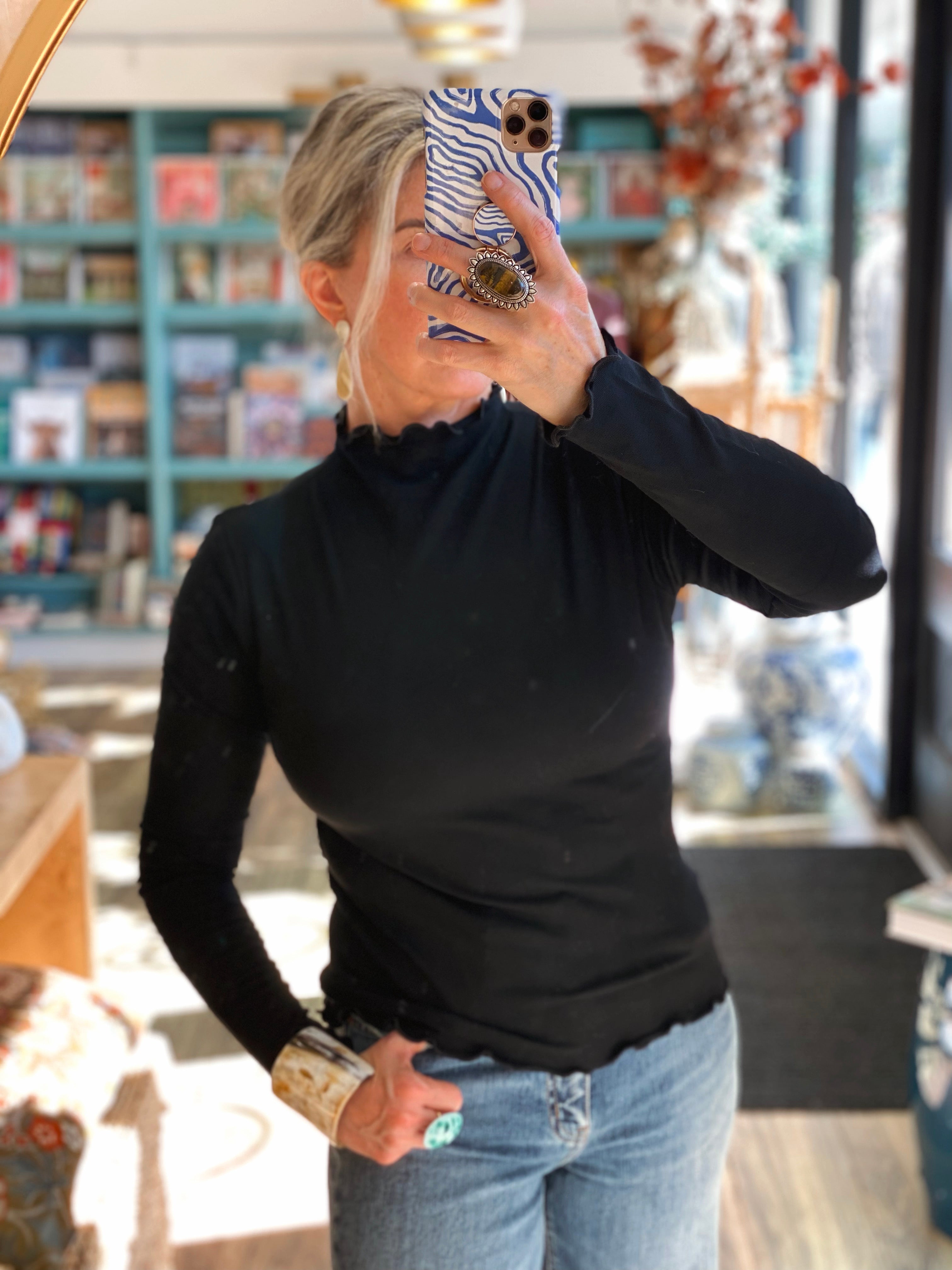A timeless staple with a feminine twist — this black turtleneck is designed with delicate ruffle edging at the neckline and cuffs for a subtle, polished finish. Made from a soft, stretchy rayon, cotton, and spandex blend, it offers a smooth fit that moves comfortably with you while maintaining its sleek shape.