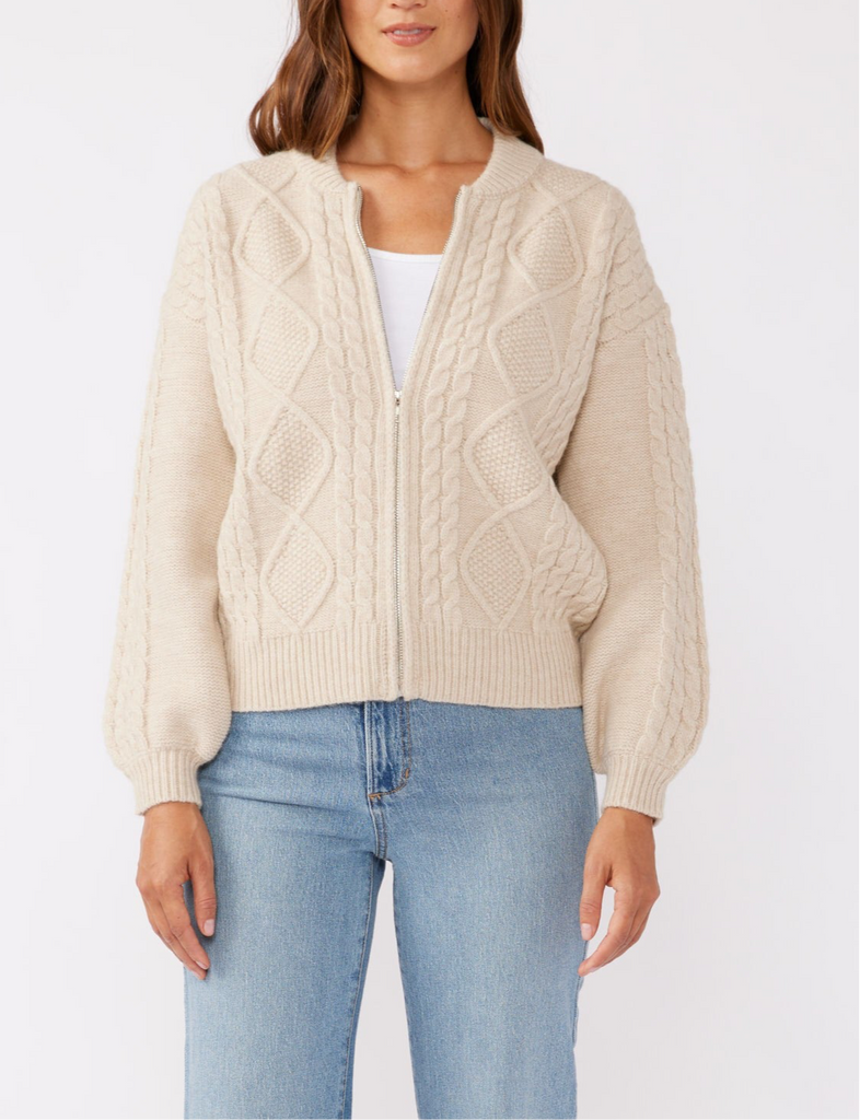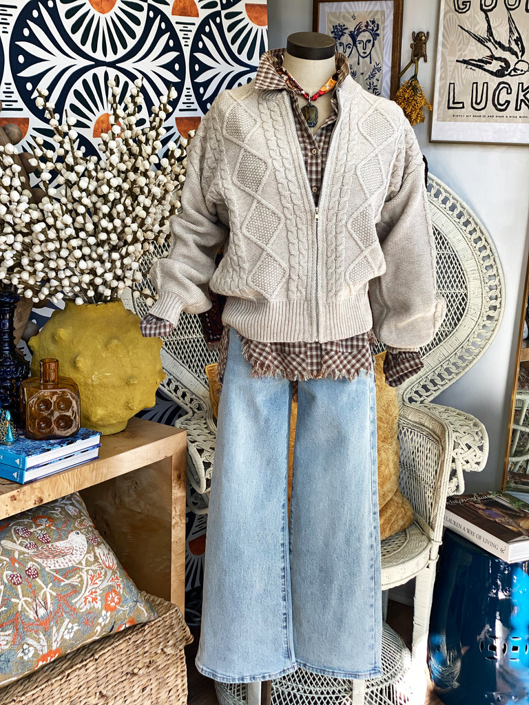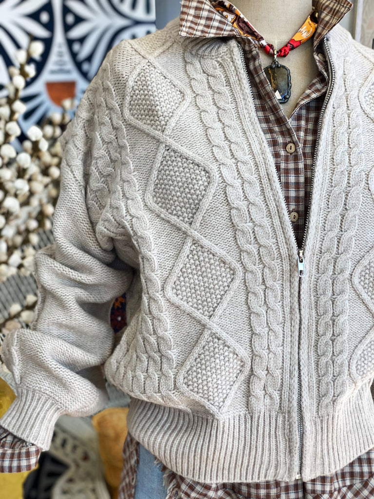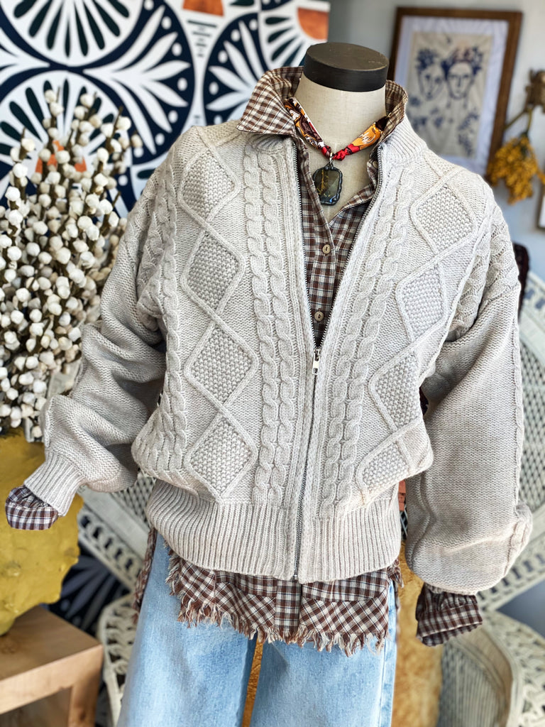 A modern twist on a timeless classic — this zip-up cable knit cardigan blends cozy texture with effortless style. Designed with a mix of chunky cable and diamond stitching, it brings that vintage-inspired, hand-knit feel while keeping things fresh and easy to wear. The full zip front, ribbed trim, and relaxed silhouette make it perfect for layering over your favorite plaid shirts, tees, or dresses.