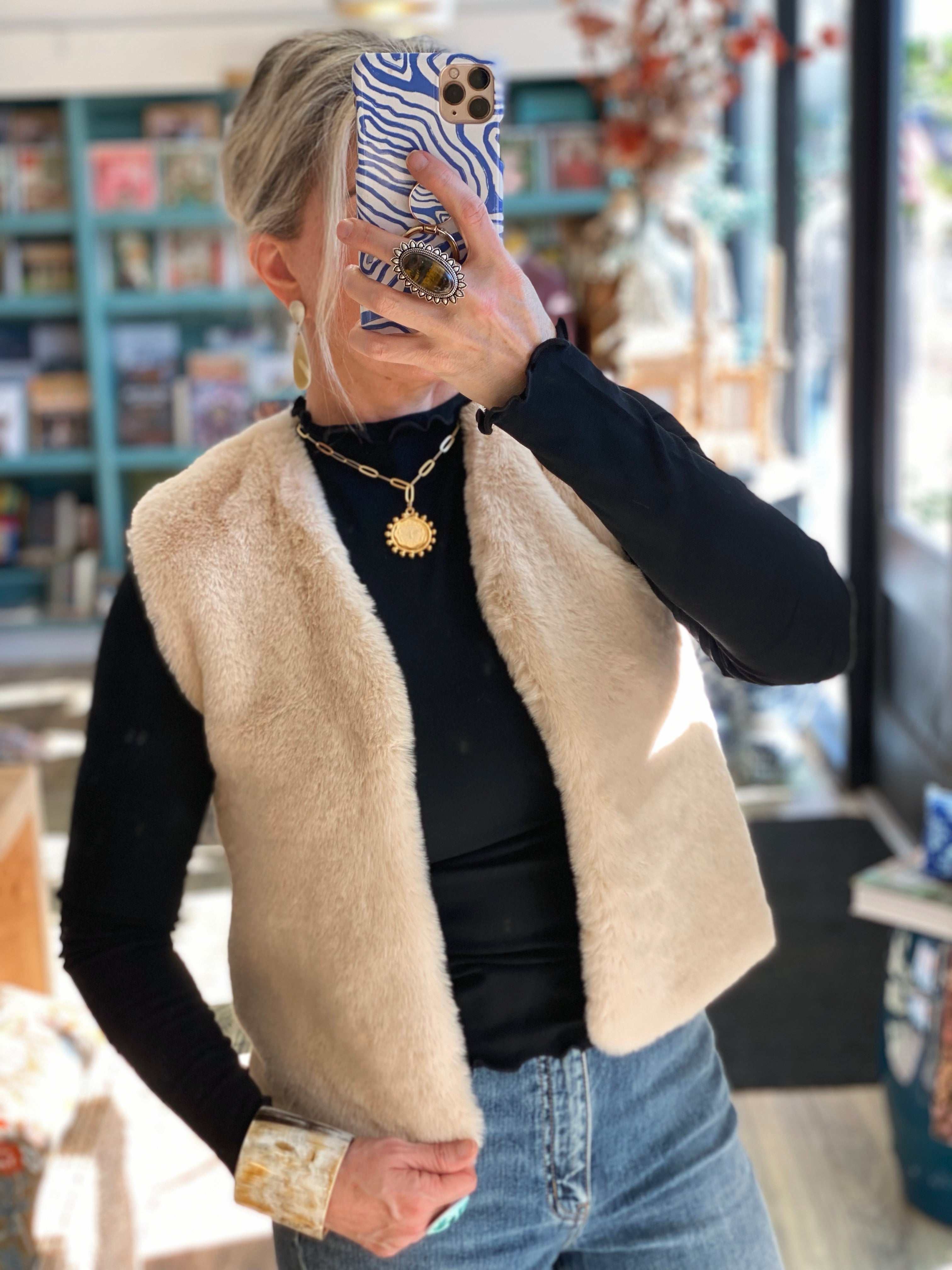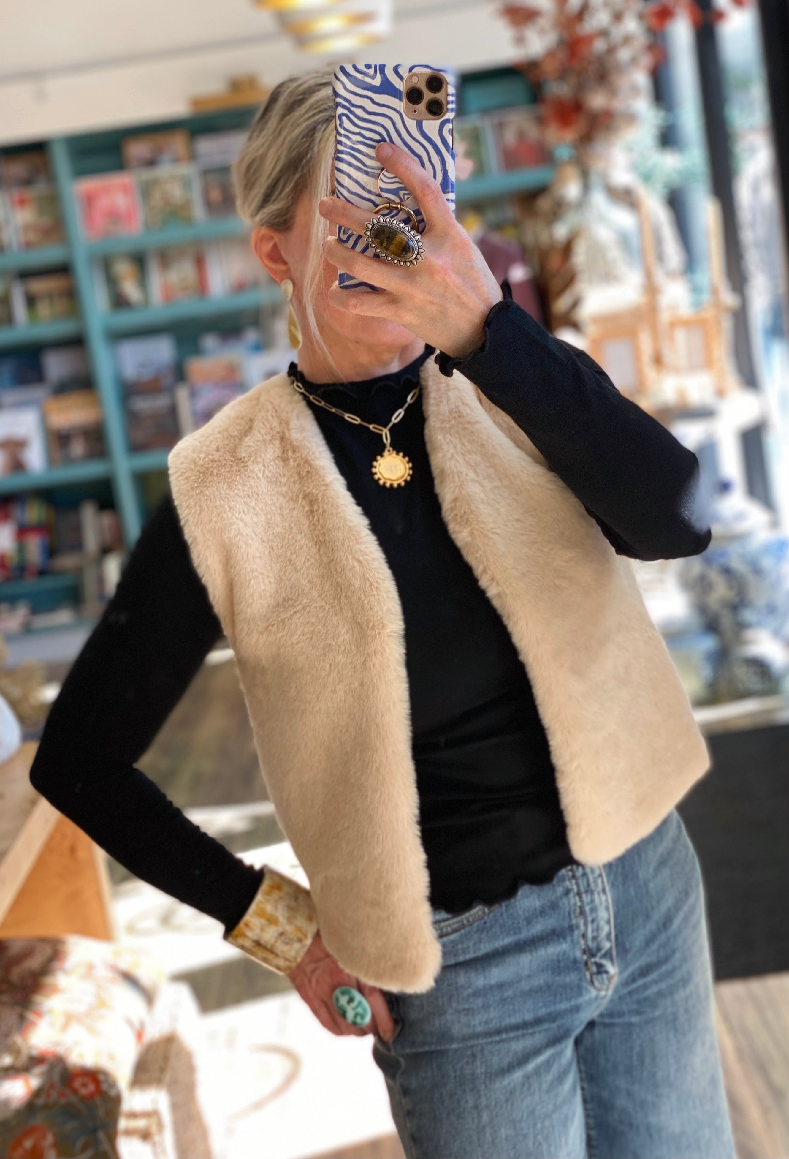Elevate your winter layers with this luxuriously soft faux fur vest — a cozy-chic essential for the season. Designed in a neutral beige hue that pairs effortlessly with everything, it features a plush, velvety texture and an open-front silhouette for easy wear. The cropped, tailored fit flatters your shape while adding just the right amount of warmth without the bulk. Perfect for layering over lightweight knits, turtlenecks, or dresses for an instantly polished cold-weather look.