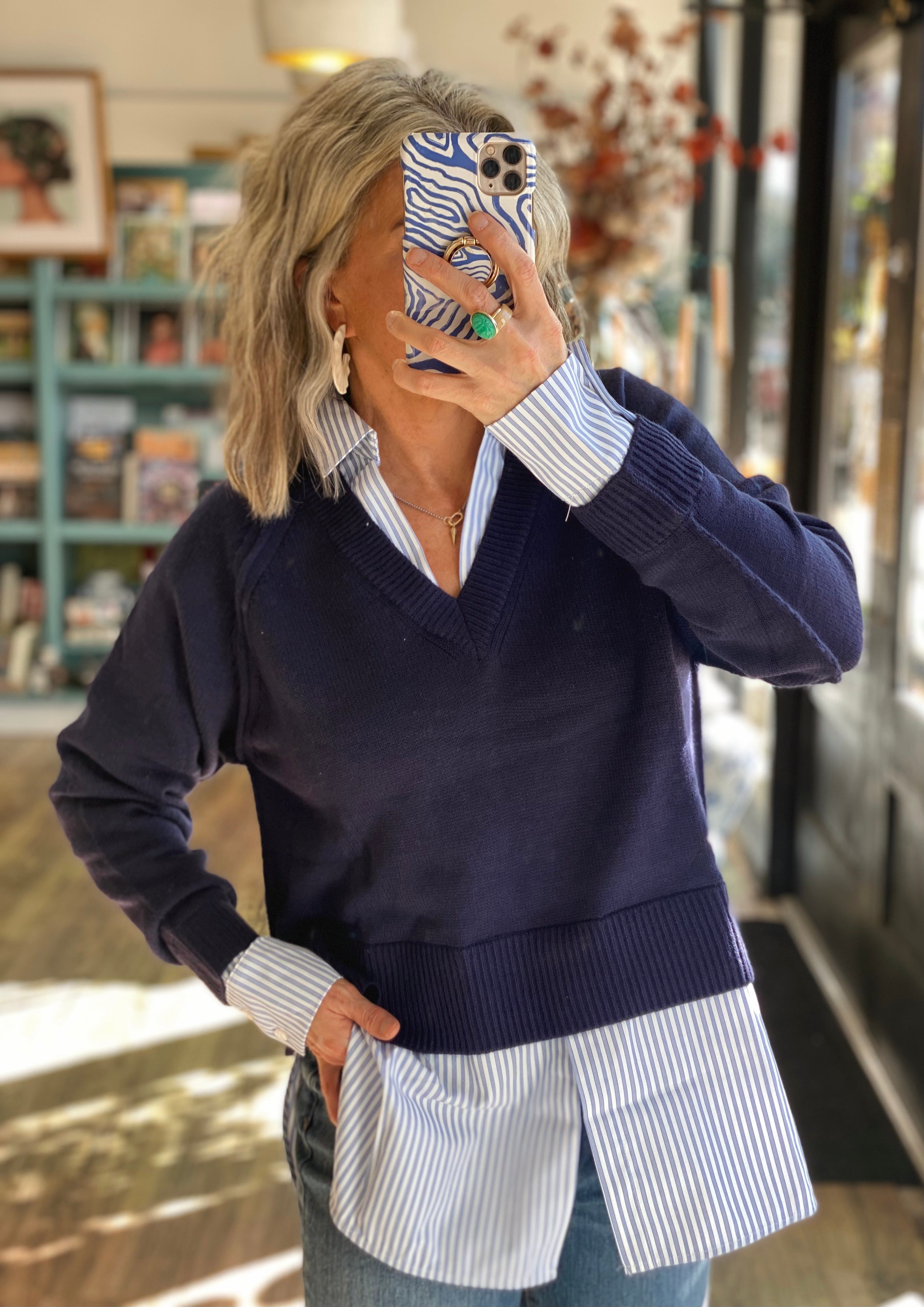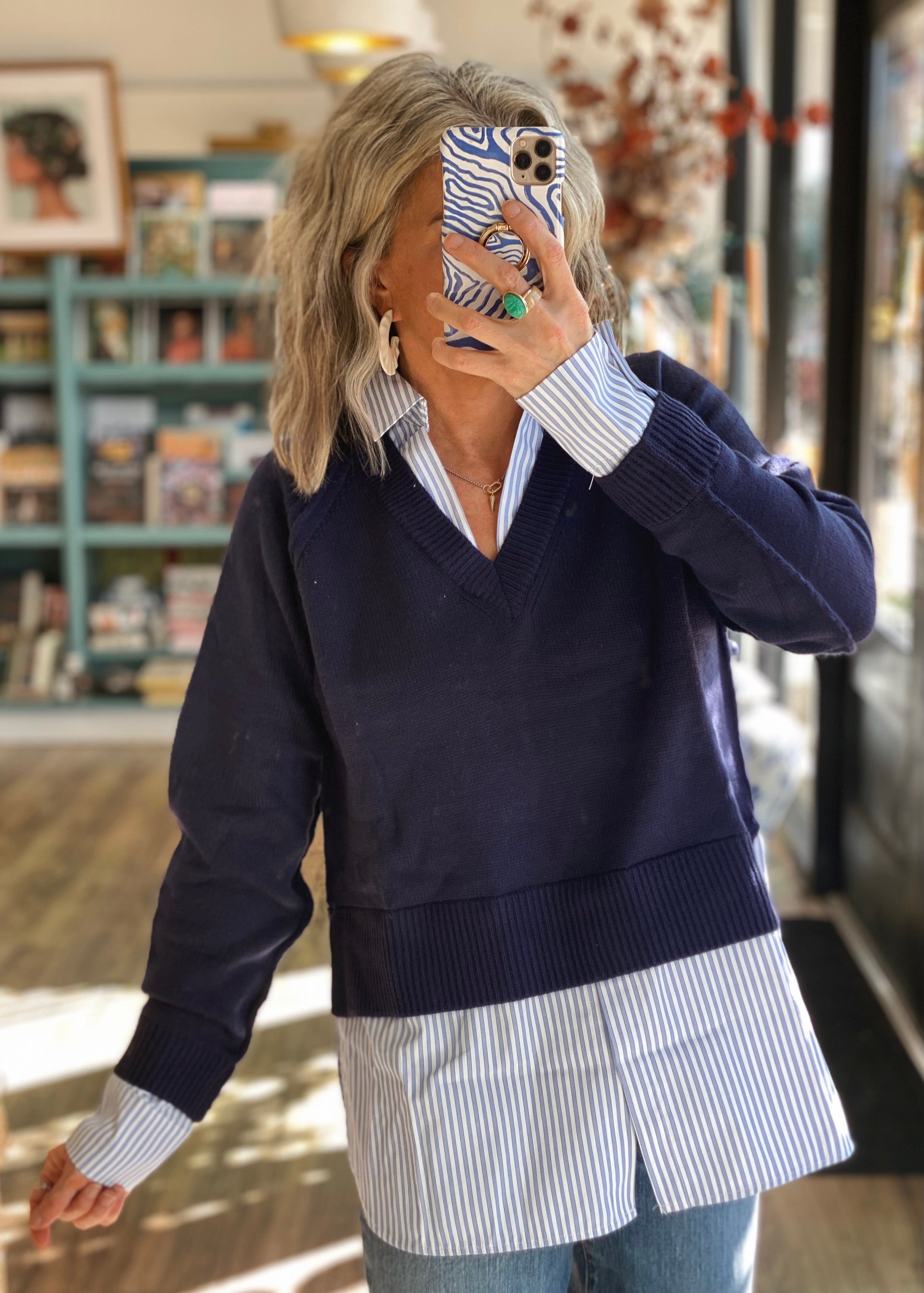 Effortless layering made simple — this “two-fer” style sweater gives you a polished, put-together look with zero fuss. The navy knit pullover is designed with an attached striped shirting layer that peeks out at the hem, cuffs, and collar for a crisp, classic finish. Crafted in a soft midweight knit with a relaxed fit, it’s the perfect blend of preppy and cozy.