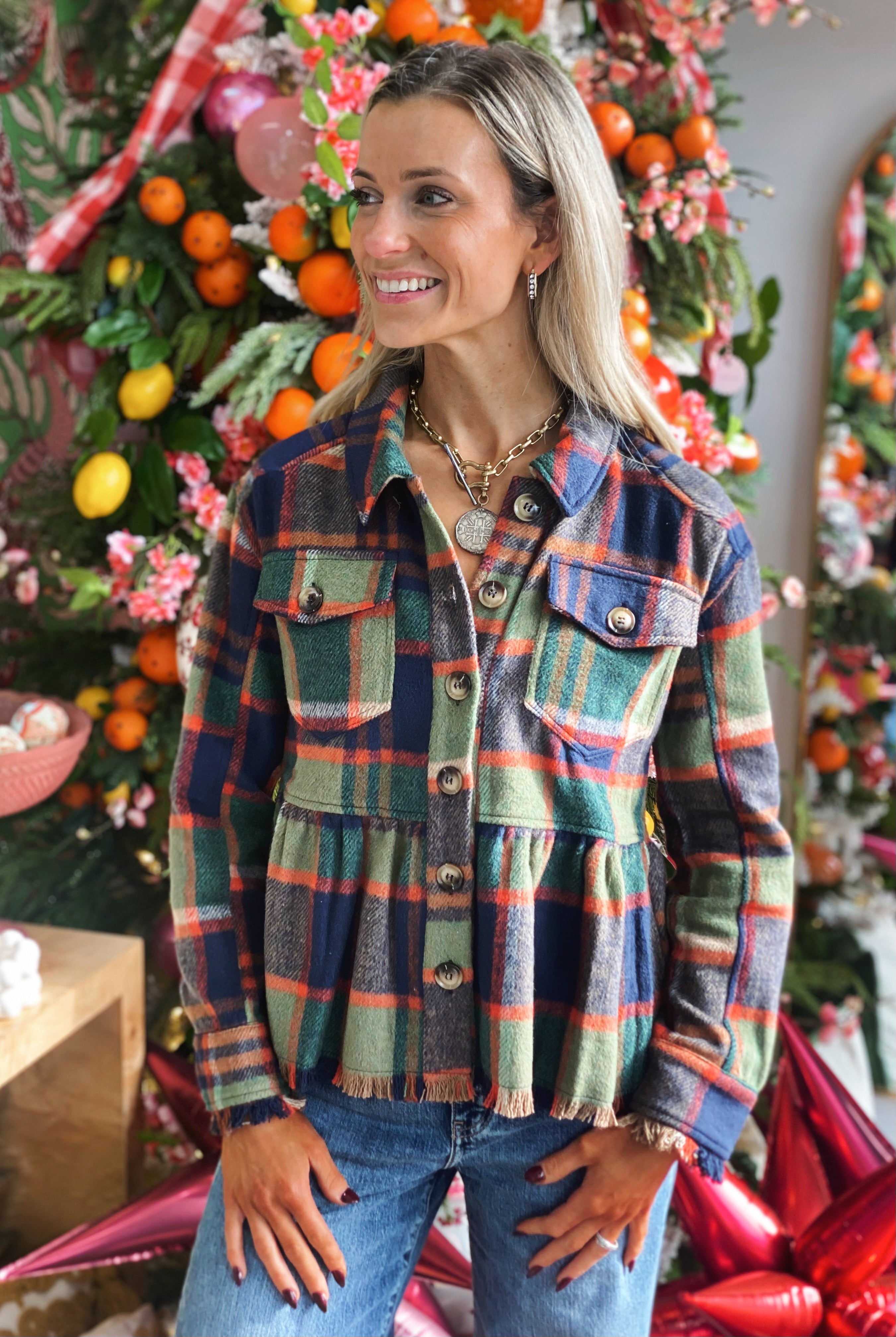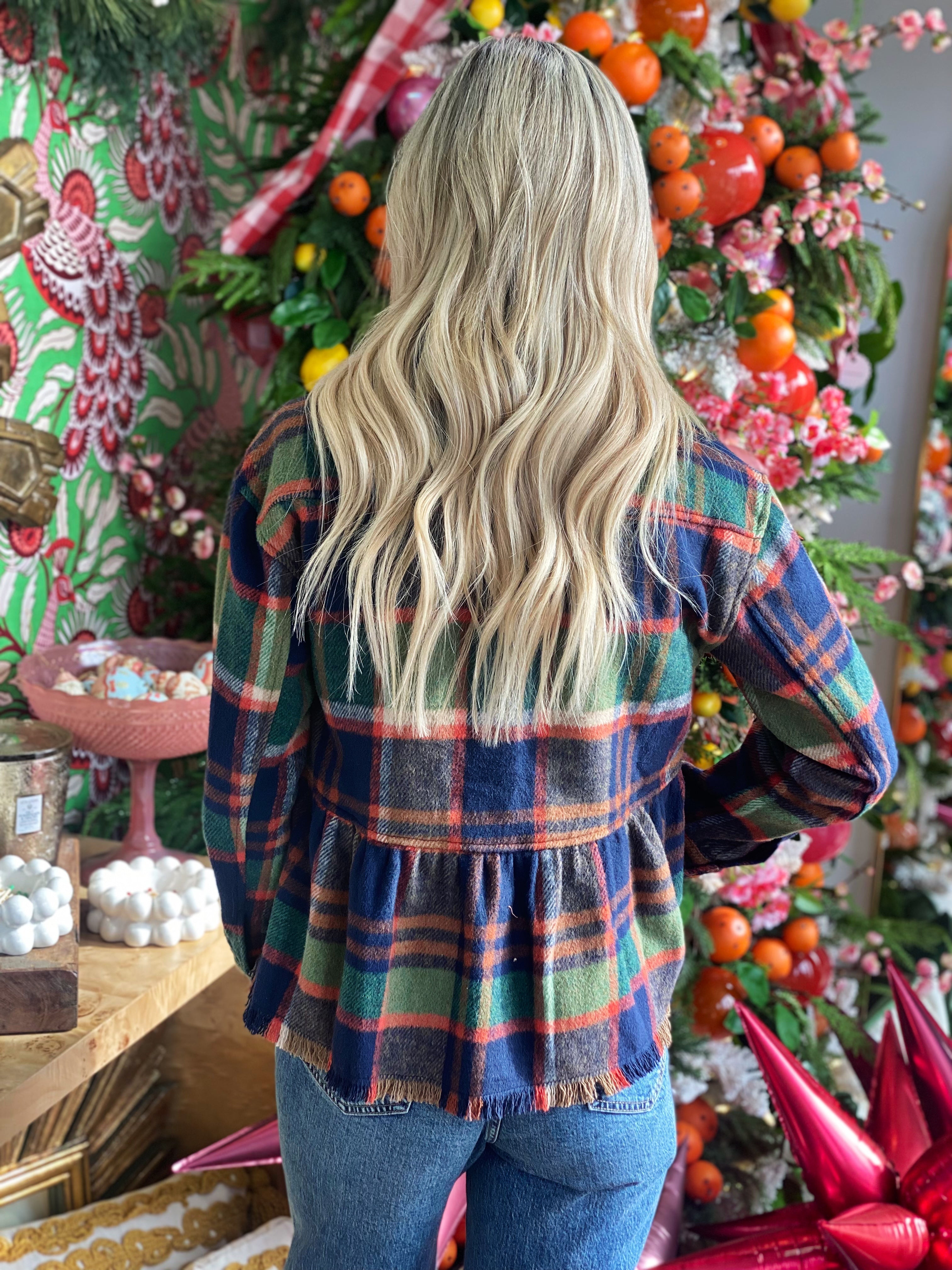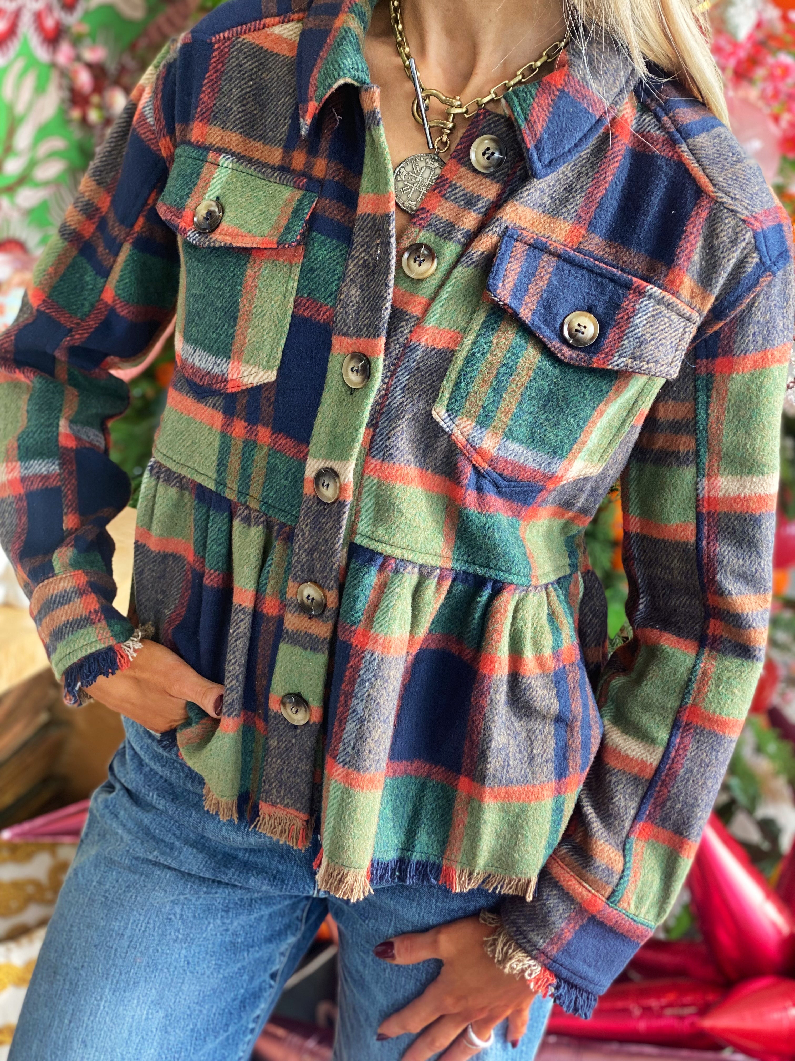 Cozy, charming, and effortlessly styled—this plaid babydoll jacket is the perfect layering piece for the season. Designed with a soft brushed flannel feel, this jacket features a full button front, chest pockets, and an easy peplum-inspired babydoll silhouette that flatters while keeping things comfortable.