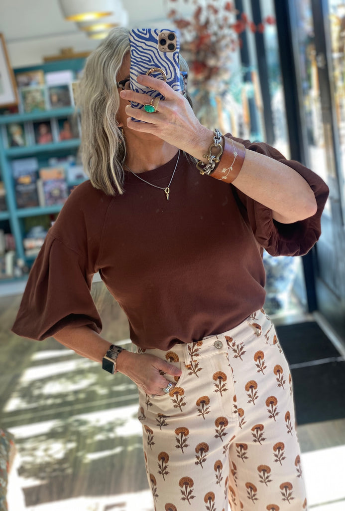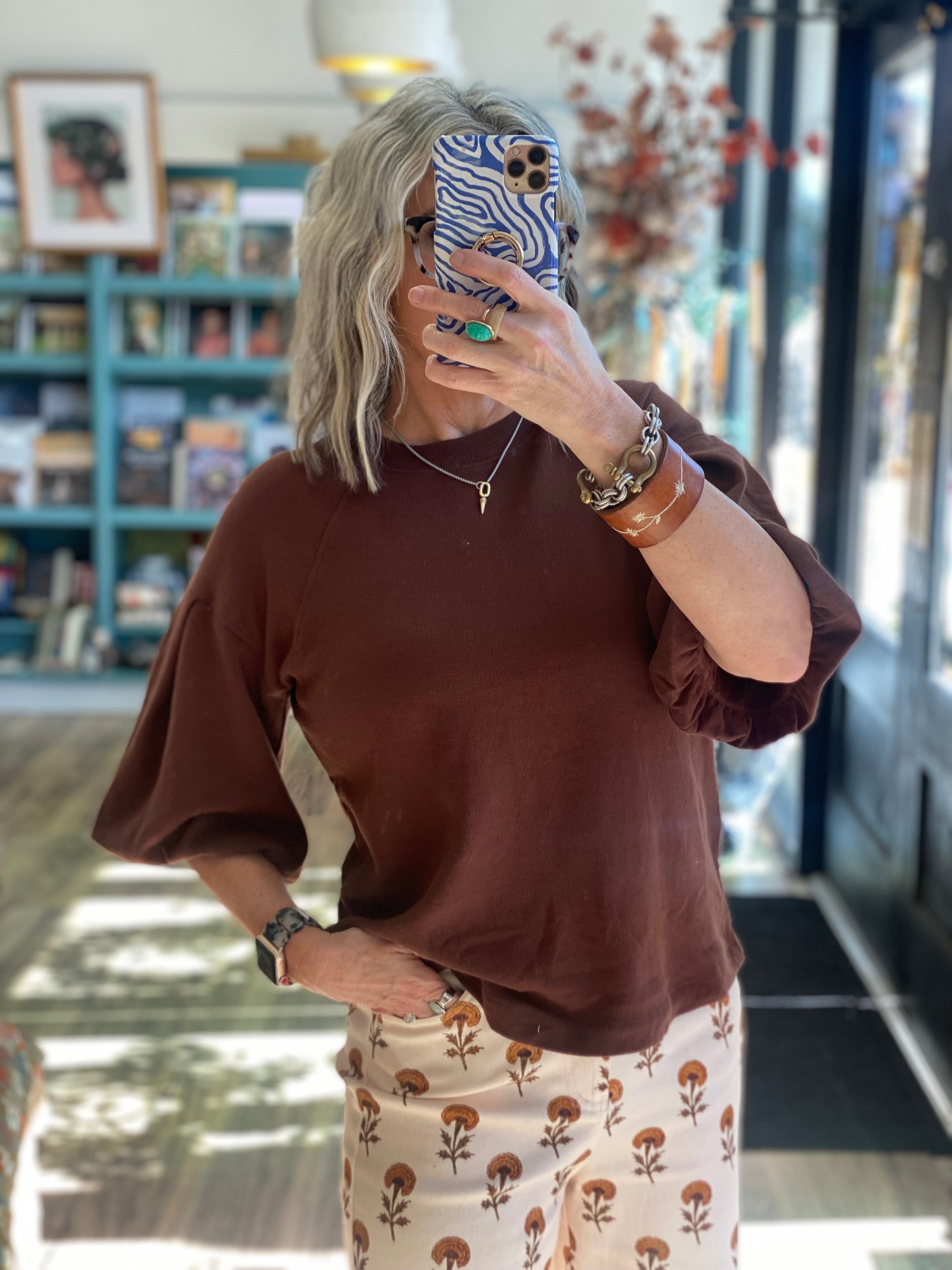 Soft, simple, and effortlessly elevated — this French Terry top brings cozy comfort with a stylish twist. Made from midweight French Terry fabric, it features relaxed raglan seams and gently puffed sleeves for a feminine silhouette that’s easy to dress up or down. The warm chestnut hue adds richness and versatility to your wardrobe, pairing beautifully with denim, printed pants, or skirts.