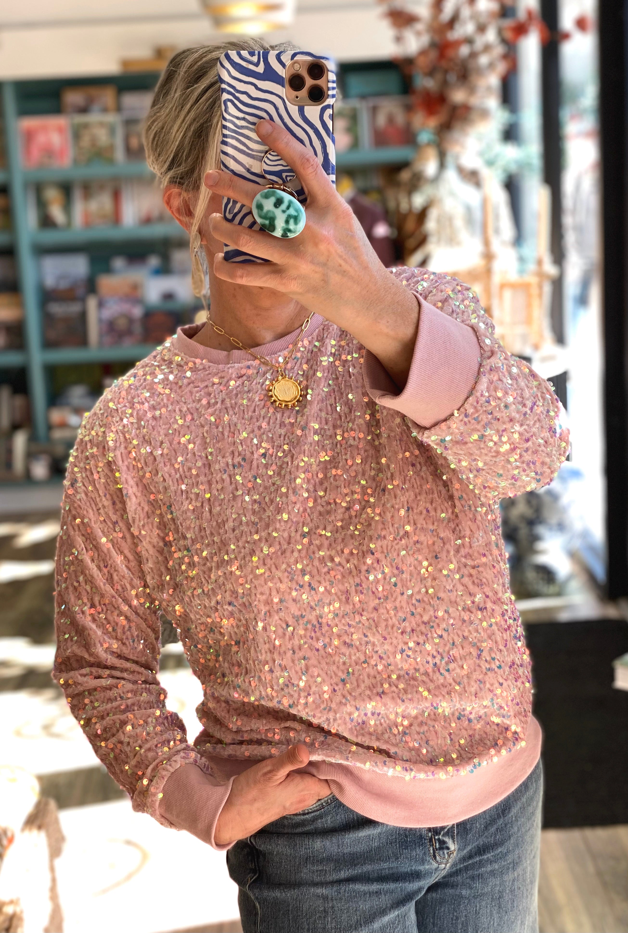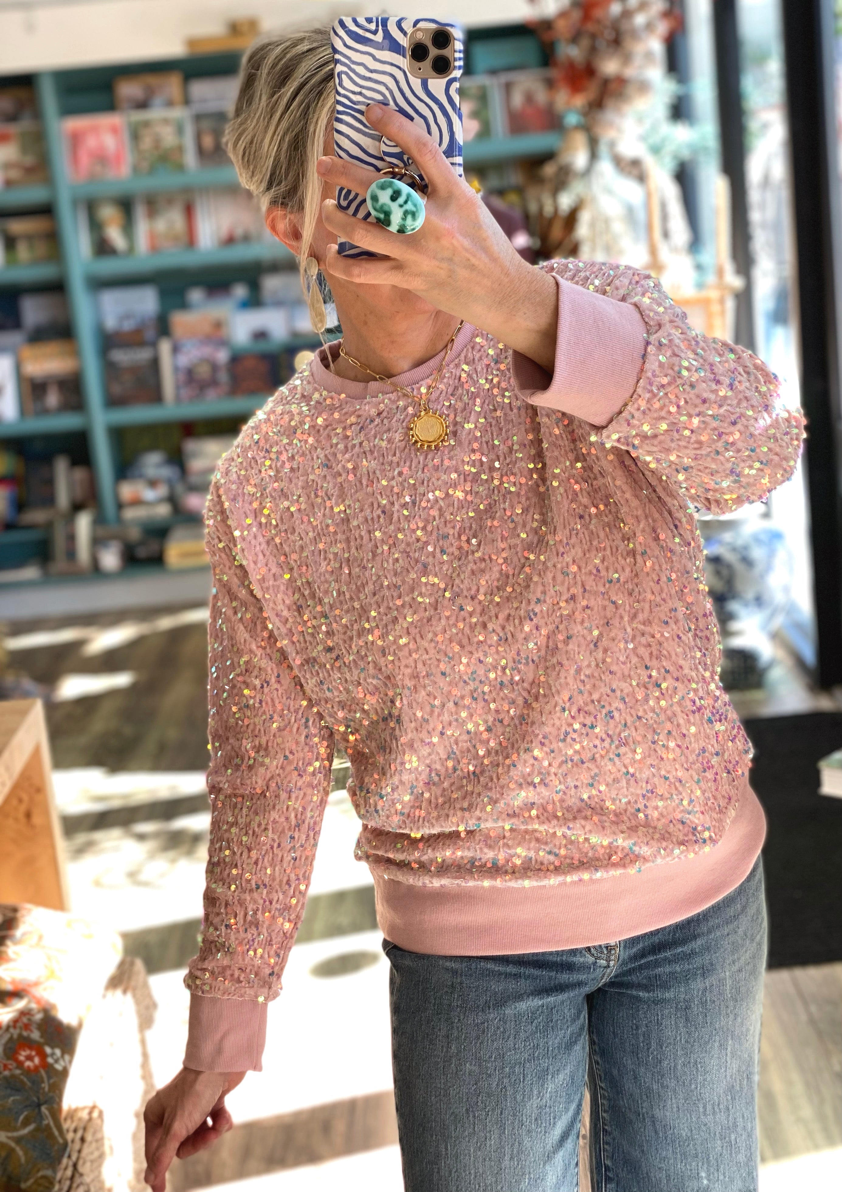 Bring the sparkle wherever you go in this stunning blush sequin top — the perfect mix of cozy and glam. Featuring an allover sequin overlay that shimmers with every movement, this piece turns even casual days into a celebration. The soft textured base gives it a plush feel, while the ribbed neckline, cuffs, and hem add just the right amount of structure and comfort.