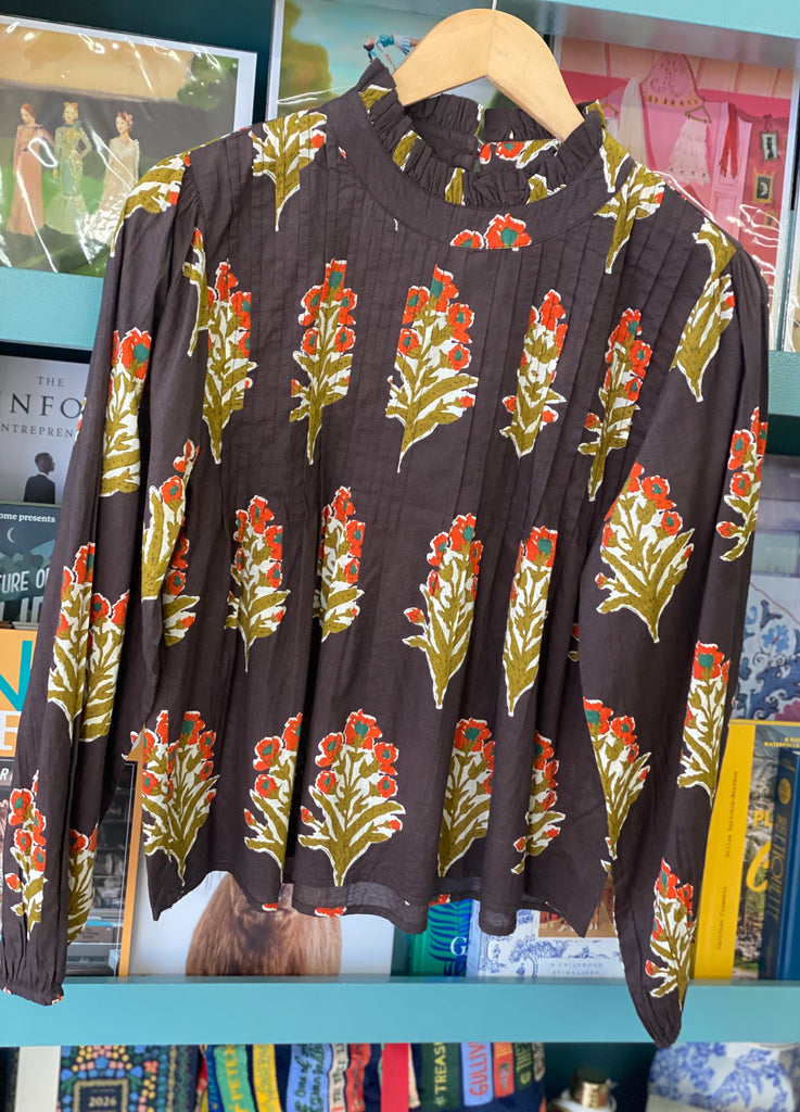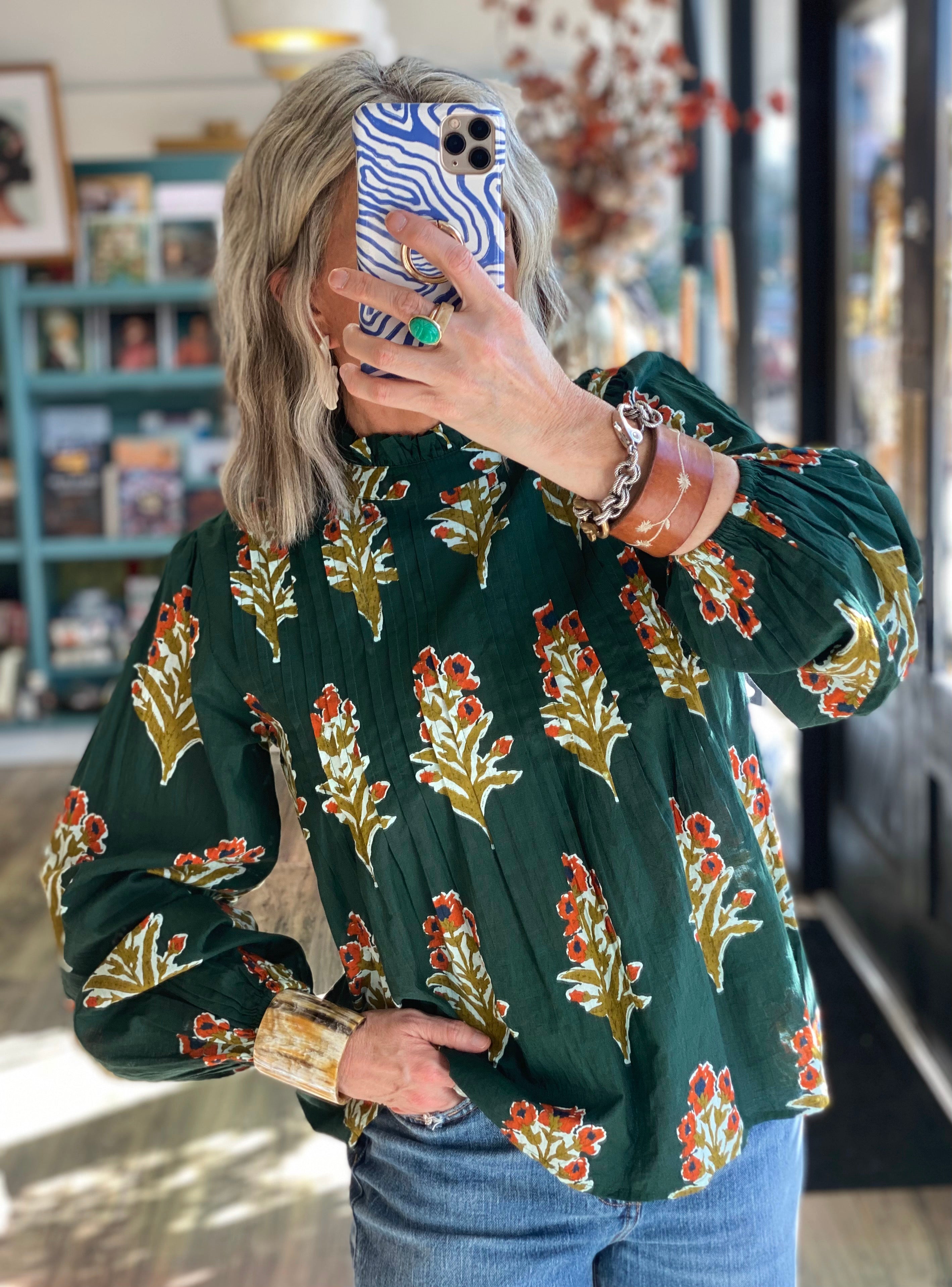 Effortless and artful, this 100% cotton blouse from THML features a rich forest green base adorned with hand-block inspired floral prints in warm golden and rust tones. The lightweight cotton weave is breathable yet structured, creating an easy, flattering silhouette. Designed with subtle pintuck detailing, a ruffled neckline, and gathered sleeves for a touch of bohemian polish.