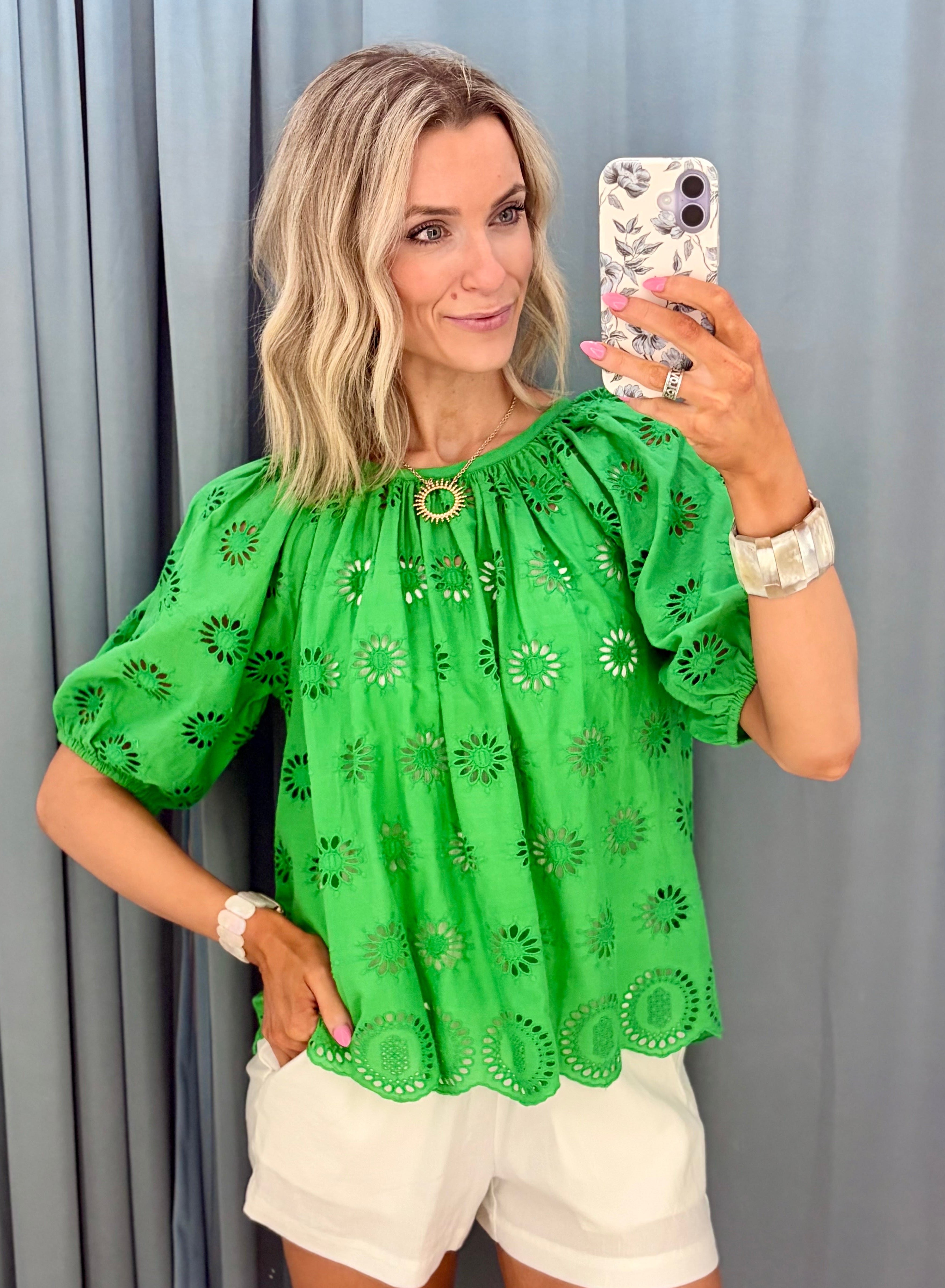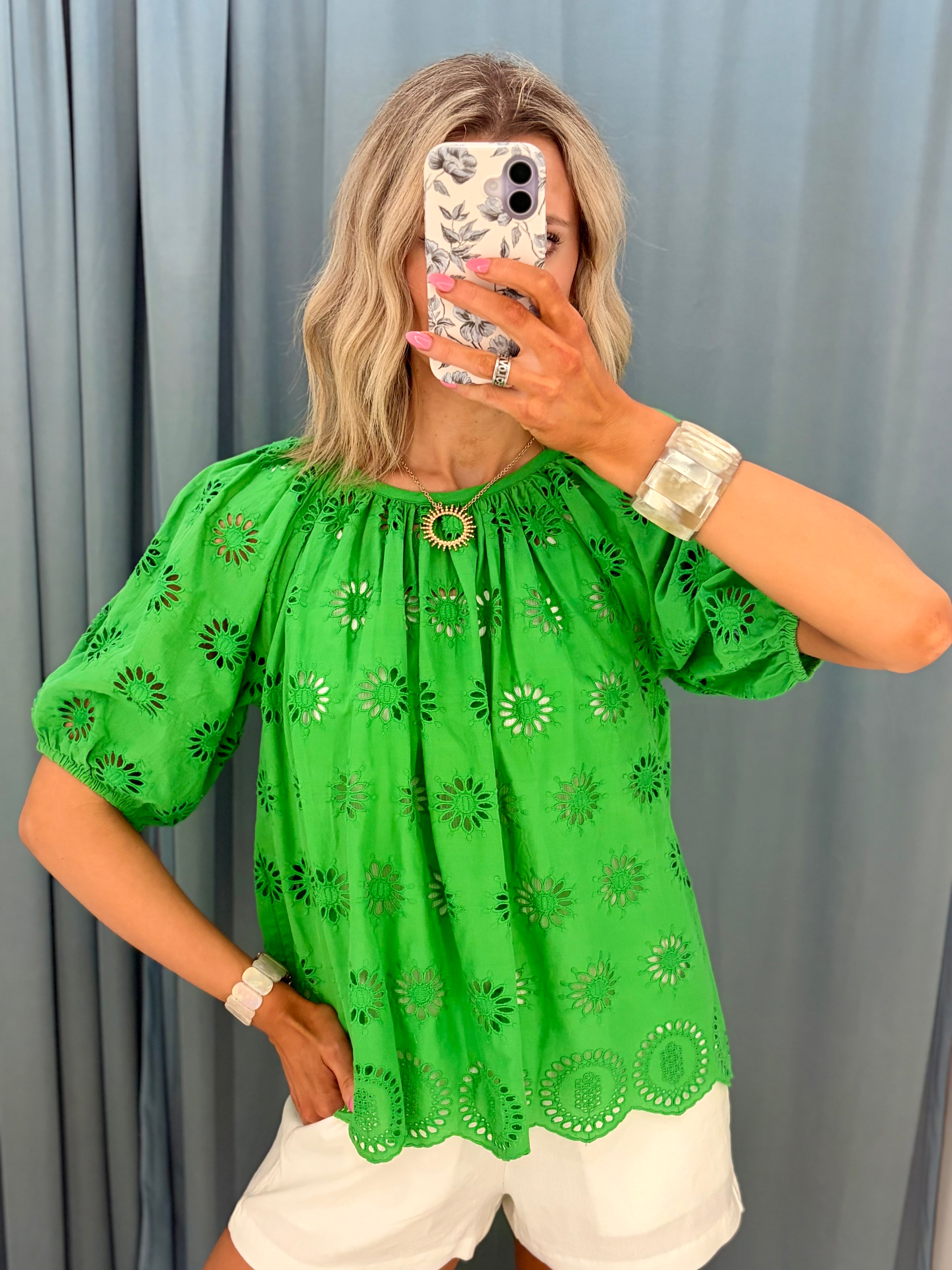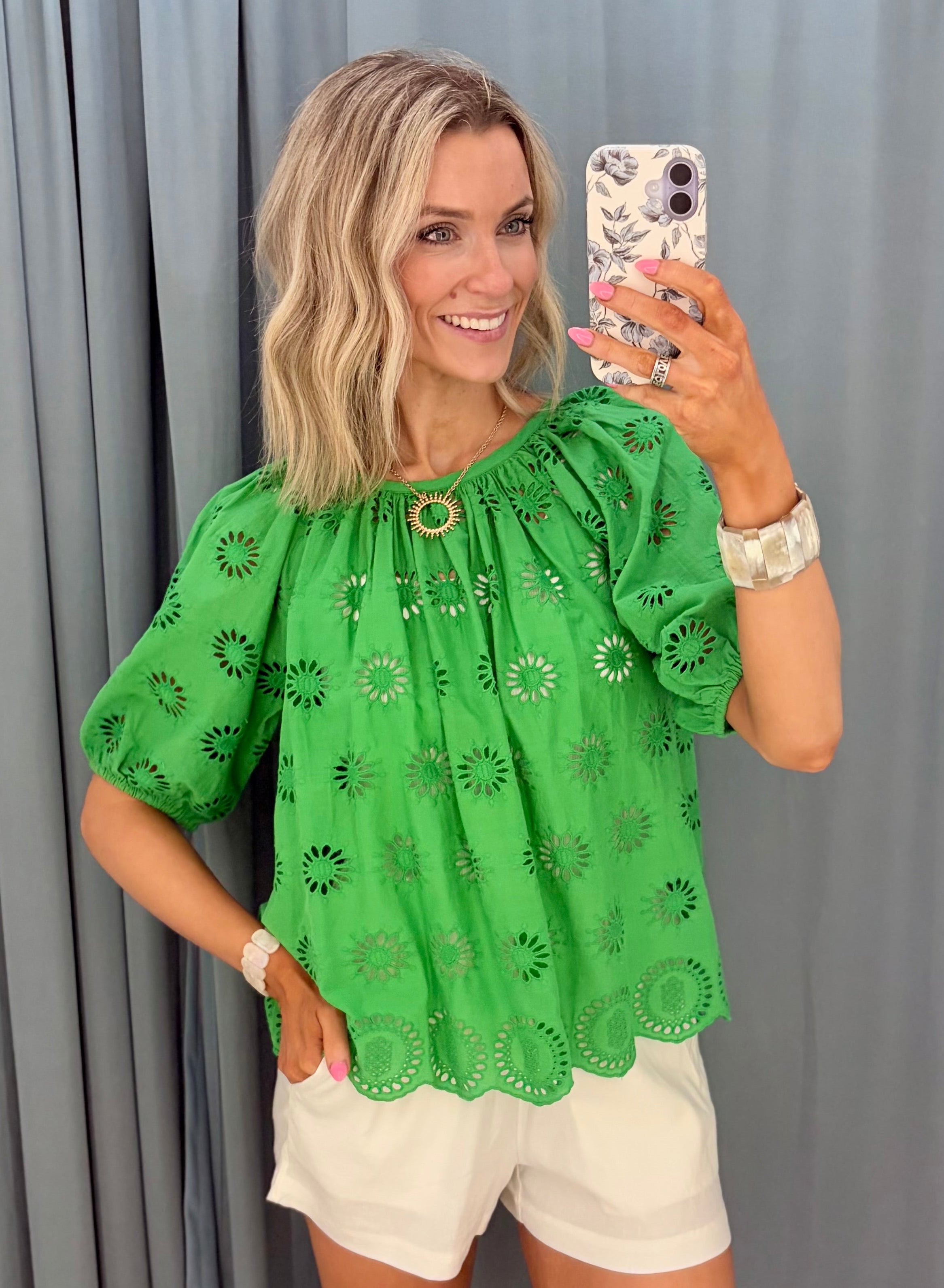 This THML top is an instant standout. The vibrant green color paired with delicate eyelet detailing gives it that fun, feminine feel, while the relaxed, airy fit keeps it easy and comfortable. The puff sleeves and gathered neckline add just the right amount of charm and volume.