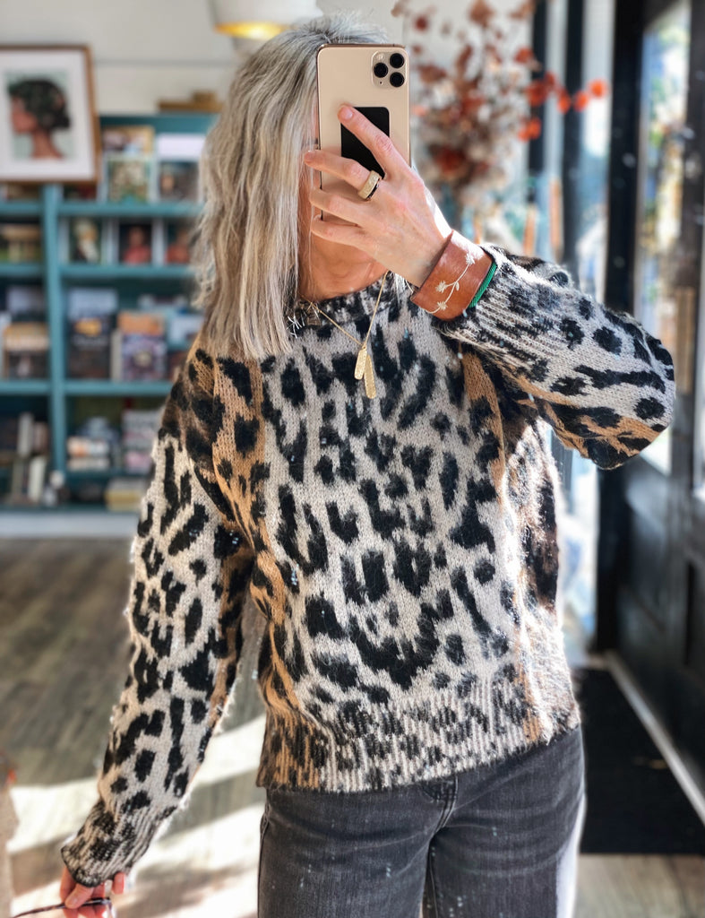 A bold statement with a soft touch — this fuzzy leopard knit brings cozy meets chic in the best way. Made with a plush, lightweight blend and a hint of wool for warmth, it features a gorgeous animal print that transitions perfectly from casual days to dressed-up evenings.