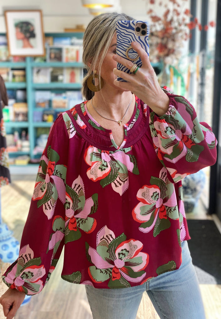 The Janelle Top is a sophisticated blend of classic charm and contemporary design. The intricate crochet lace trim details elevate the look, while the notched neckline adds a flattering touch. Long sleeves with elastic cuffs provide a comfortable, feminine fit that’s perfect for any occasion.