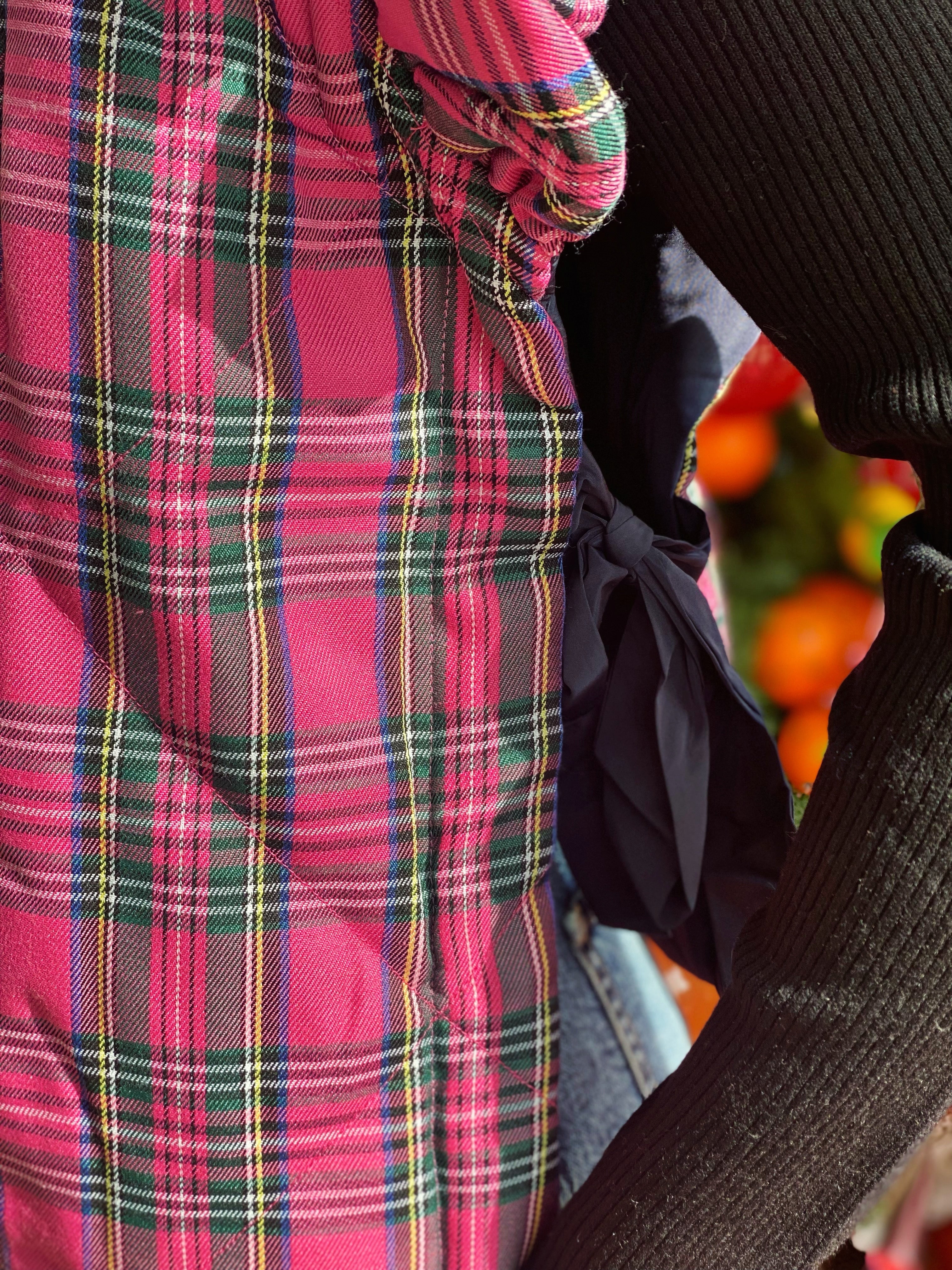 The Jefferies Plaid Quilted Vest is a stylish and versatile addition to any wardrobe, offering a unique blend of classic design and modern flair. This vest showcases a charming quilted tartan plaid pattern, perfect for adding a touch of sophistication to your outfit. The shoulder ruffles add a playful and feminine detail, while the cotton twill tape side ties allow for an adjustable fit, ensuring comfort and style. For added versatility, this vest reverses to a solid quilted nylon, providing two distinct looks in one piece. Designed to fit most sizes, it measures approximately 25 inches from shoulder to hem, making it an ideal layering piece for various body types.