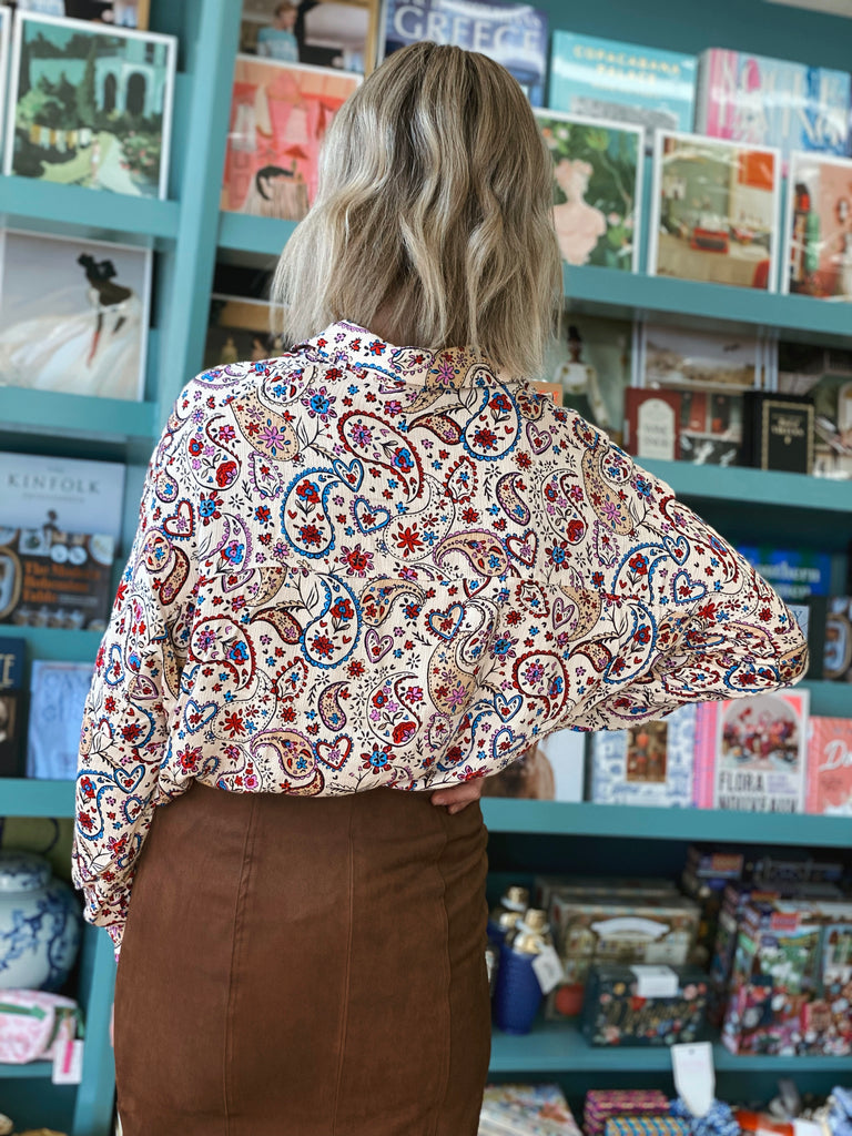 Bright, bold, and beautifully bohemian — this paisley print blouse is a statement piece for every season. Designed with a relaxed fit and lightweight woven fabric, it drapes effortlessly and pairs perfectly with denim, faux suede, or tailored trousers. The vibrant mix of reds, blues, and golds gives it that vintage-inspired charm you’ll love to wear again and again.