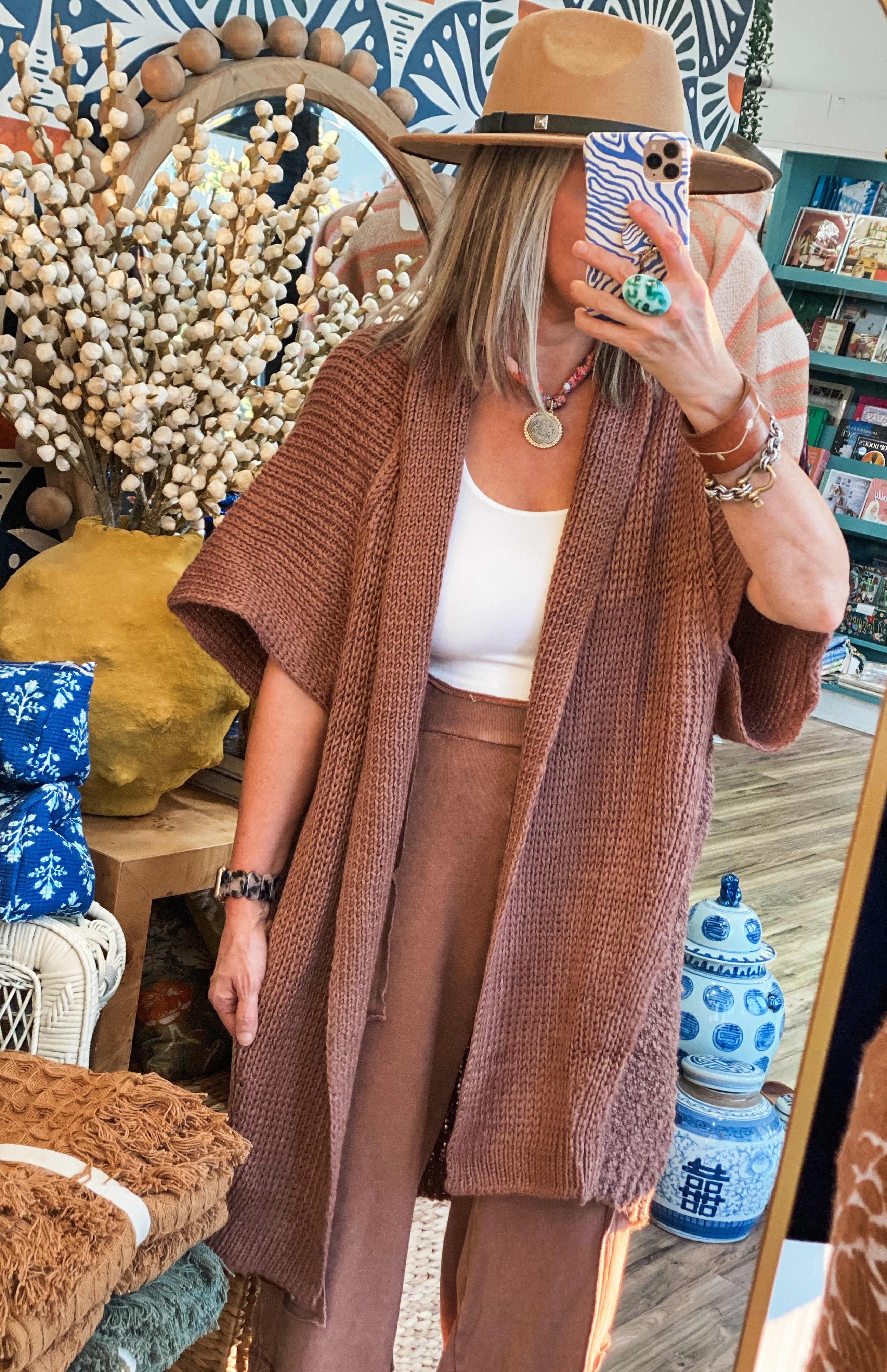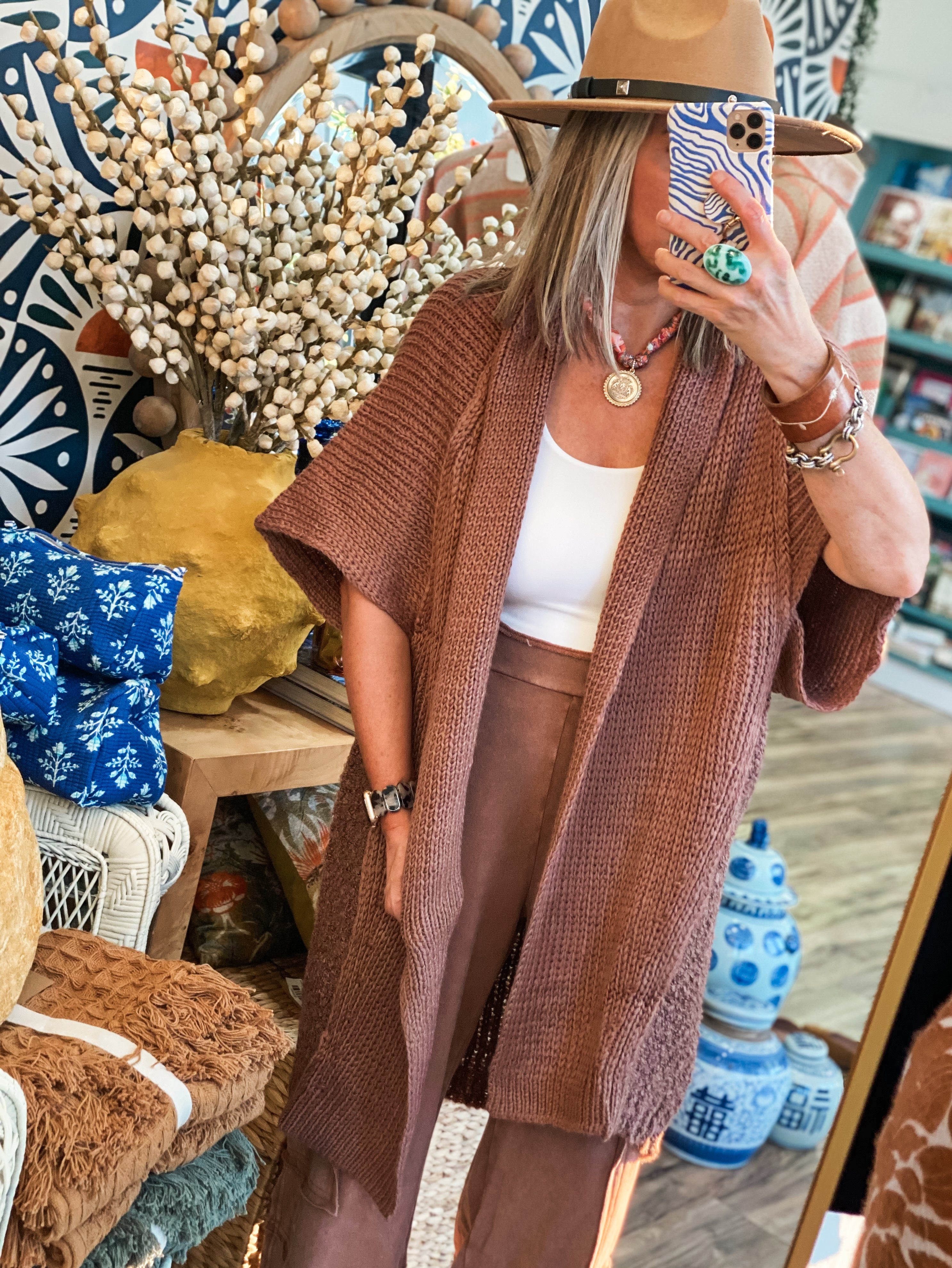 Wrap yourself in effortless coziness with this chunky knit cocoon cardigan. Designed in a relaxed open-front silhouette, it features wide short sleeves, roomy pockets, and a softly textured knit that layers beautifully over tanks, tees, or lightweight sweaters. The rich, warm tone adds an earthy touch that feels right at home in any season.