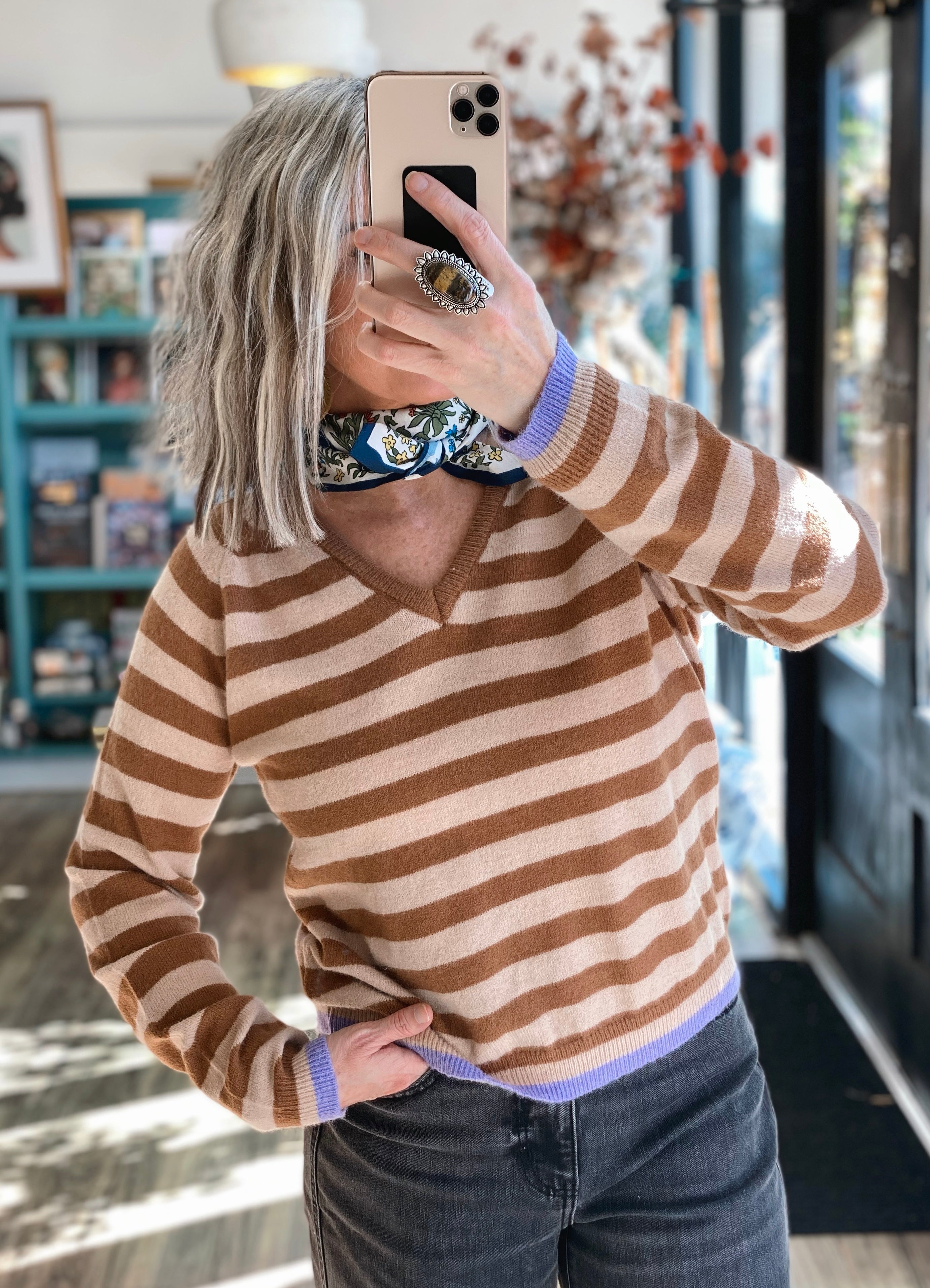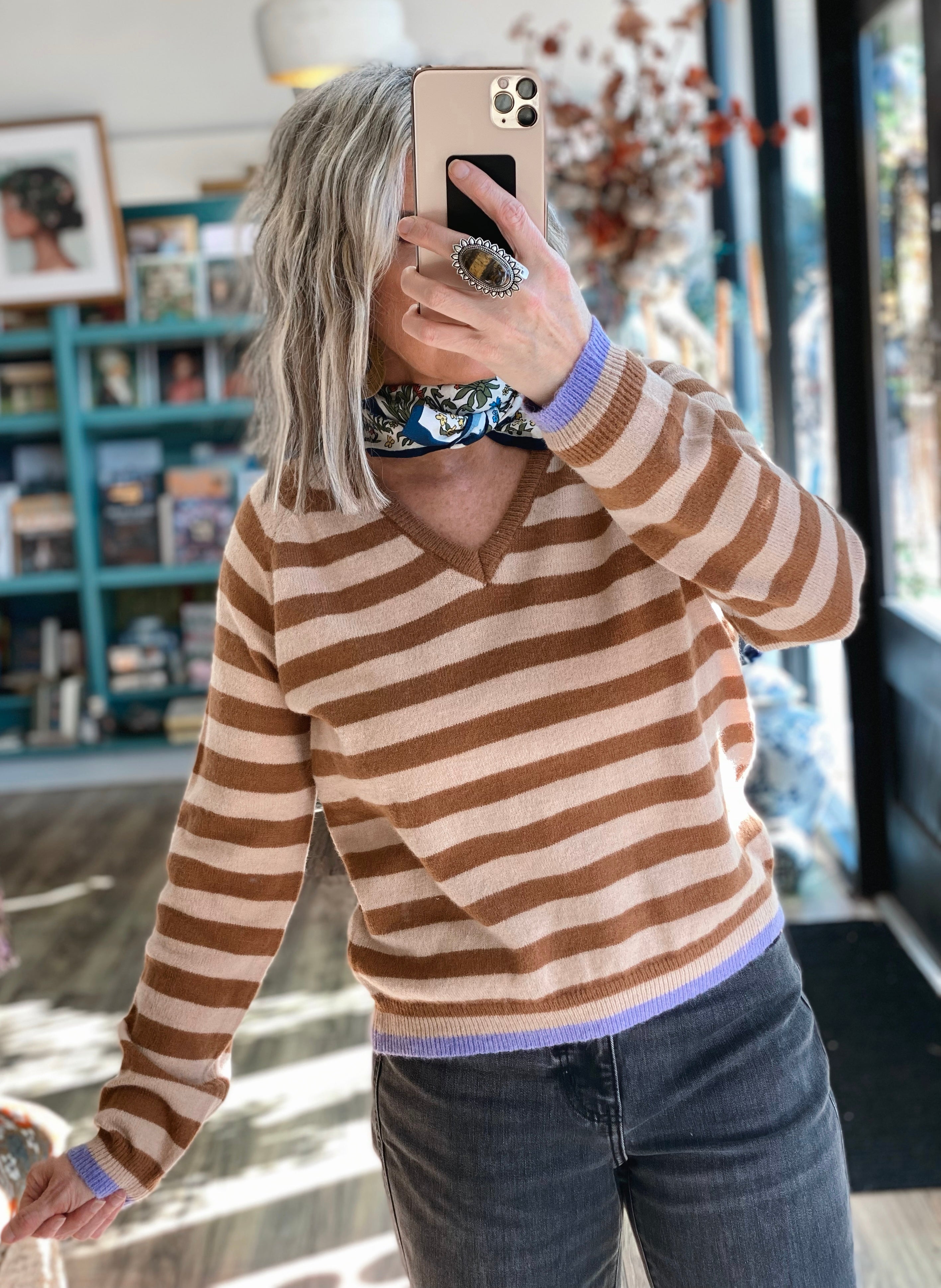 Classic stripes meet a playful pop of color in this soft, lightweight knit you’ll wear on repeat. Featuring warm camel and cream stripes with unexpected lavender trim at the cuffs and hem, this sweater blends timeless style with a modern twist.
