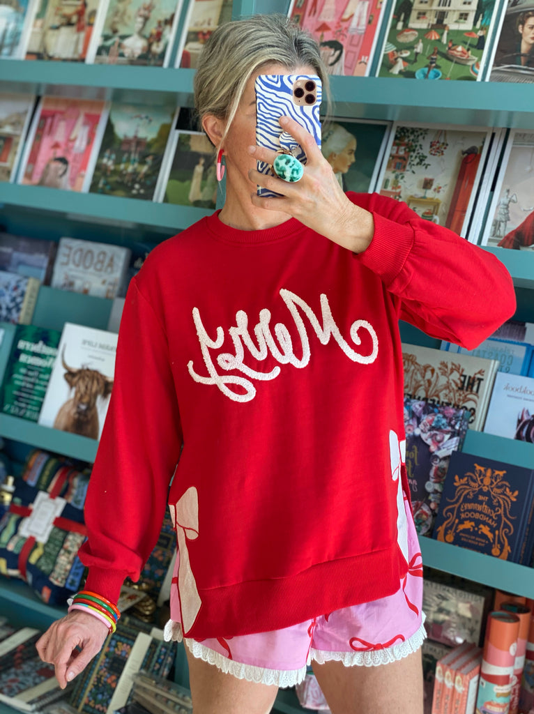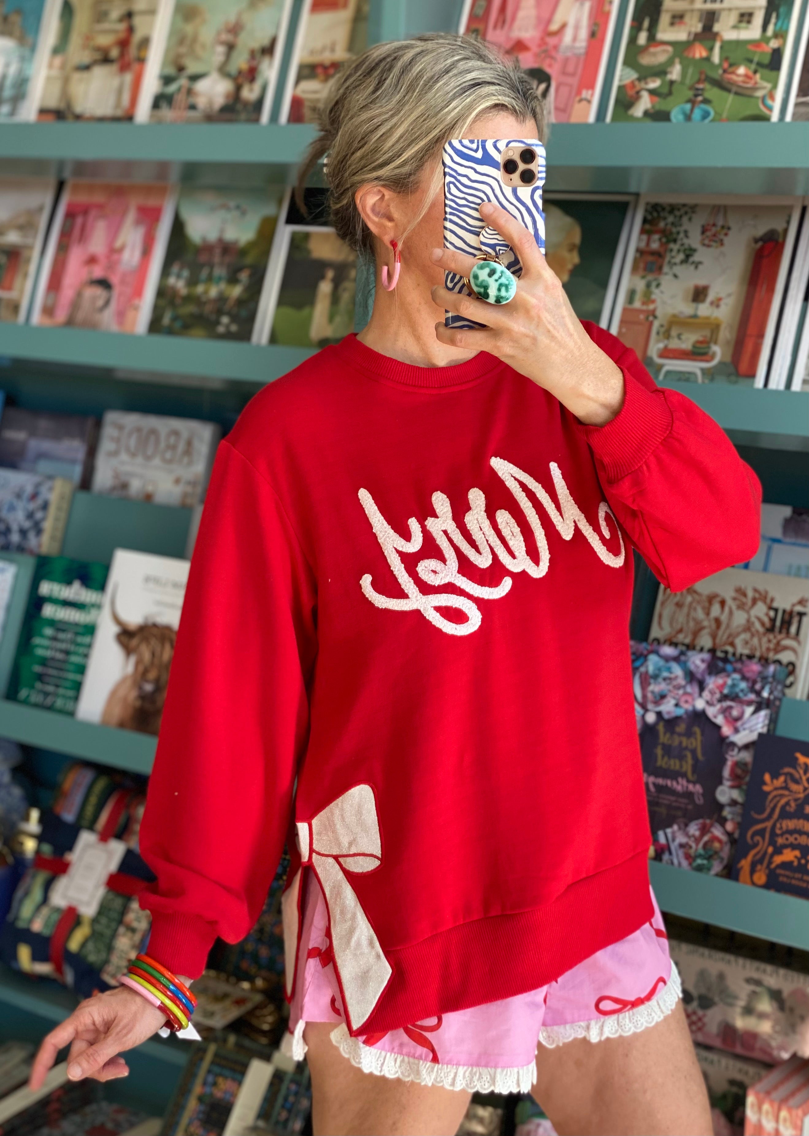 Spread holiday cheer in the Merry Bow Pullover. This festive piece is designed with side vents that feature a bow detail on each side.