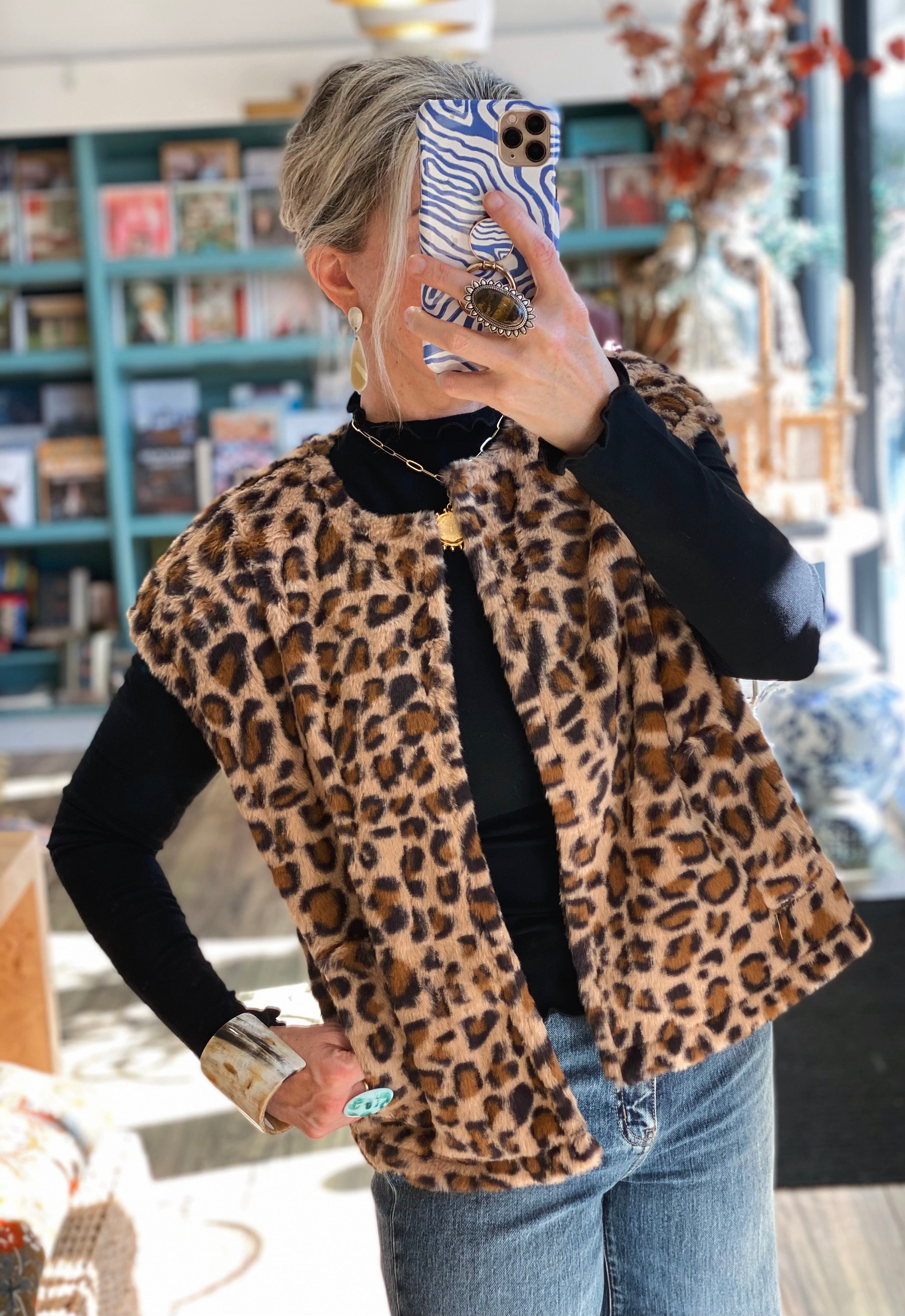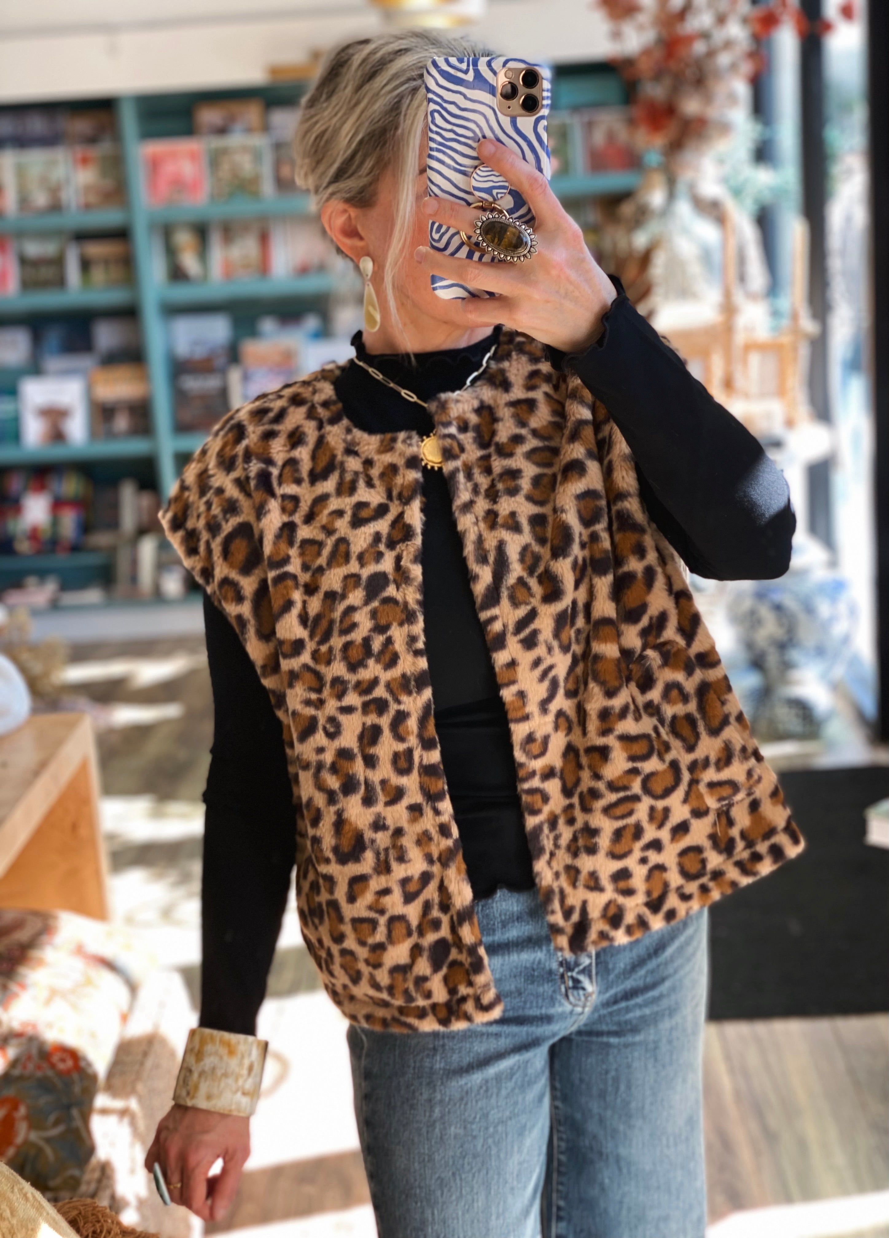 Make a bold, cozy statement with this plush leopard print faux fur vest — the ultimate layering piece for chic fall and winter style. Designed with an open front and a relaxed, boxy silhouette, it instantly elevates even the simplest outfit. The ultra-soft texture feels as luxurious as it looks, while side pockets add both function and comfort. Pair it with a sleek turtleneck and denim for daytime polish, or drape it over a black dress for a night out.