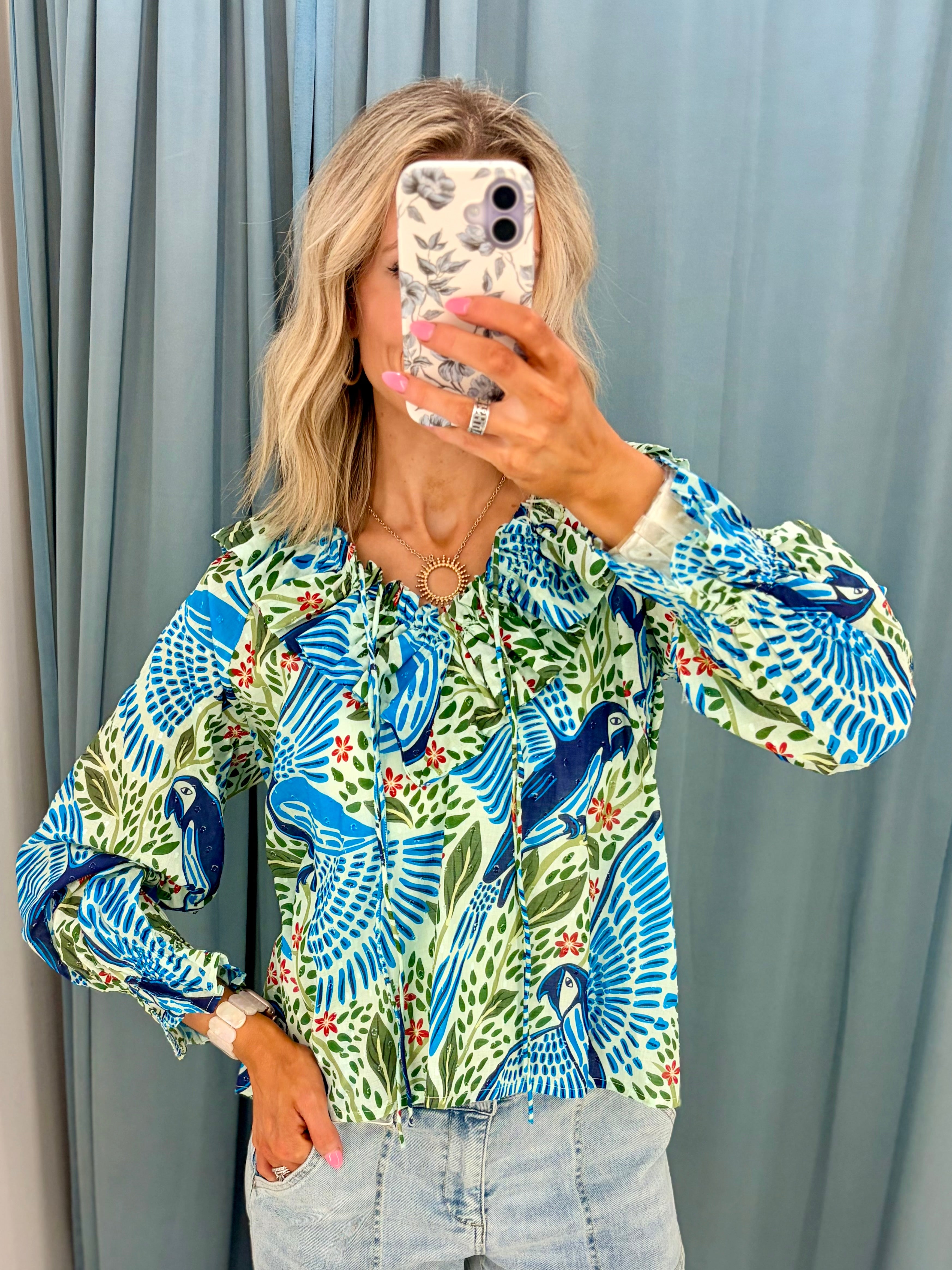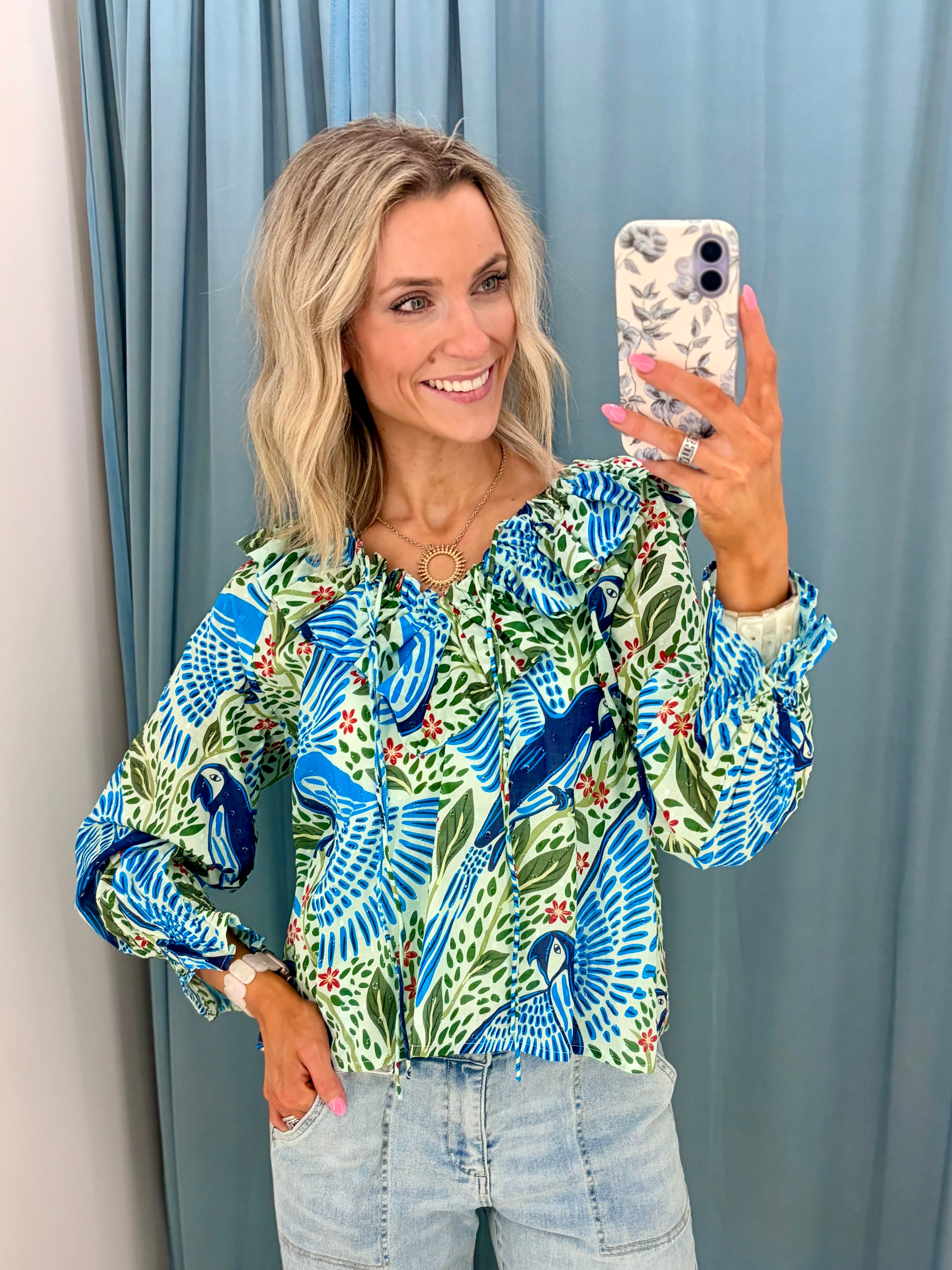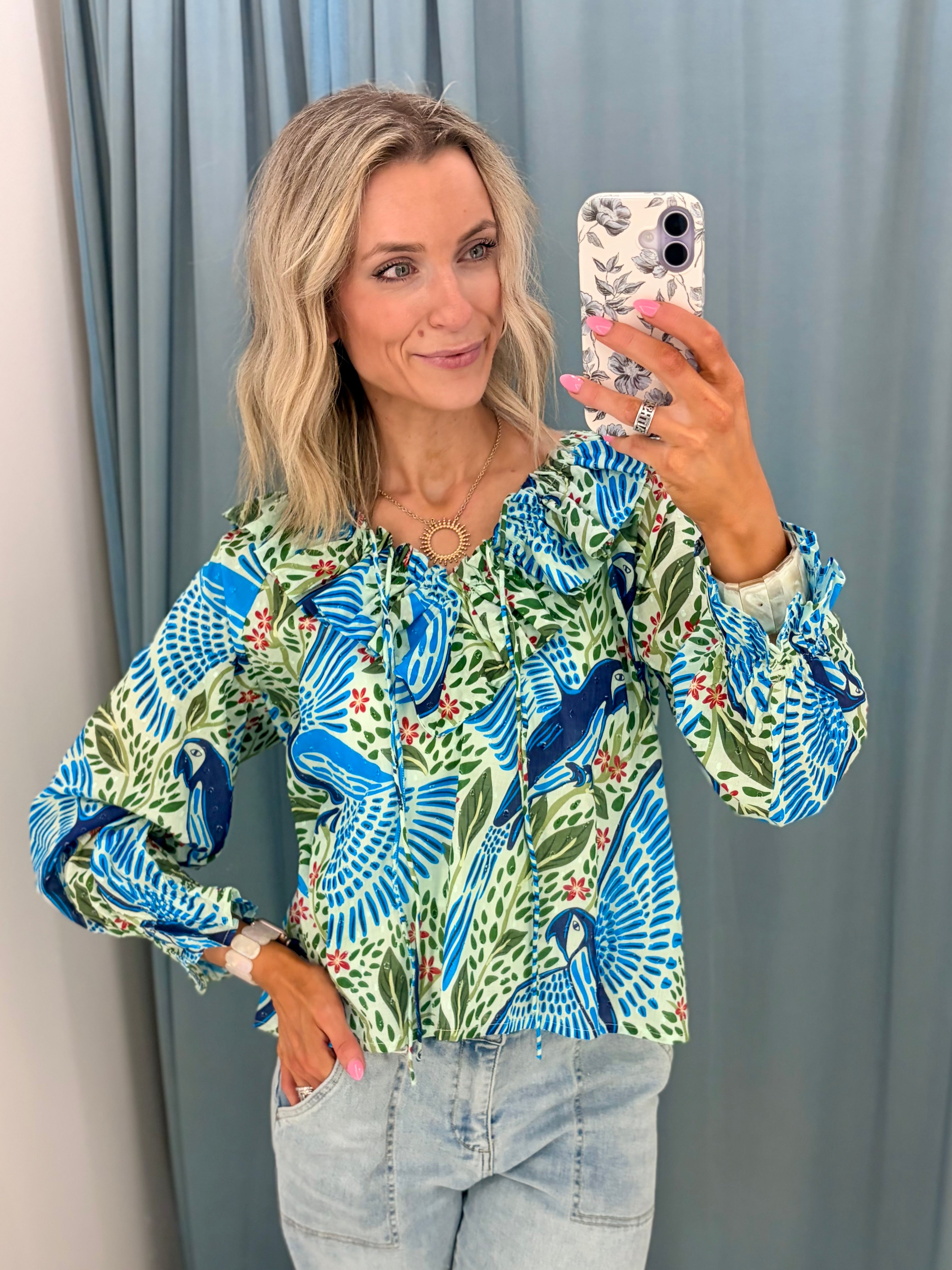 This top is bold, playful, and full of personality. The vibrant blue bird print paired with lush greenery makes it a true statement piece, while the ruffled neckline and tie detail add a soft, feminine touch. The relaxed fit and lightweight feel keep it easy and comfortable all day long.