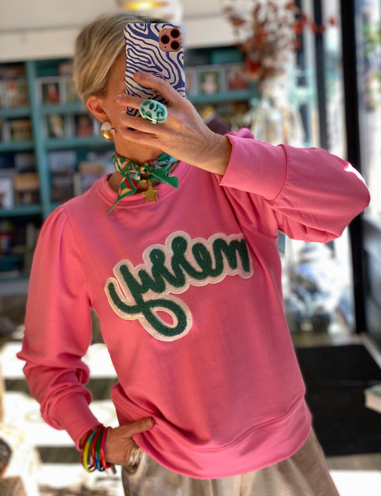 Spread holiday cheer in the Pink “Merry” Pullover, featuring exquisite bouclé embroidery with glitter applique backing. This festive piece is designed with a regular length and slightly pouf sleeves, combining playful elegance with contemporary flair.