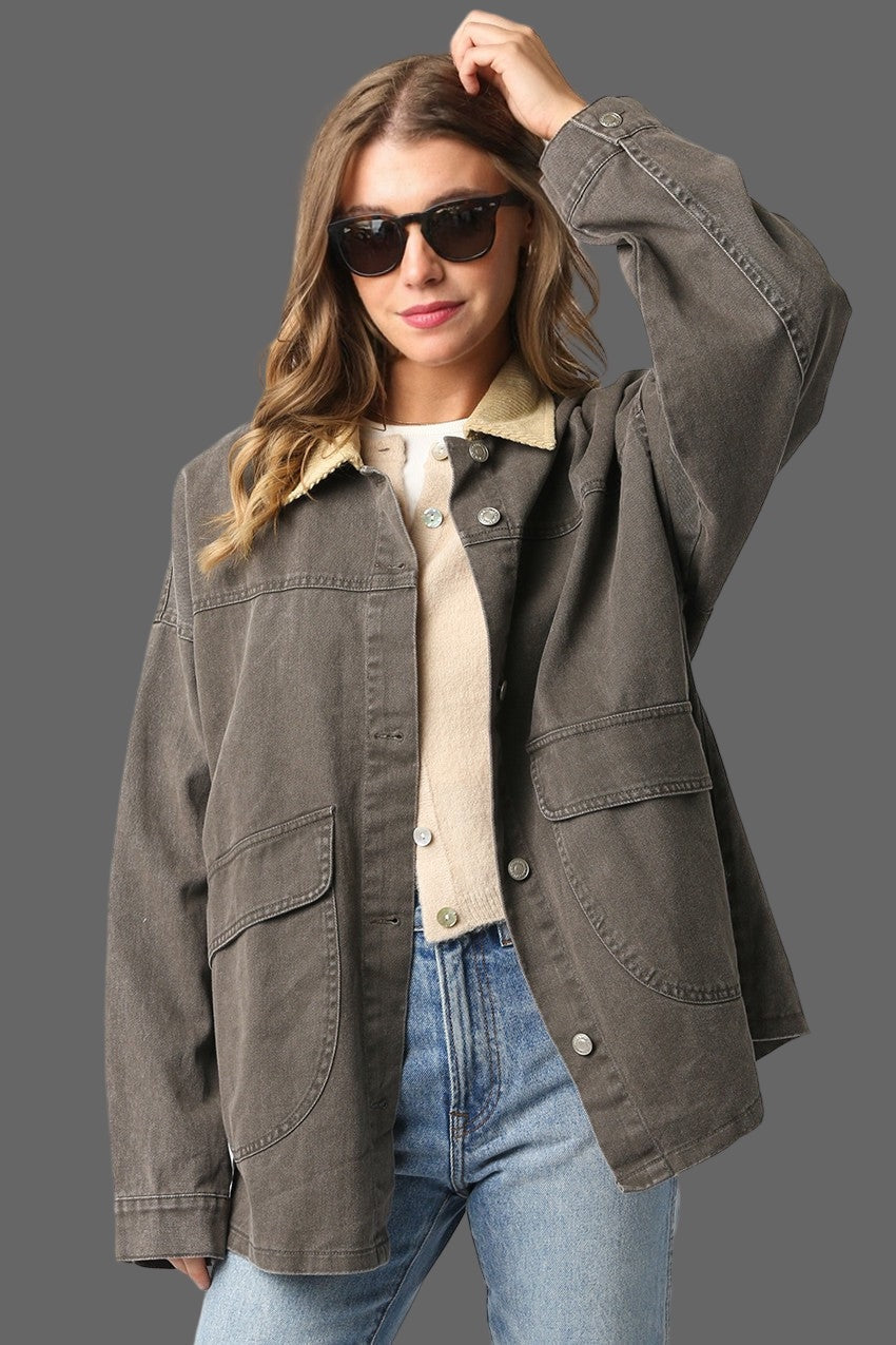 Crafted from durable washed cotton, it has that perfectly worn-in feel from day one, with a contrast corduroy collar that adds a touch of vintage outdoorsy appeal. Oversized front utility pockets, metal button closures, and a roomy, relaxed body give it that authentic workwear vibe — without sacrificing comfort or style.