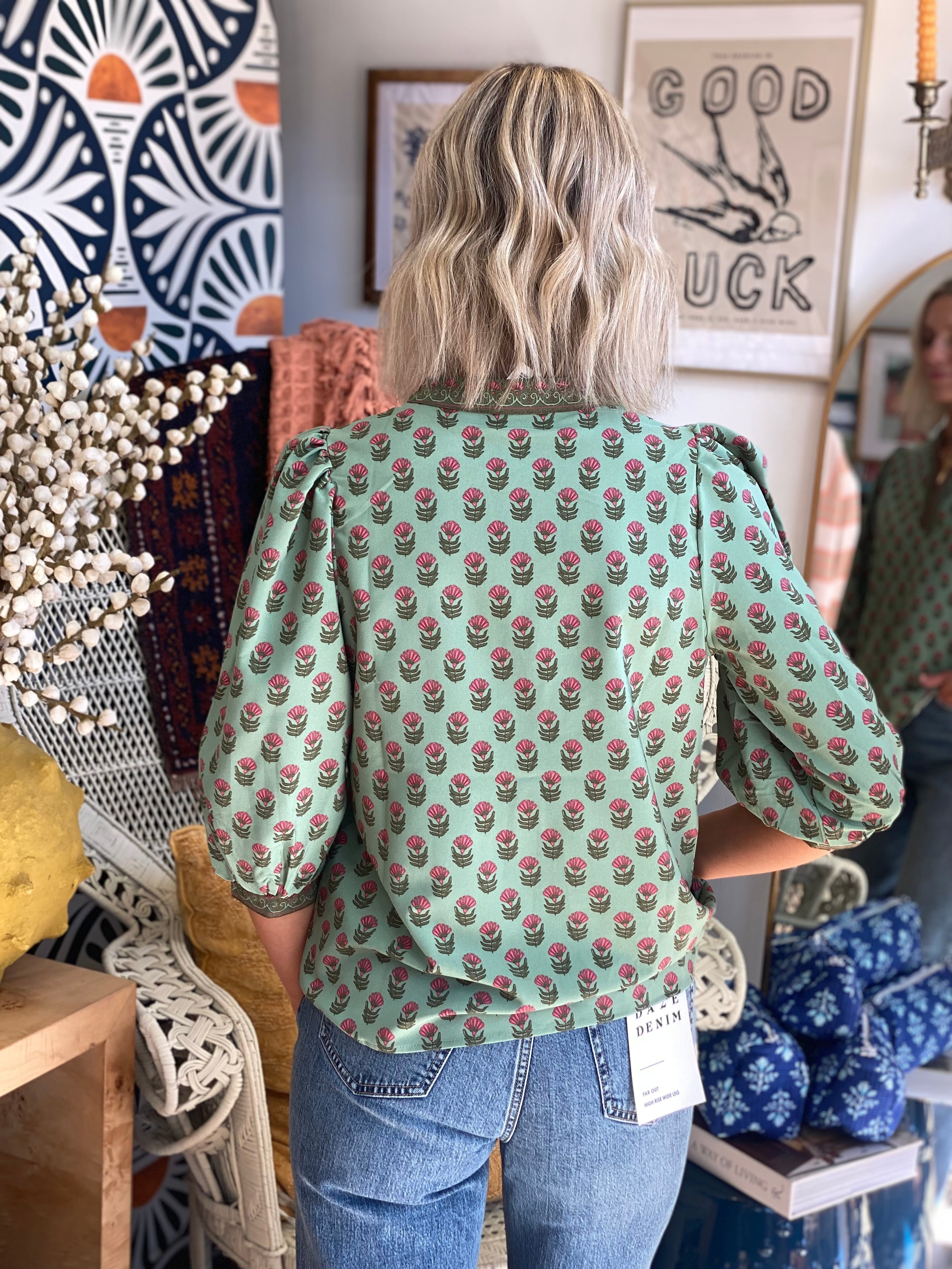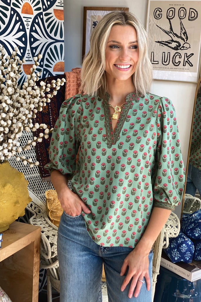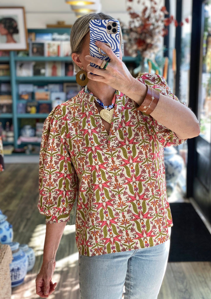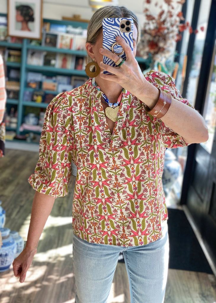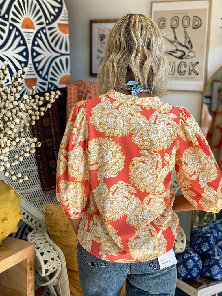 Bright, feminine, and effortlessly flattering — this lightweight poly crepe top is made to turn heads in every season. Designed with a relaxed fit and soft drape, it features a split neckline, subtle gathers at the shoulders, and three-quarter puff sleeves with elastic cuffs for an easy, polished silhouette.