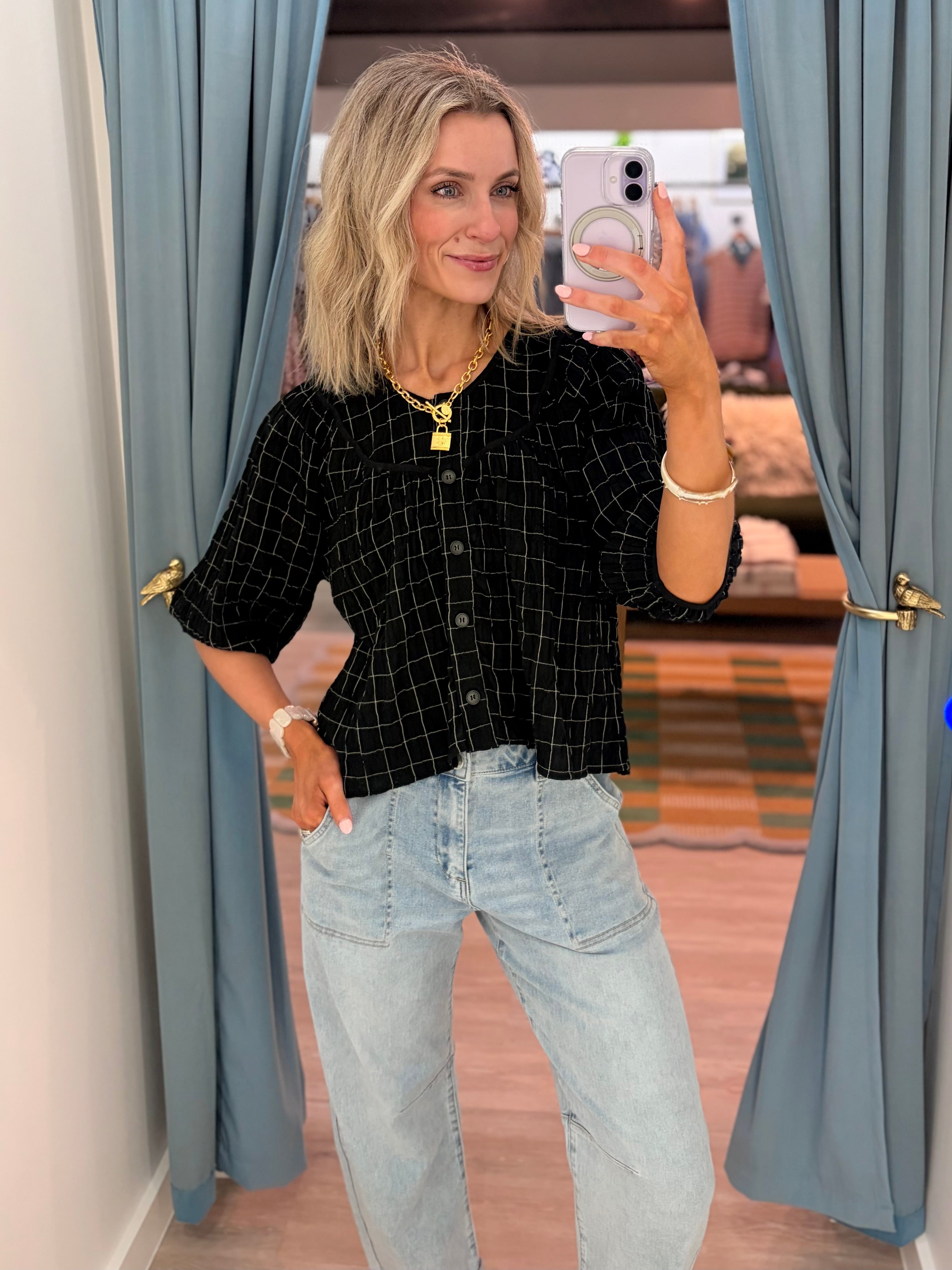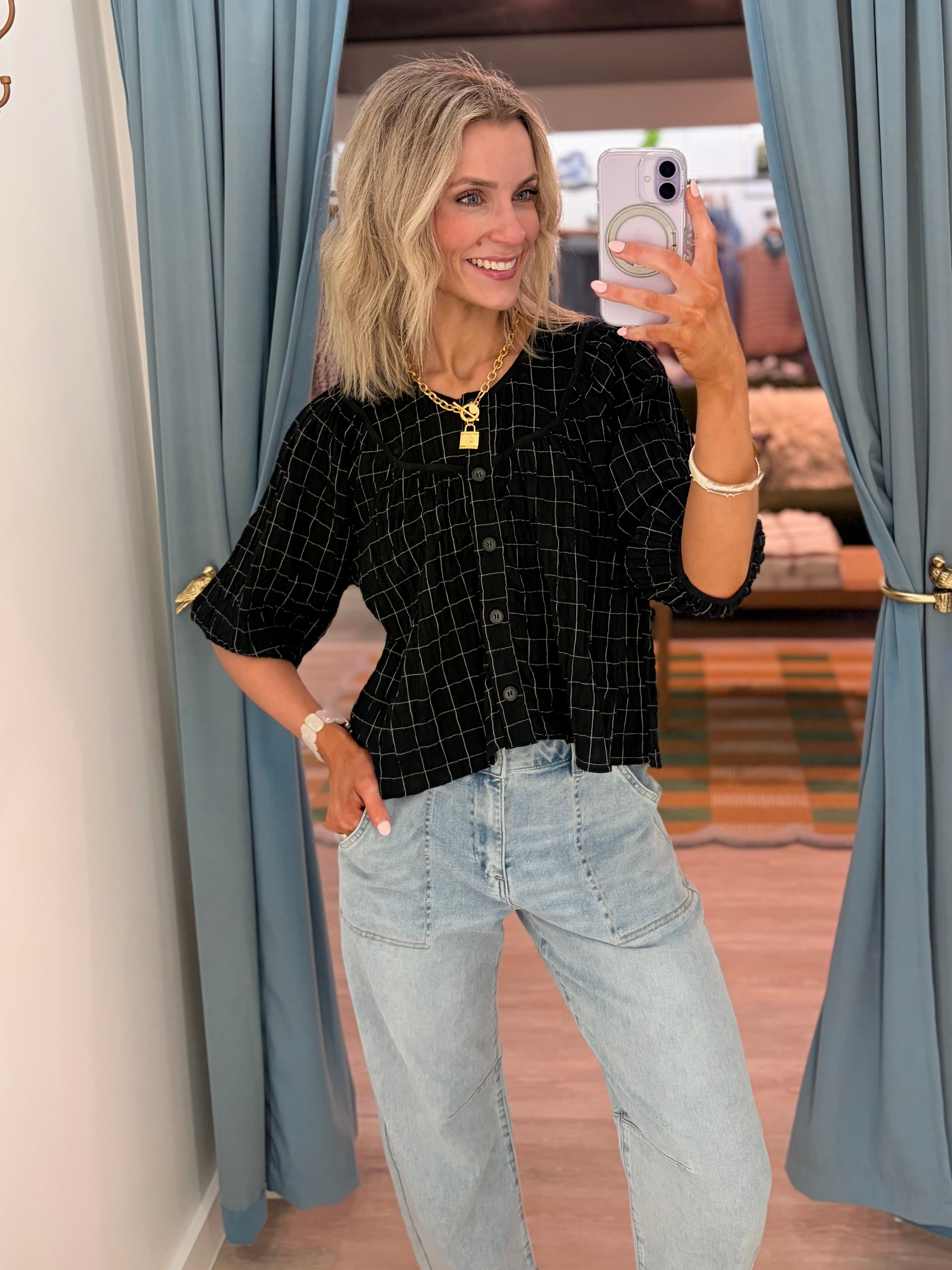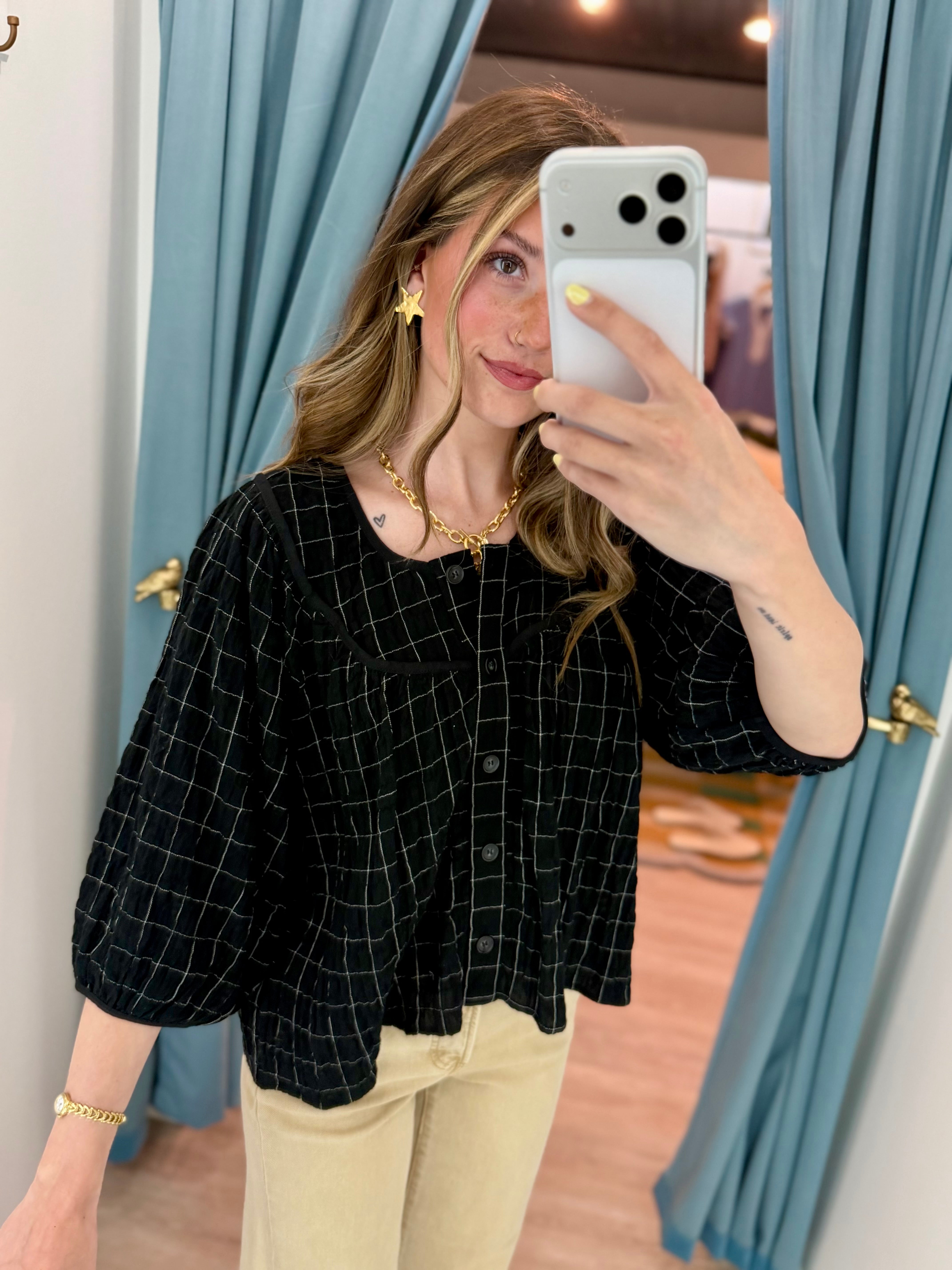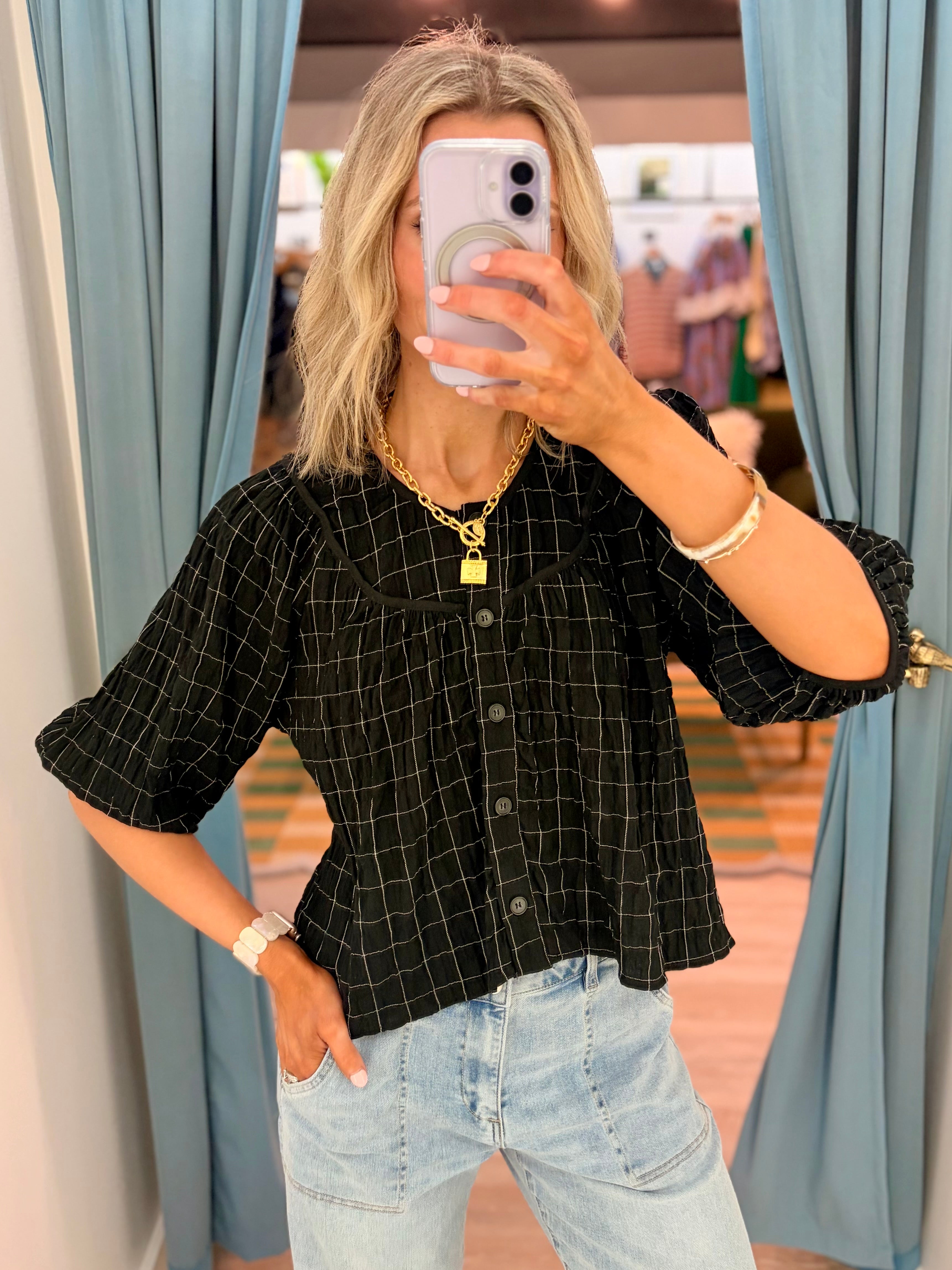Effortlessly polished with a hint of texture, this lightweight top is the perfect blend of classic and modern. Featuring a subtle grid pattern throughout, it’s designed with a relaxed, slightly cropped silhouette that pairs perfectly with high-rise denim. The button-front detail and softly structured sleeves add just the right amount of shape, while the airy fabric keeps it comfortable for all-day wear.