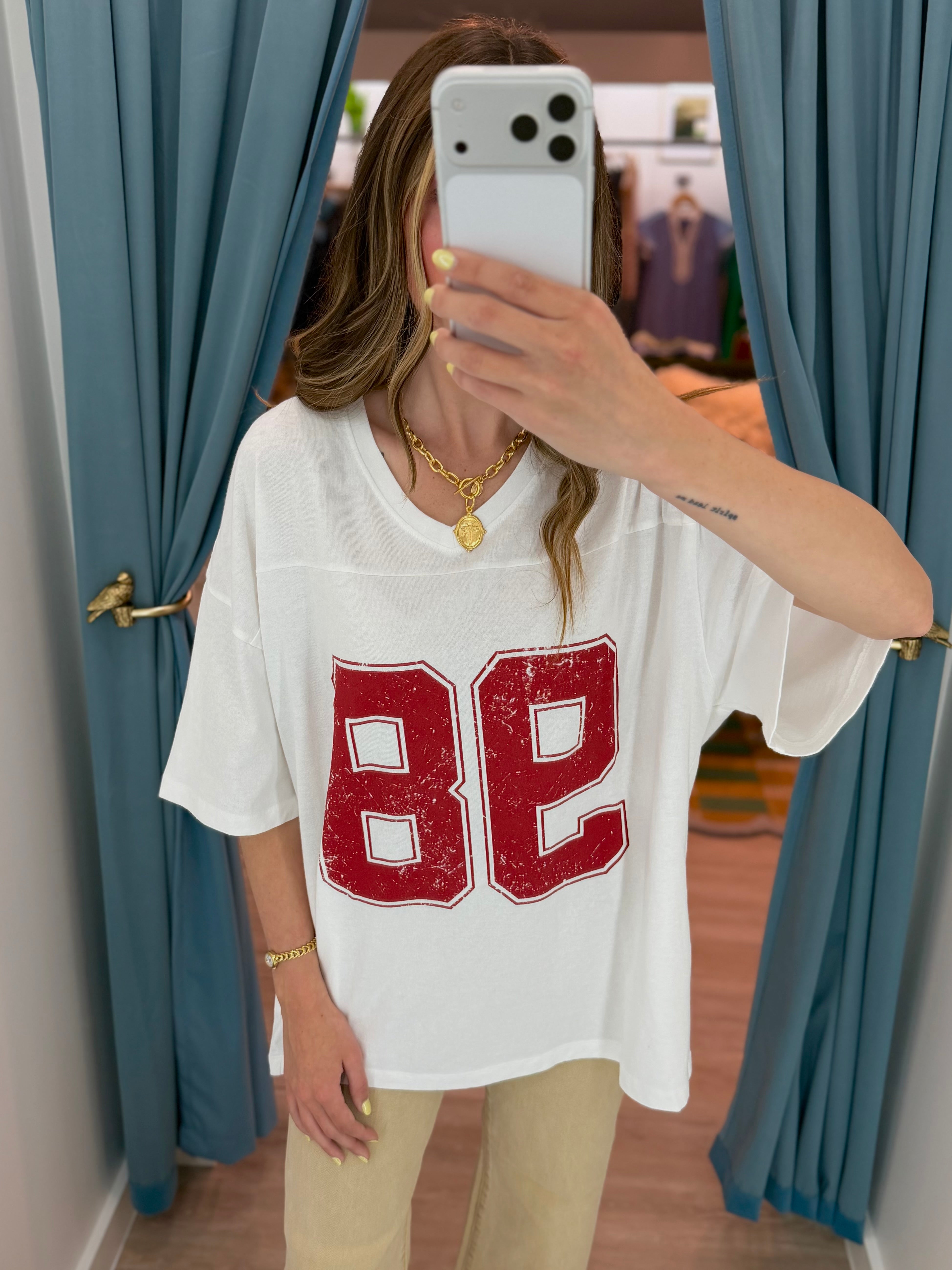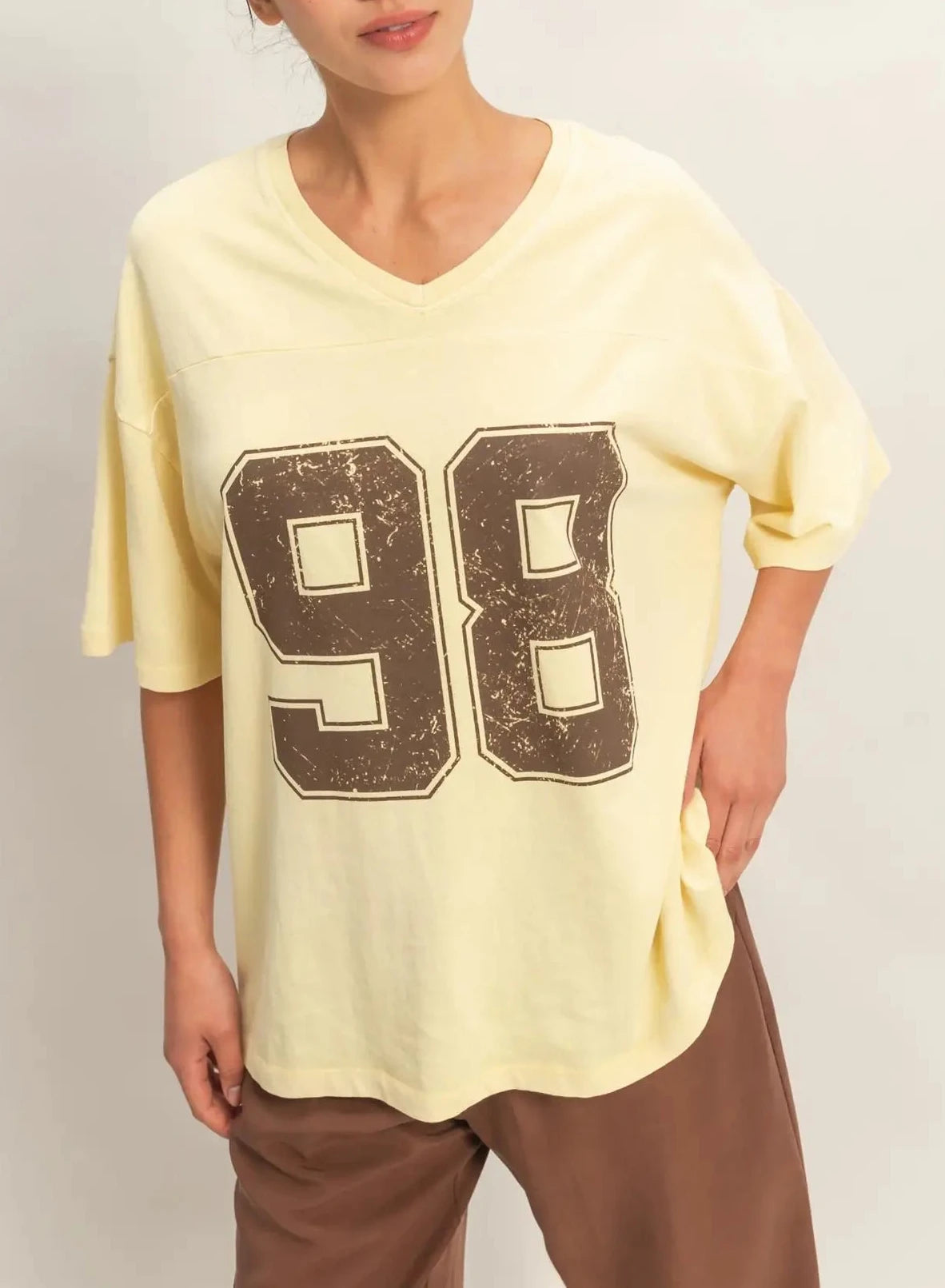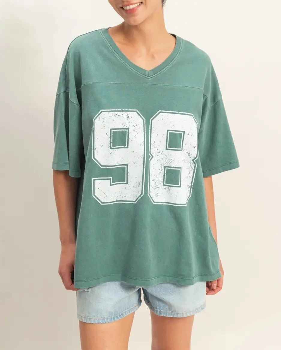 Channel varsity style with this pigment-dyed cotton tee. It highlights a ribbed V-neckline and structural chest yoke. The oversized fit features drop shoulders and a bold, distressed number graphic. Finished with a straight hem, pair with denim for a laid-back, athletic aesthetic.