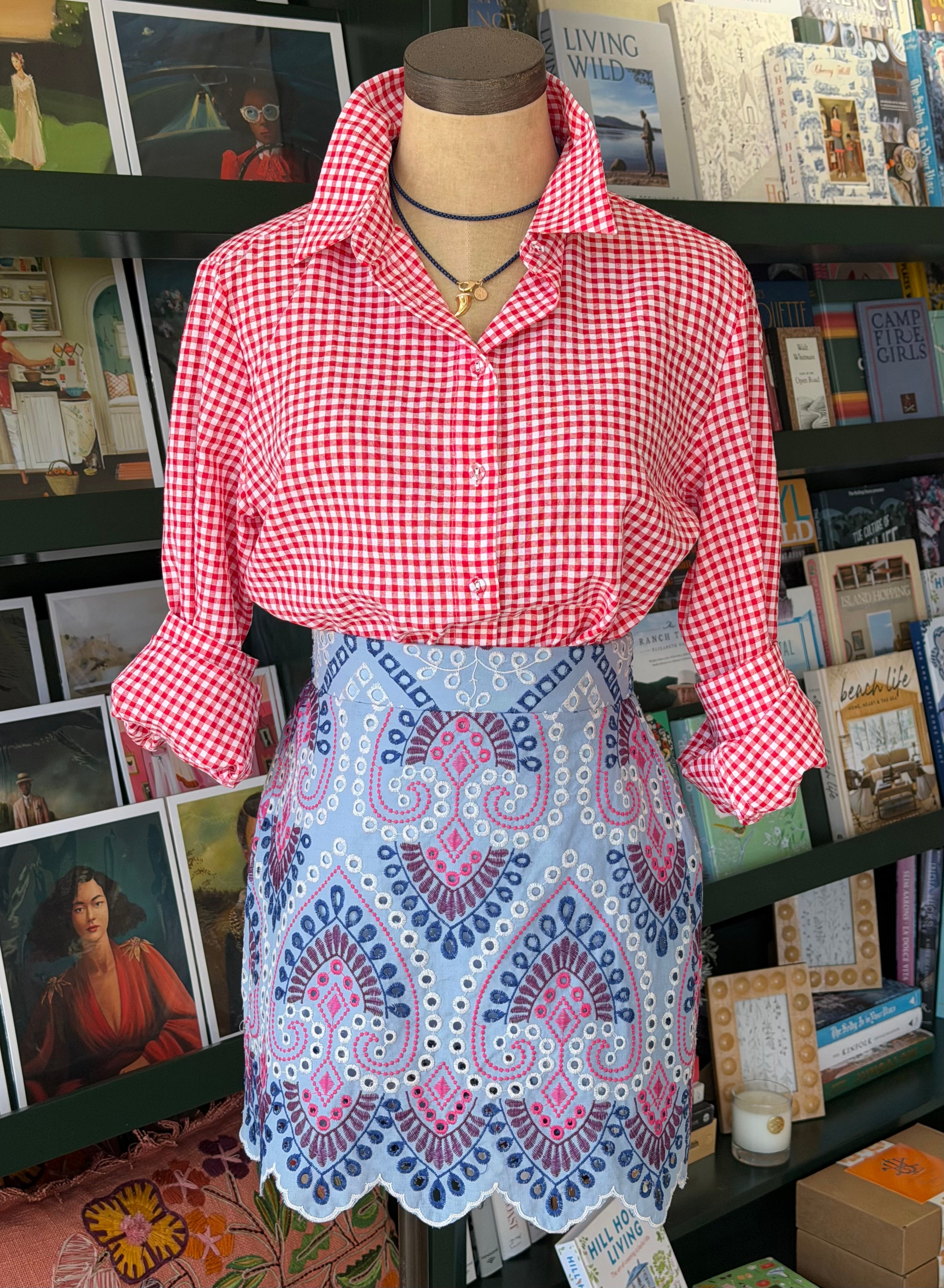 Timeless, crisp, and effortlessly versatile—this red gingham blouse is a wardrobe essential you’ll reach for again and again. Crafted from breathable cotton, it features a classic button-up front, a tailored collar, and a relaxed silhouette that drapes just right.
